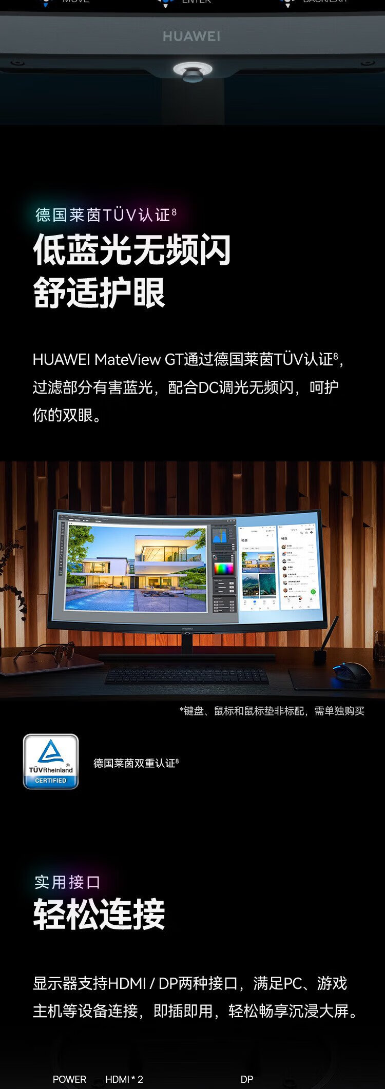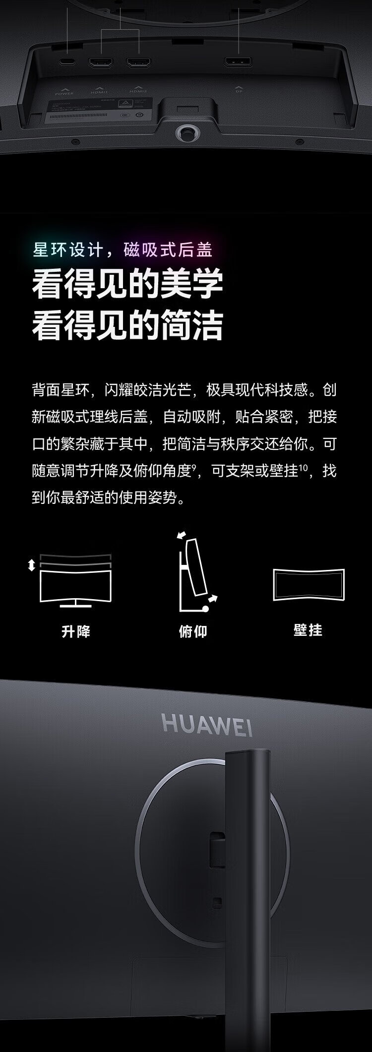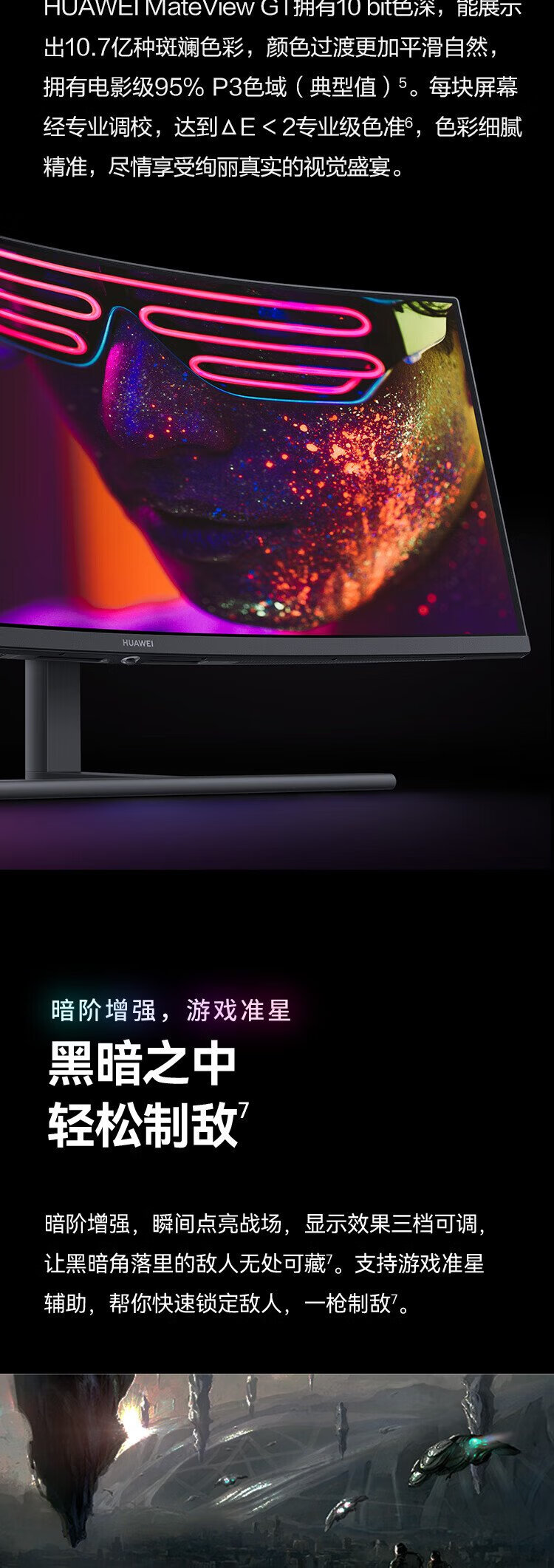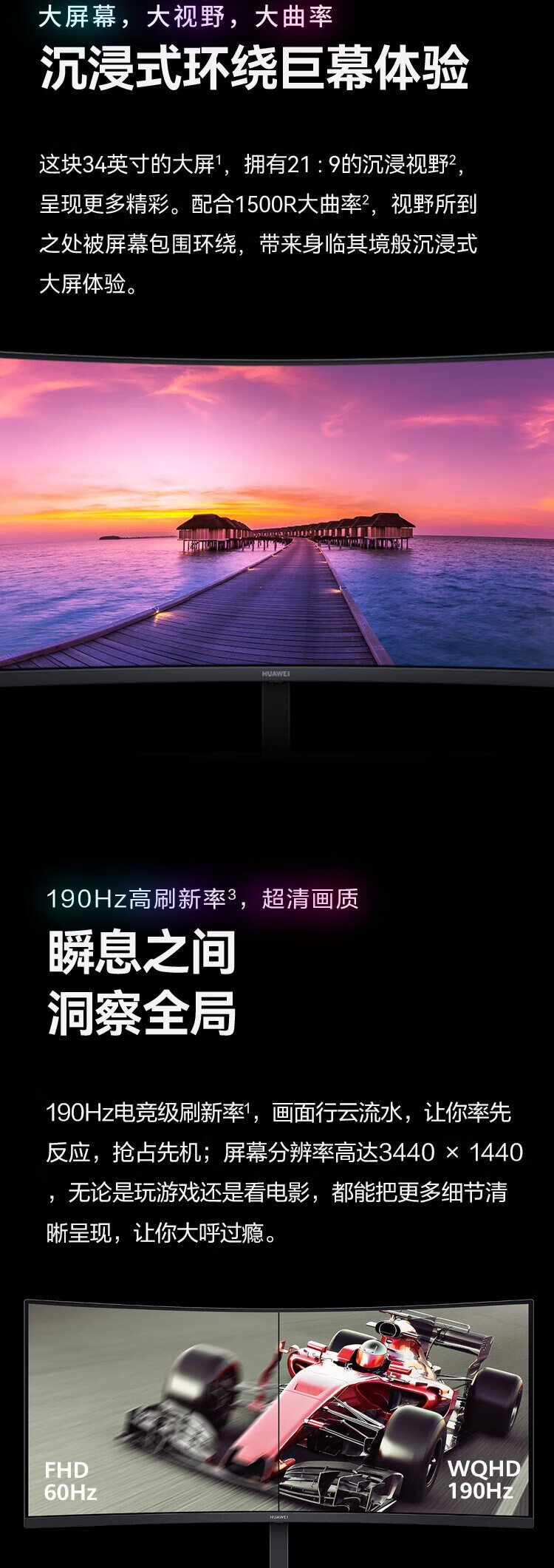 华为MateView GT 34英寸曲面显示器 WQHD 190Hz带鱼屏 快速液晶1ms 低蓝光无频闪 升降俯仰调节