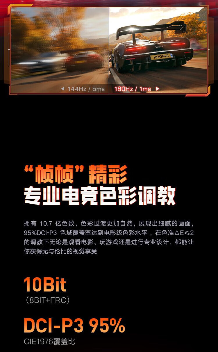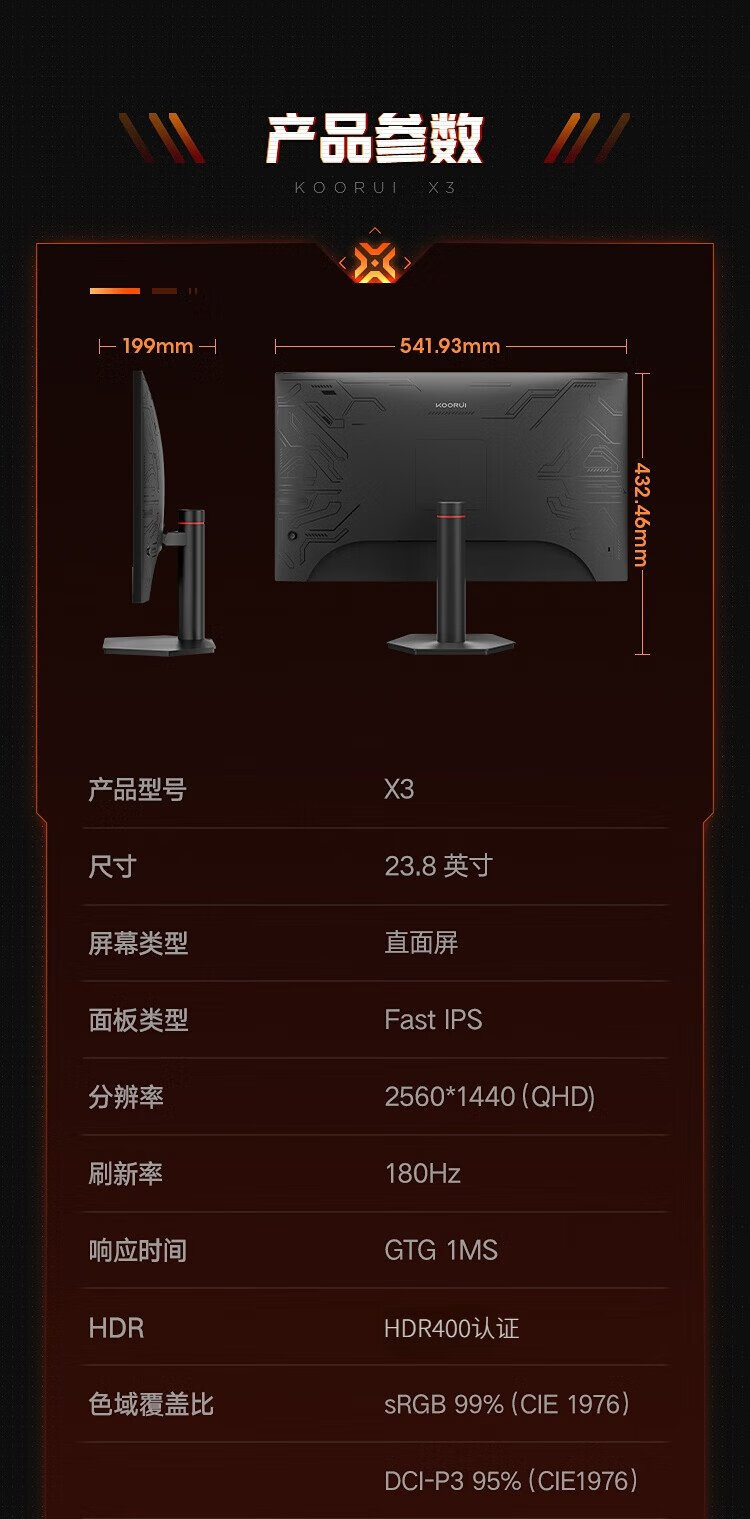 Écran FastIPS à haute brosse KOORUI 23,8 pouces 2K180 Hz, certification matérielle HDR400 à faible lumière bleue, bip rapide de 1 ms, écran Delta Gaming e-sports X3