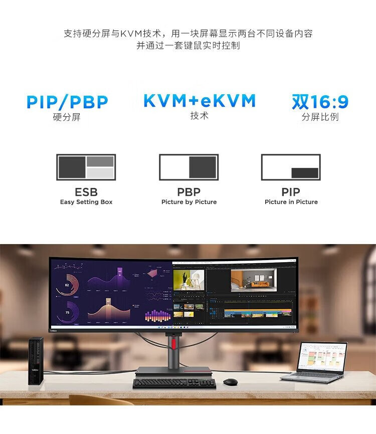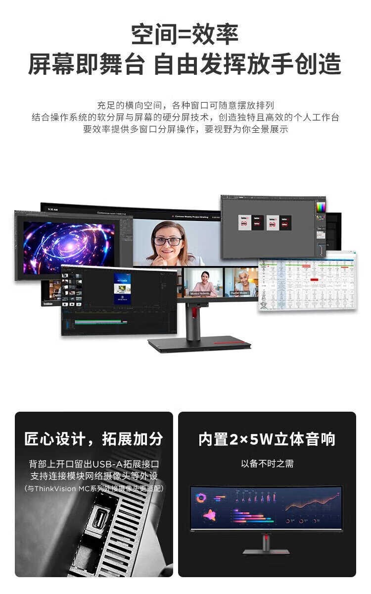 联想 49英寸显示器 32:9超宽曲面带鱼屏 双2K IPS-Black面板 HDR 雷电四接口 TUV硬件滤蓝光 智能分屏  电脑显示屏幕 P49w-30