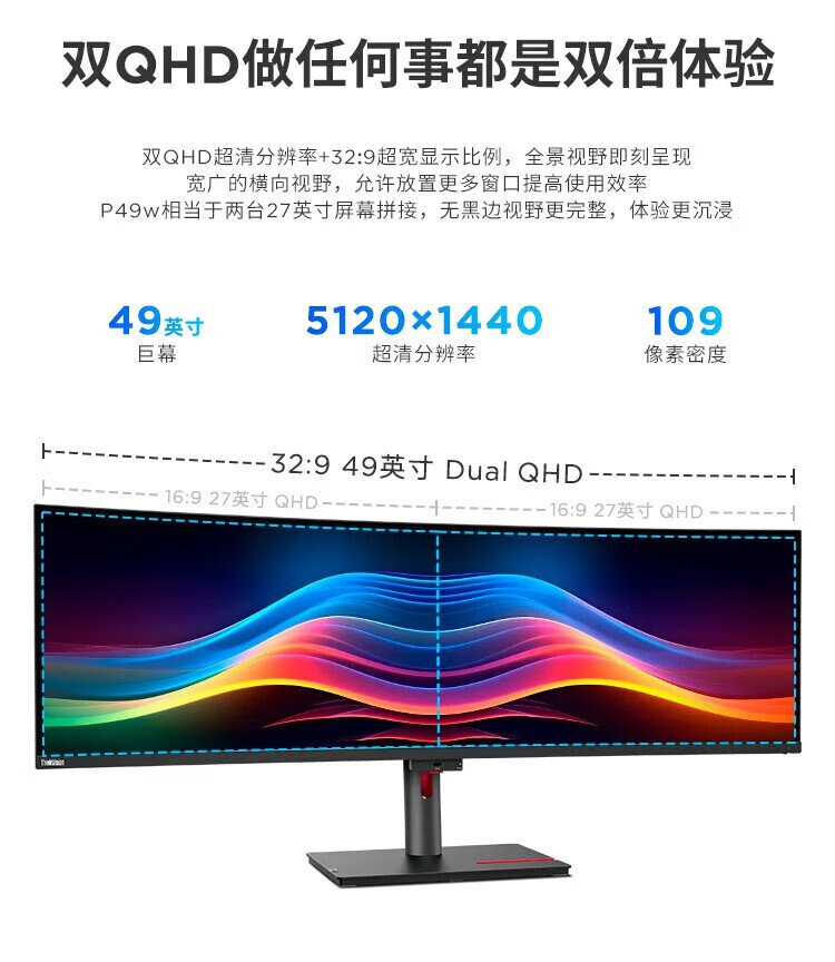 联想 49英寸显示器 32:9超宽曲面带鱼屏 双2K IPS-Black面板 HDR 雷电四接口 TUV硬件滤蓝光 智能分屏 电脑显示屏幕 P49w-30