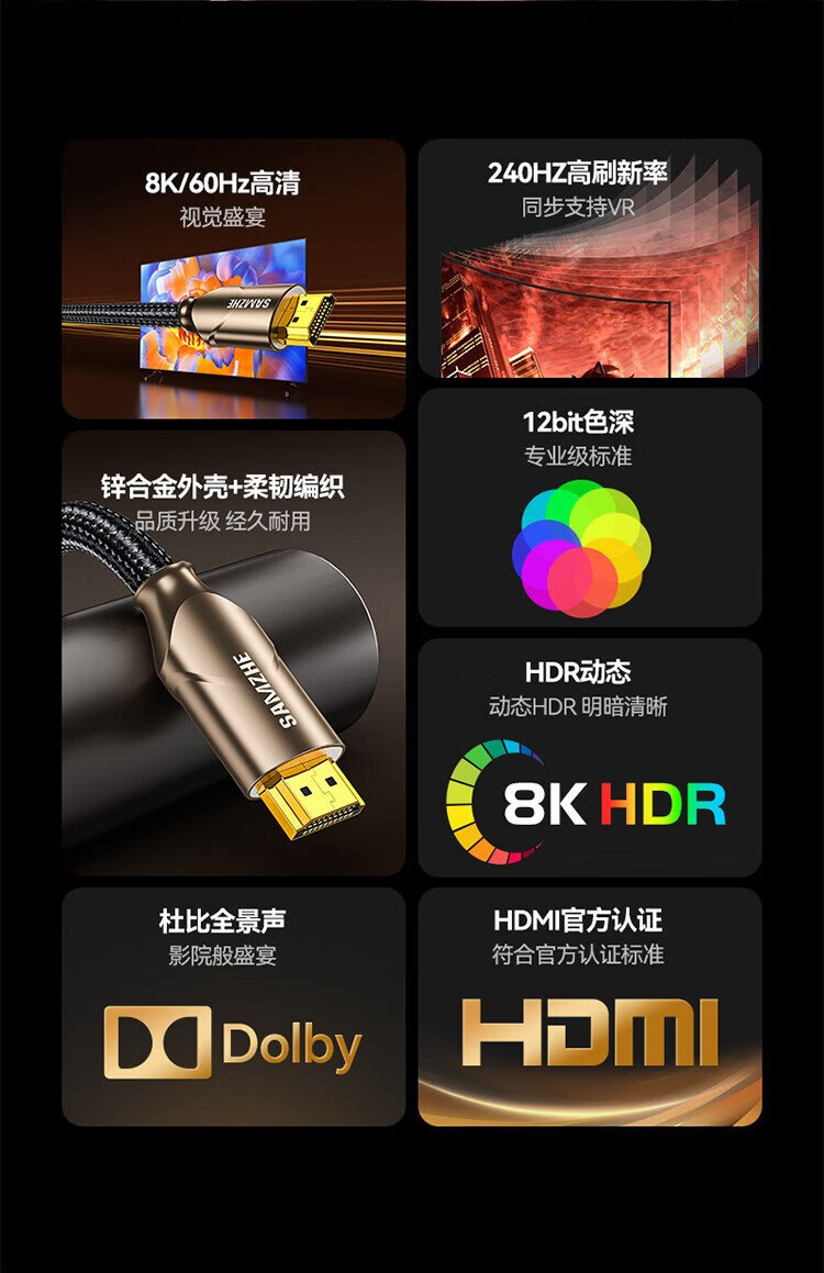 Shanze HDMI-Kabel Version 2.1 8K60Hz 4K240Hz Computer-Set-Top-Box zu TV-Monitor-Projektor High-Definition-Video-Verbindungskabel 3 Meter kompatibel mit HDMI2.0