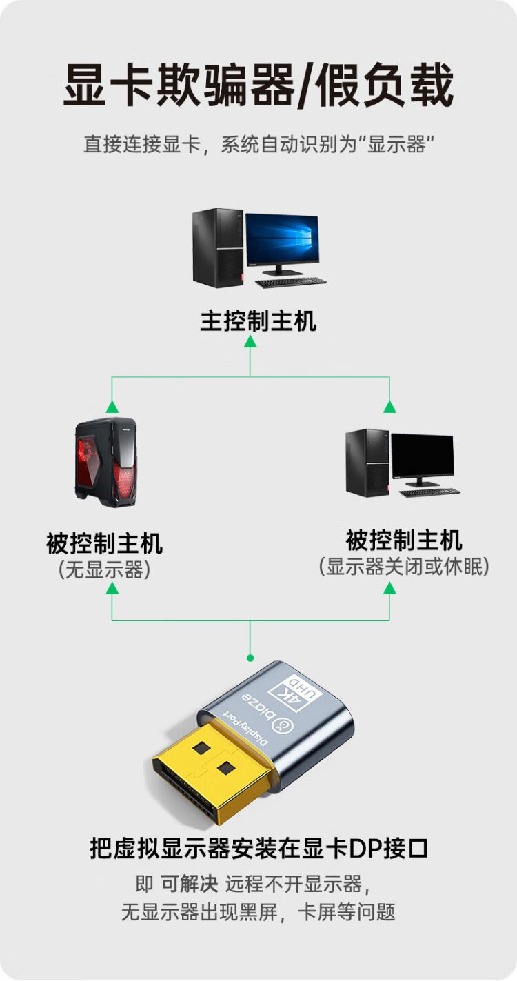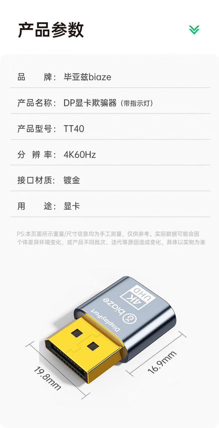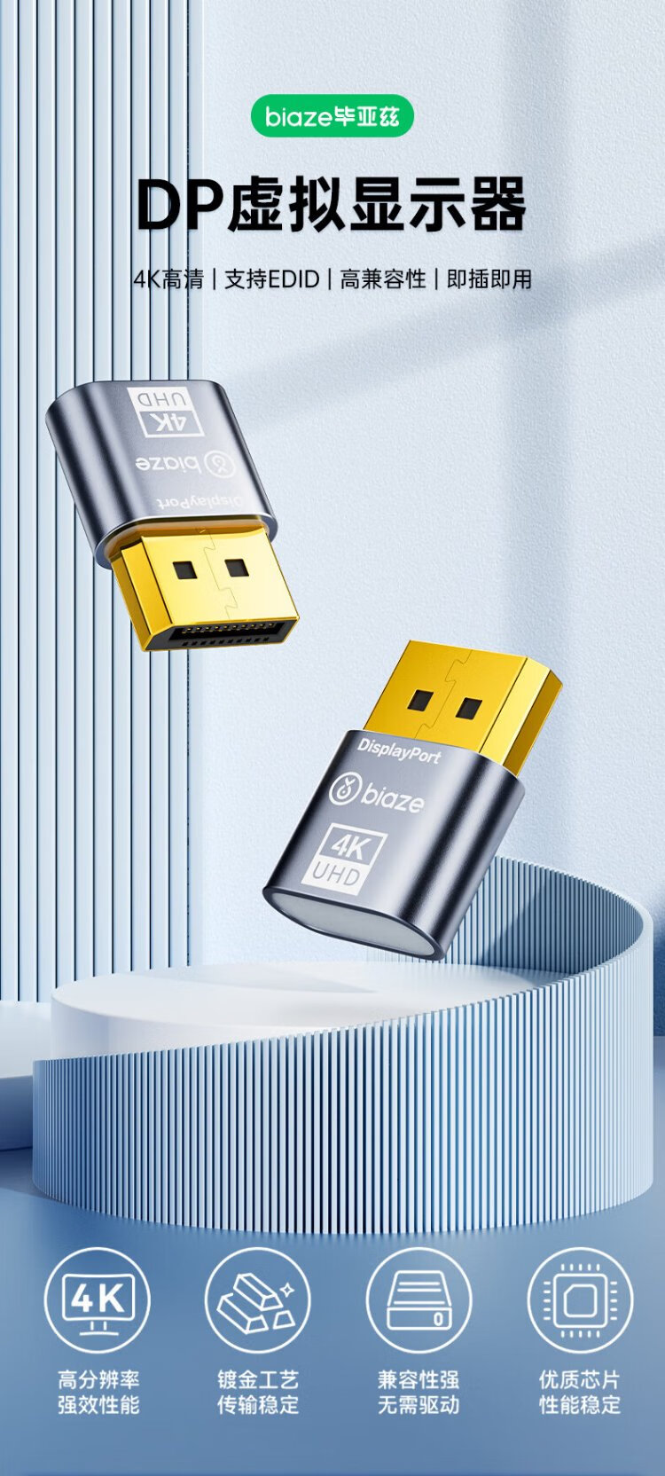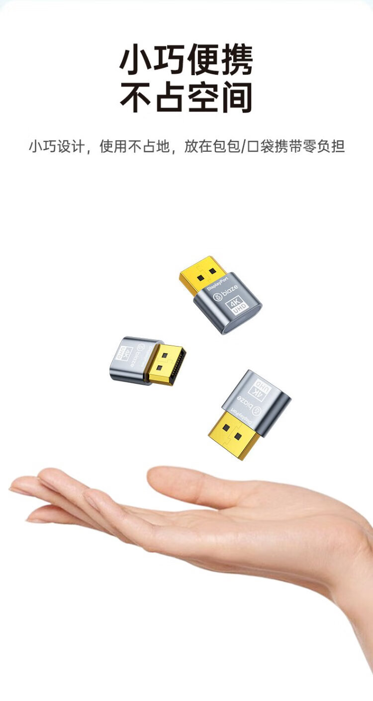 毕亚兹 DP诱骗器 显卡欺骗器DP虚拟器显卡 假负载远程4K输出远程控制挂机外接显示器 TT40