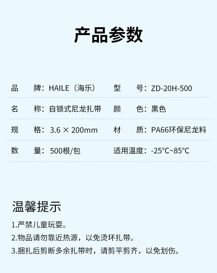 HAILE海乐尼龙扎带 多功能扎线带束线带 自锁式阻燃扎带 3.6*200mm 黑色500根ZD-20H-500