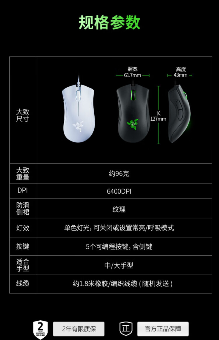 雷蛇(Razer)炼狱蝰蛇标准版有线鼠标 人体工学  电竞游戏 右手通用型 吃鸡/LOL/CS GO游戏鼠标 白色