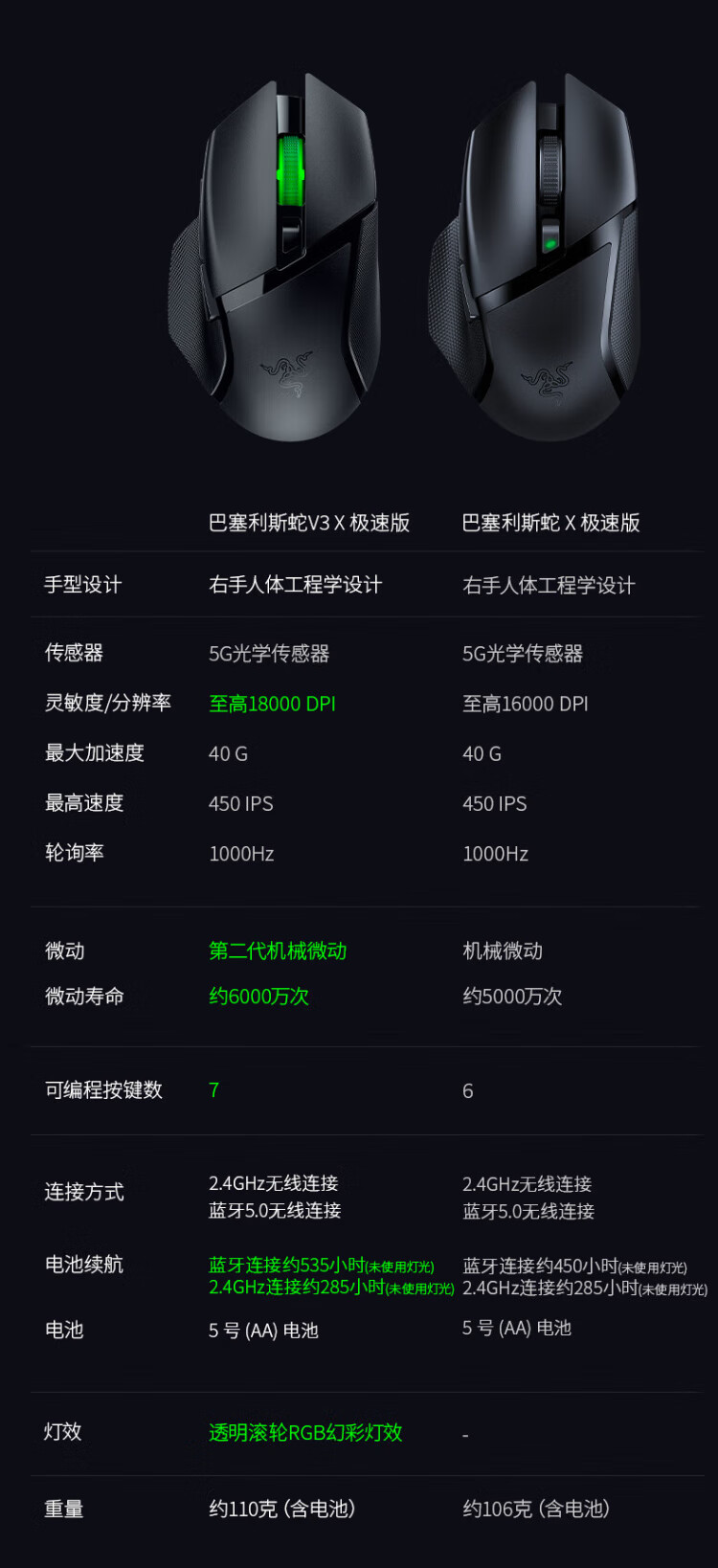 雷蛇(Razer)巴塞利斯蛇V3 X极速版 无线鼠标 小巴蛇  RGB幻彩灯效 吃鸡/LOL/CS GO电竞游戏鼠标
