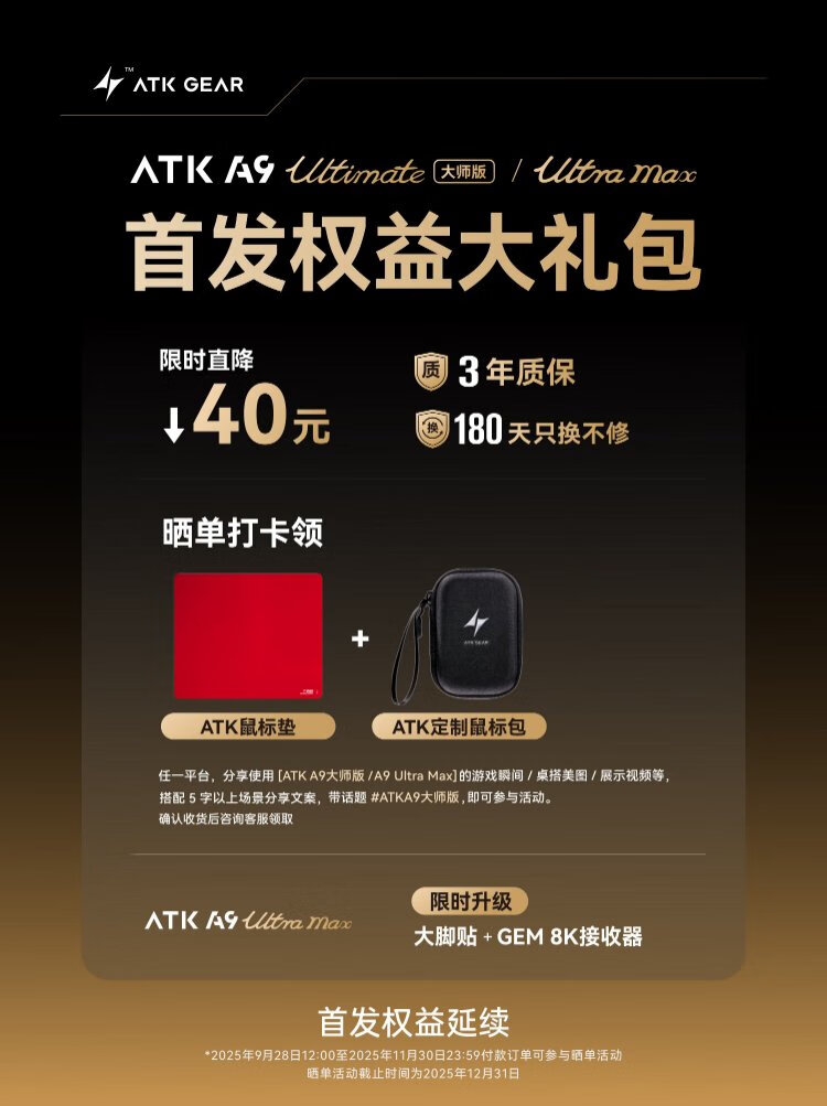 ATK蜻蜓A9无线鼠标电竞游戏办公鼠标 有线/2.4G双模连接轻量化对称极简工学 A9大师版朱红色