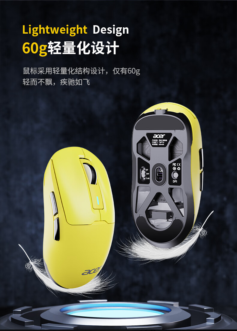 宏碁(acer) 无线蓝牙三模鼠标游戏电竞专用办公有线笔记本电脑通用可充电式轻量化设计人体工学宏定义 高雅白【游戏三模+60g超轻+仿生骨架结构】