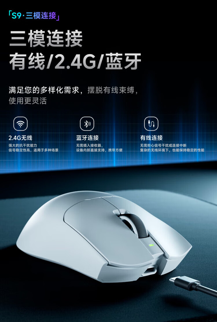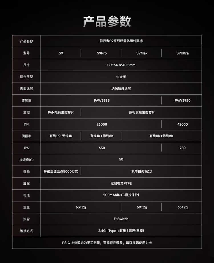 前行者S9Pro/Ultra有线无线鼠标蓝牙三模轻量化游戏PAW3950/3395电竞8K回报率笔记本台式电脑中大手专用 S9Pro赤焰红-3395+凯华白刃+8K回报率