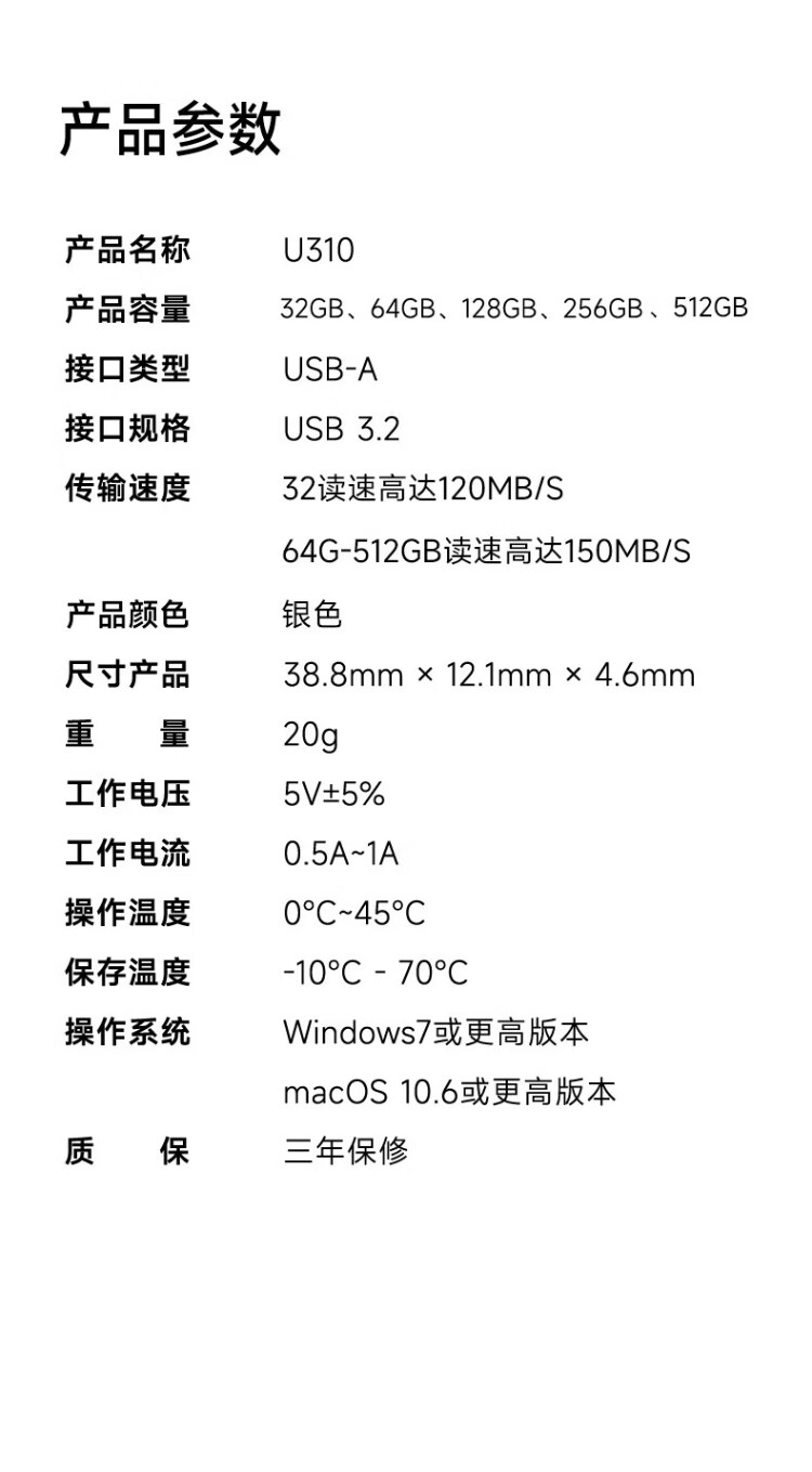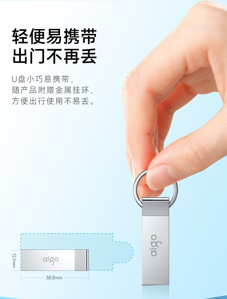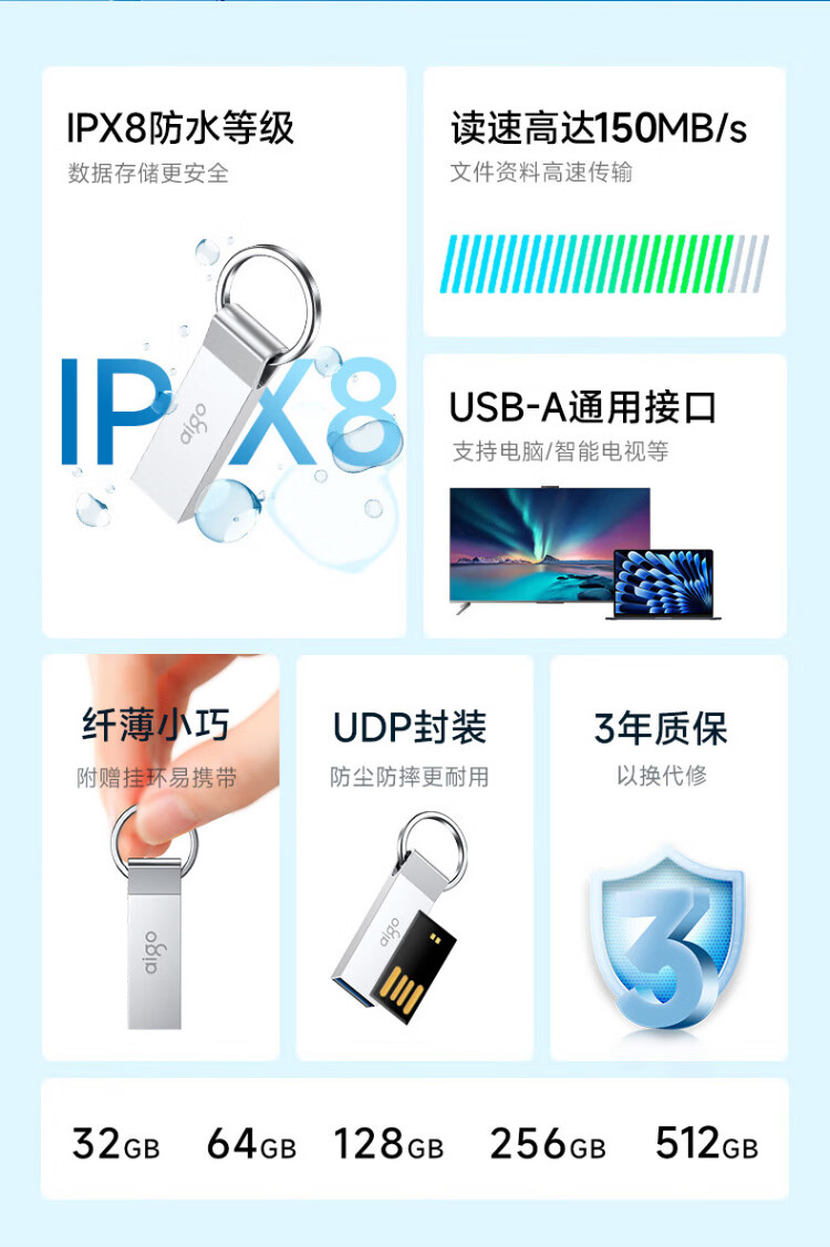 爱国者(aigo)64GB USB3.2 U盘 U310 读速150MB/s 高速大容量电脑办公u盘 系统存储优盘 金属便携U盘