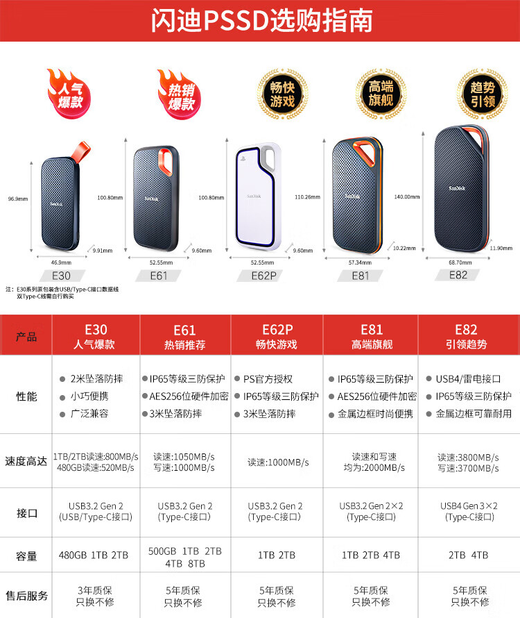 闪迪(SanDisk)2TB Type-c USB3.2移动固态硬盘(PSSD)E30高速 移动SSD 读速800MB/s 兼容手机笔记本电脑