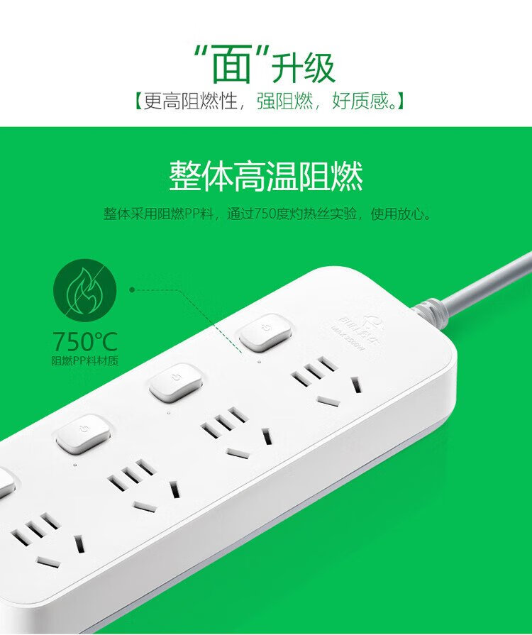 BULL sub-control socket/socket board/socket strip/socket strip/socket board/dormitory home desktop drag strip 3C certification 4-position sub-control total length 1.8 meters independent switch