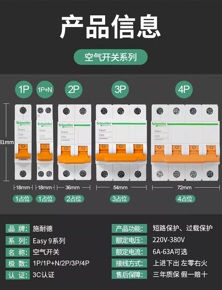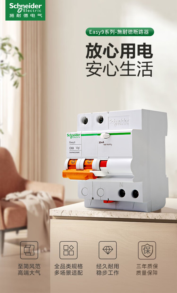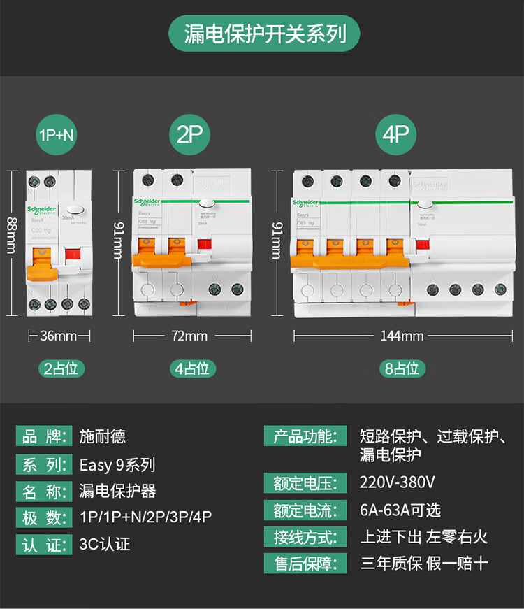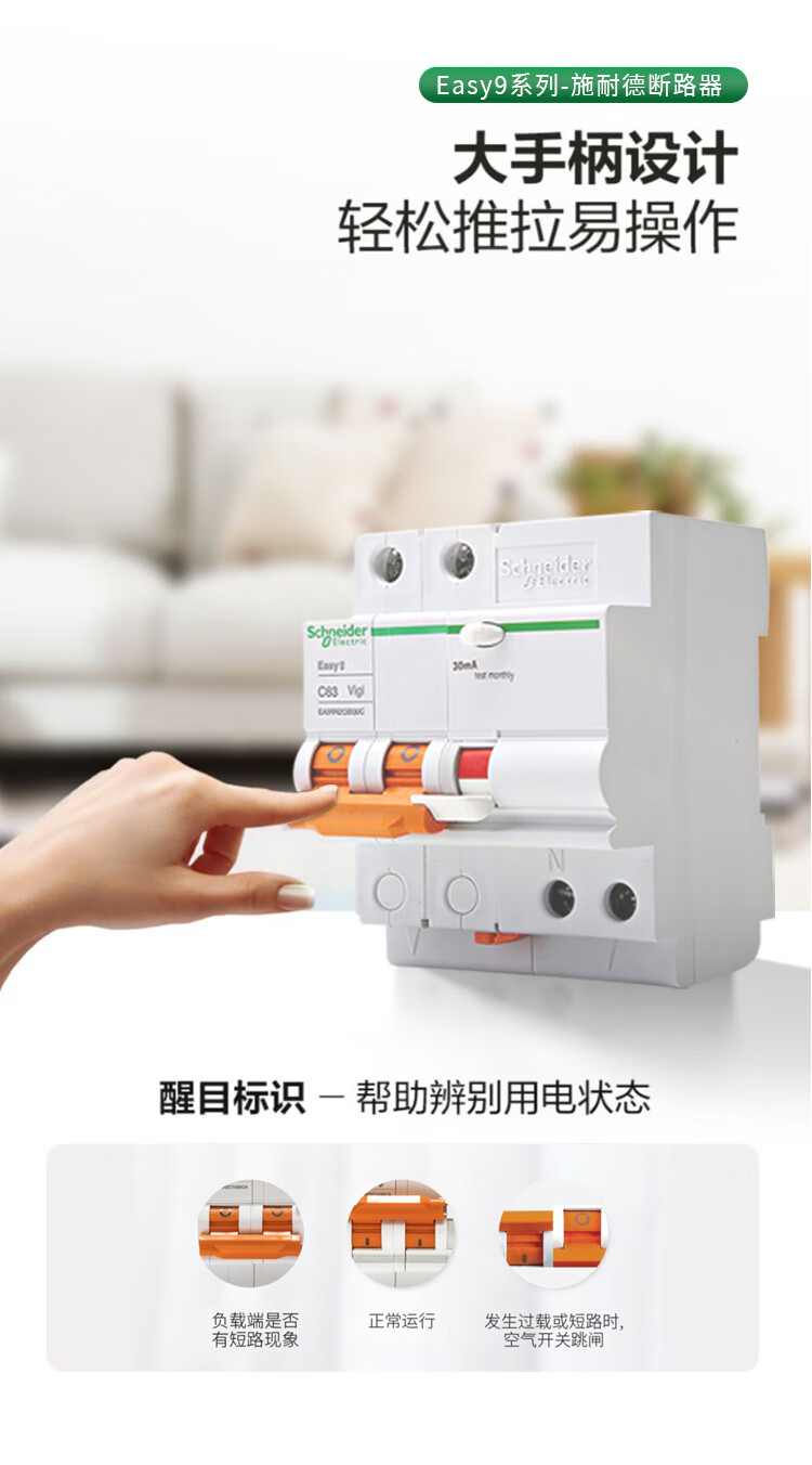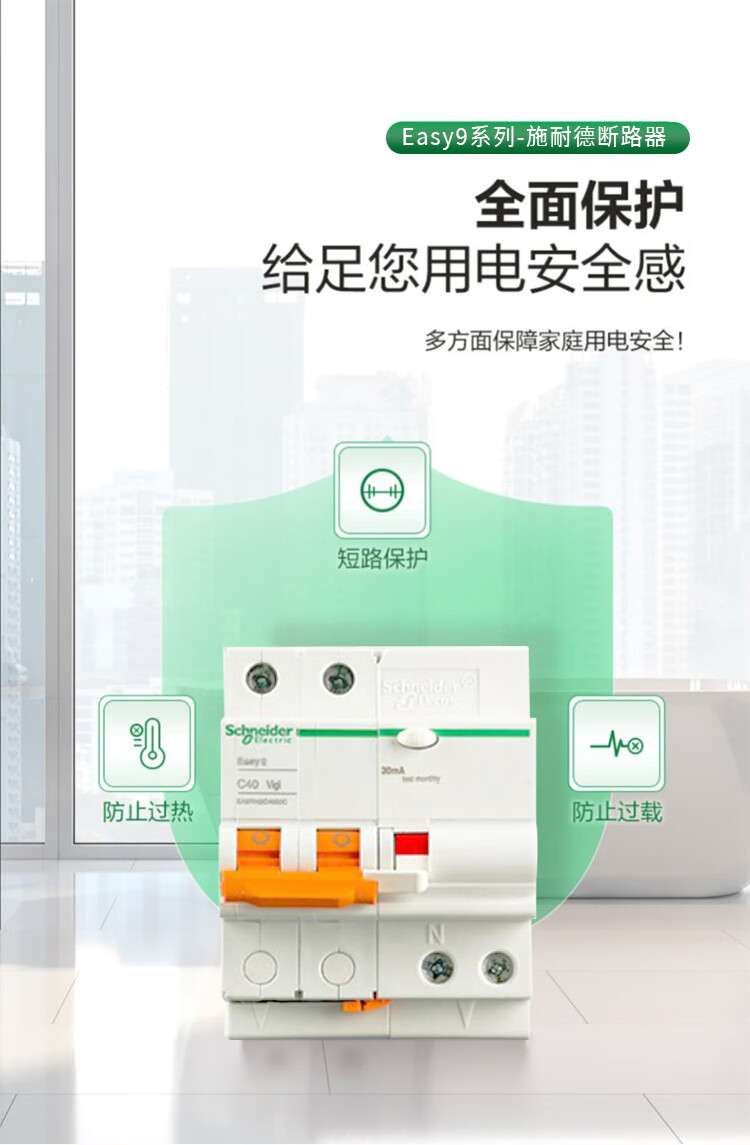 施耐德施耐德空气开关断路器 E9家用空开1P16A~63A 1P+N 2P 3P 4P断路器 4P漏电保护器 40A