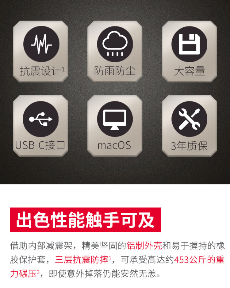 闪迪大师极客 1TB 三防移动硬盘 USB Type-C/3.1 机械硬盘 Armor 2.5英寸 手机直连 西部数据公司出品