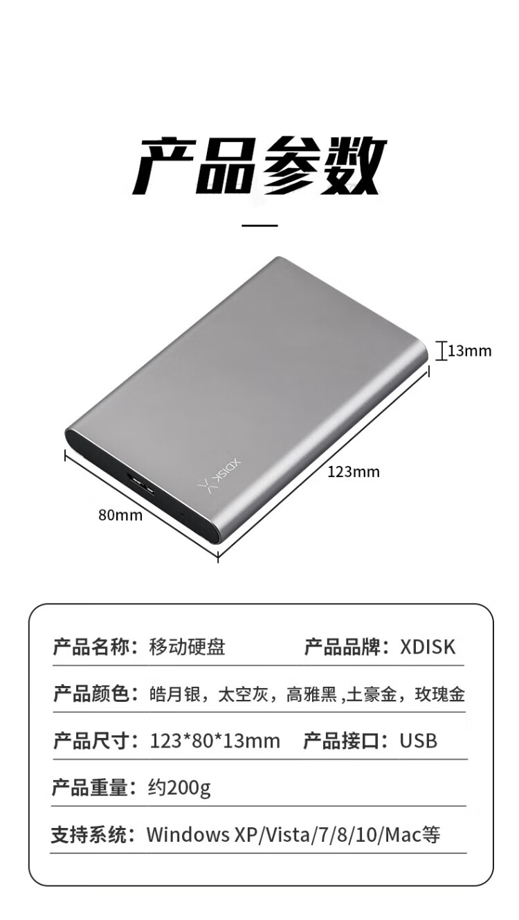 Small disk (XDISK) 500GB USB3.0 metal mobile hard drive X series 2.5-inch Haoyue Silver ultra-thin high-speed portable fashion model data backup storage stable and durable