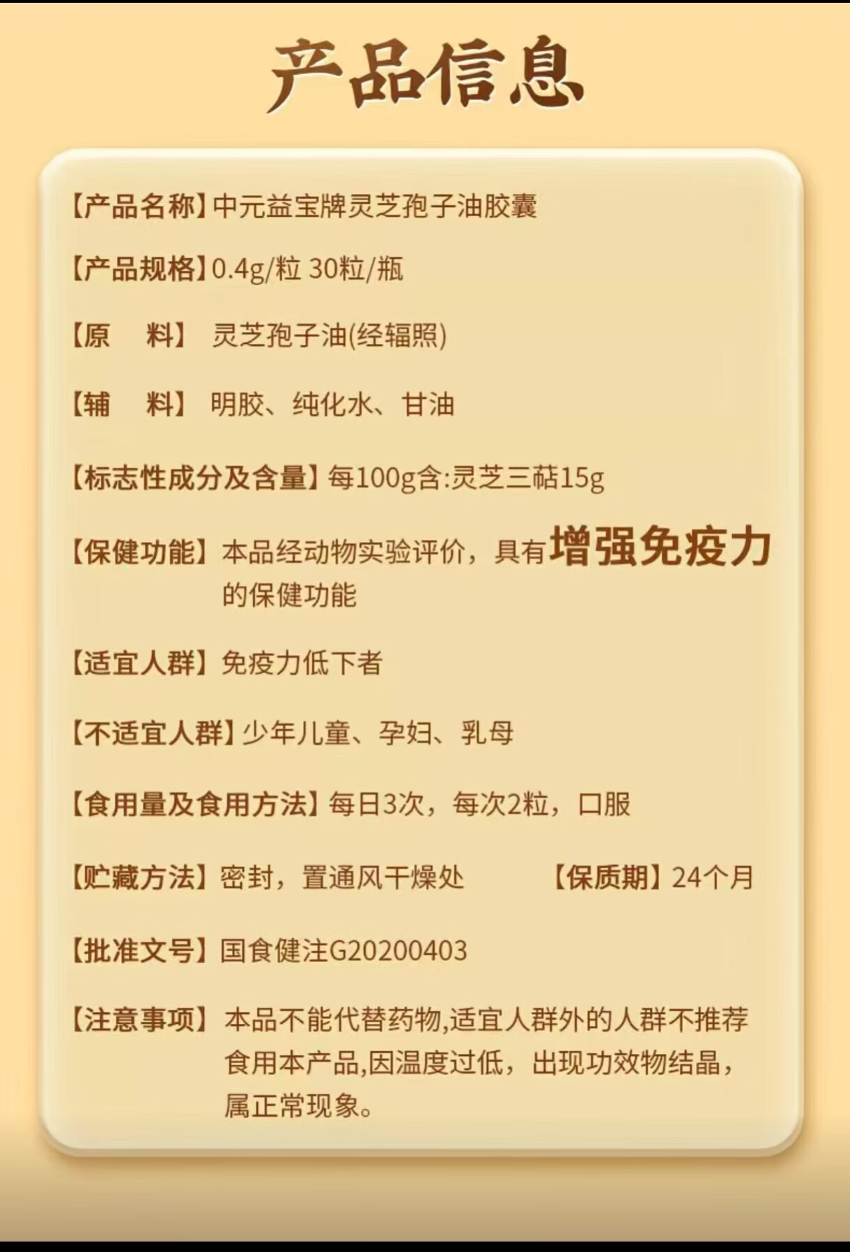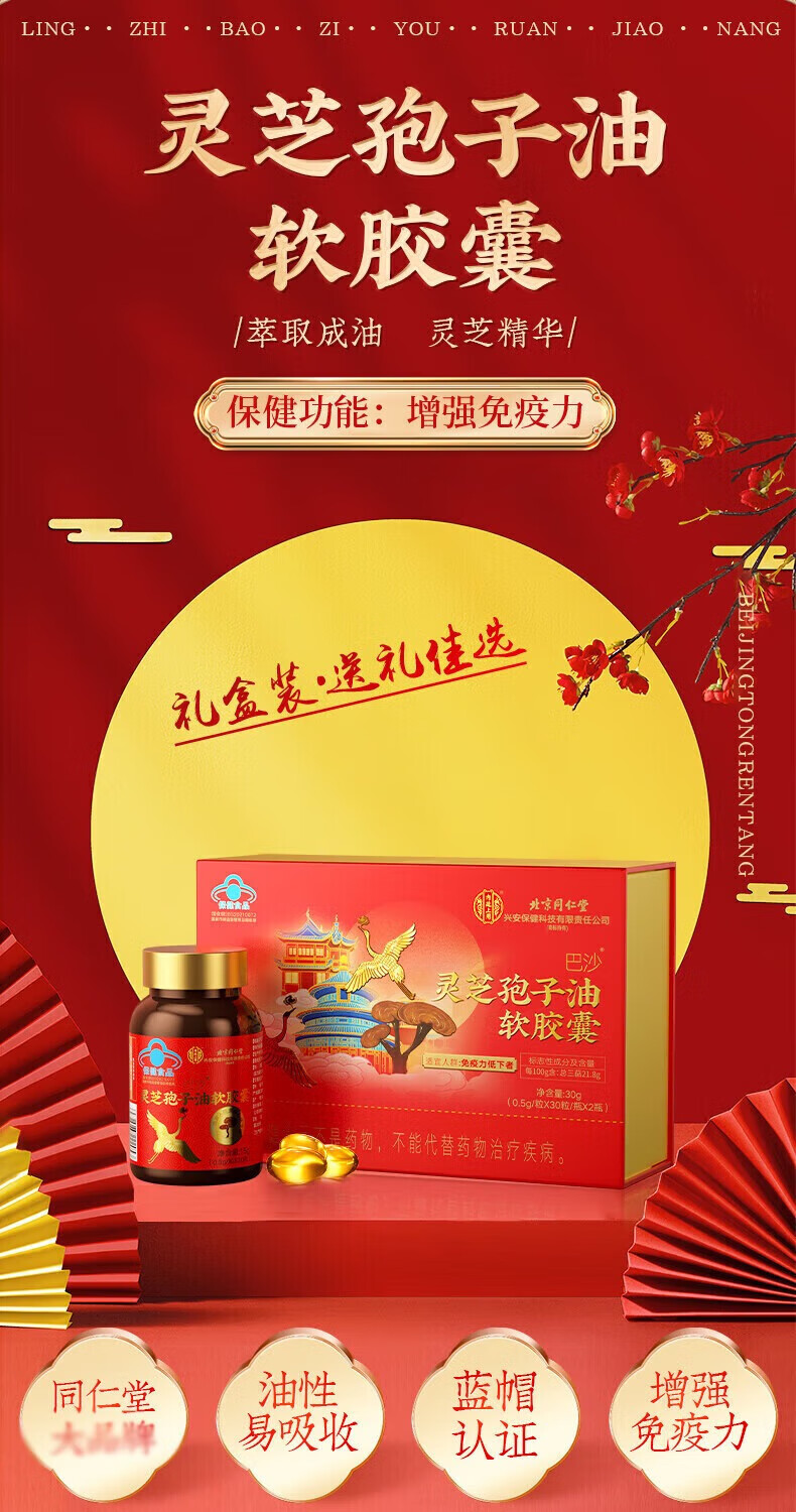 北京同仁堂巴沙破壁灵芝孢子油软胶囊粉增强免疫力送礼盒长辈术后营养品 中元益宝牌灵芝孢子油胶囊30粒/盒装推荐