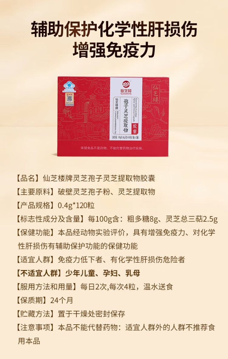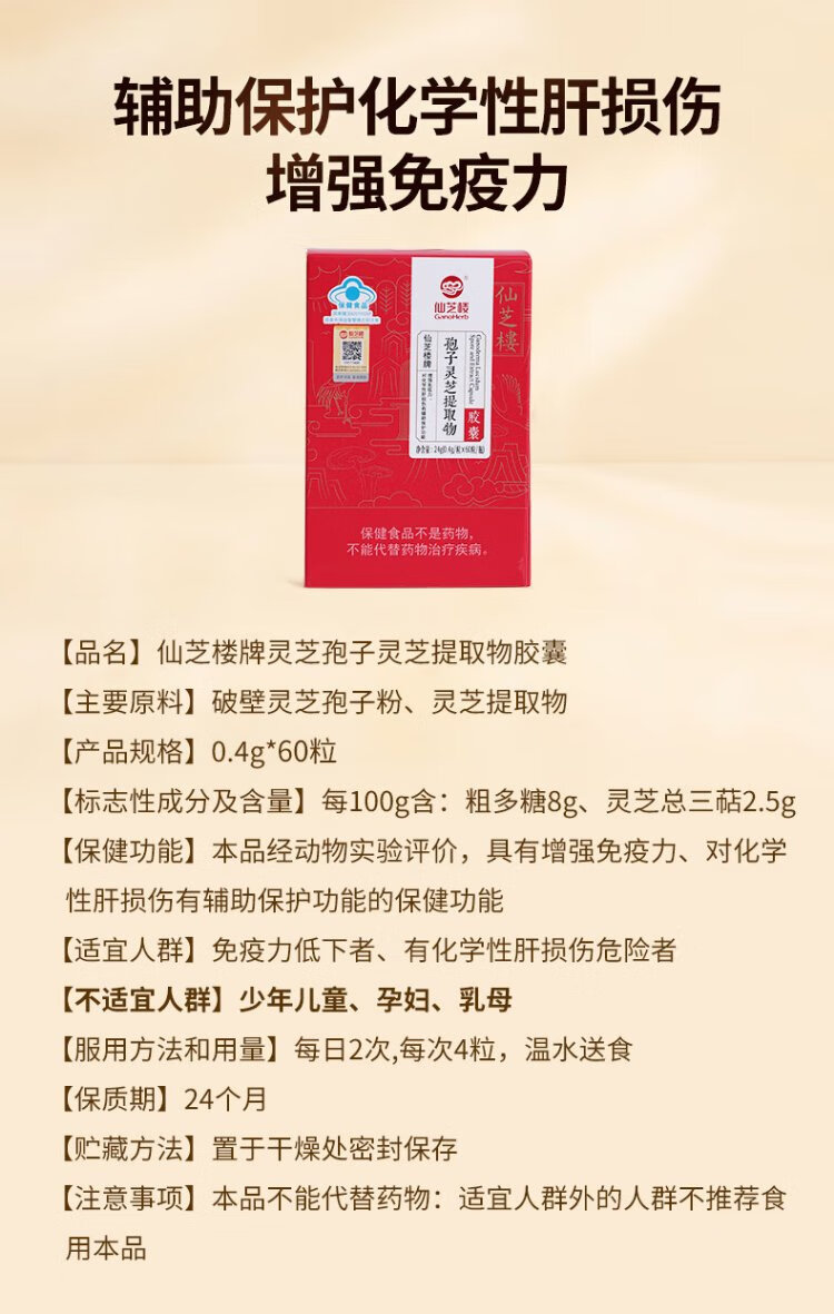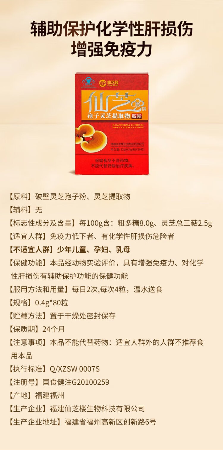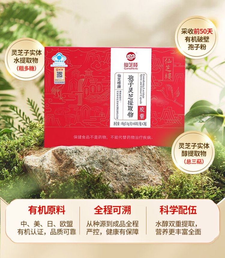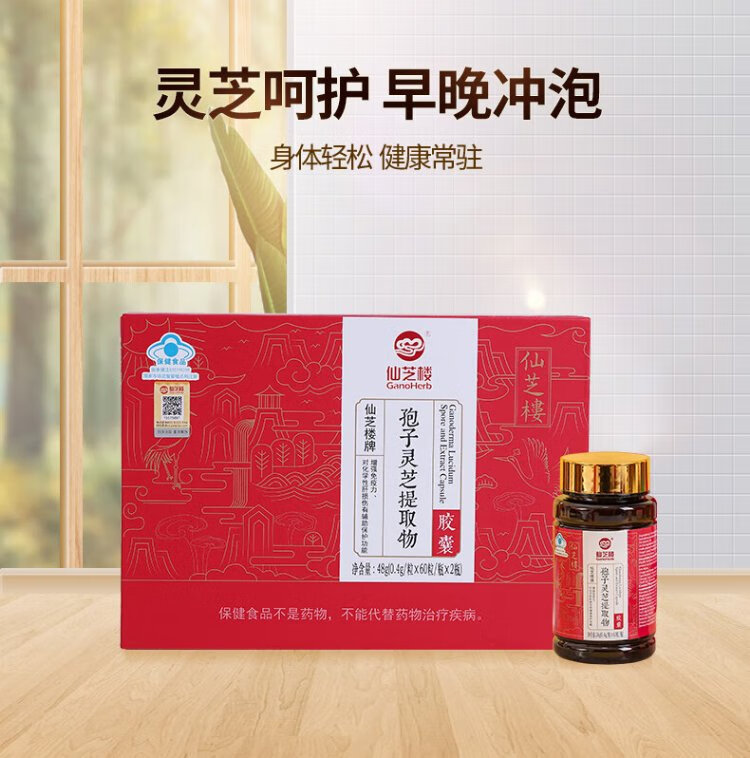 仙芝楼破壁灵芝孢子粉 孢子灵芝提取物胶囊 增强免疫力保健品送礼礼品 1盒 48g 提取物胶囊礼盒