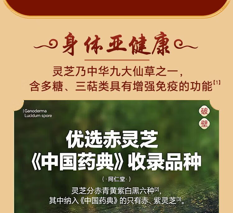 Beijing Tongrentang Beijing Tongrentang Ganoderma spore powder 15 large bags Specifications Traditional Chinese medicine pieces Ganoderma spores Tonify the kidneys and lungs Nourish the heart and calm the mind Stop bleeding and reduce phlegm Physical weakness after illness 3g*15 bags Mid-Autumn Festival 1 box