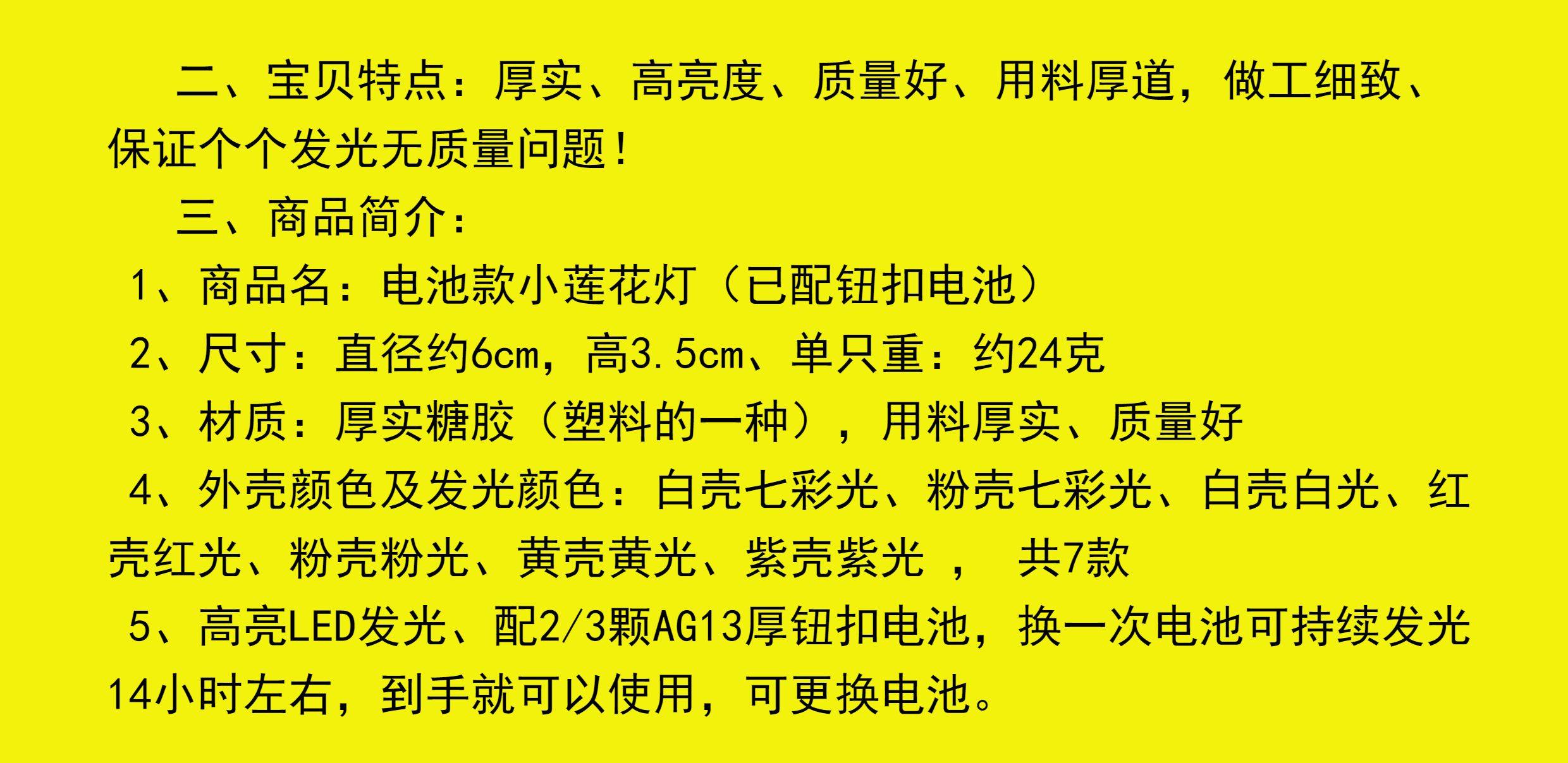 Color Classification Size Description: Diameter about 6.3 High 3.5cm,Equipped with Button Battery, It Can Light up for about 12 Hours,Pink Lotus.Emits 7 Colors of Light,White Lotus Lamp.7 Colored Lights,Red Lotus.Glow Red,Yellow Lotus.Yellow Light,White Lotus.White Light,Purple Lotus.Purple Light,Pink Lotus Lamp.Glow-In-The-Dark,Red Shell Rose Lamp (Red Light),White Shell Rose Lamp (Colorful Light),Please Purchase Additional Batteries (50 Pieces) as Each Lamp Requires 3 Pieces,Customized (Non-Refundable and Non-Exchangeable) Shipped with Chat History