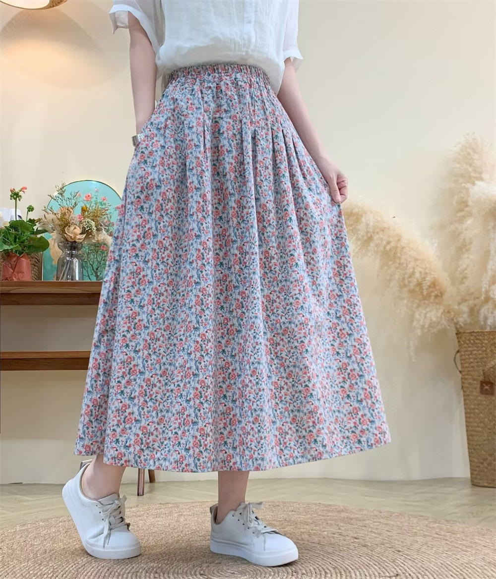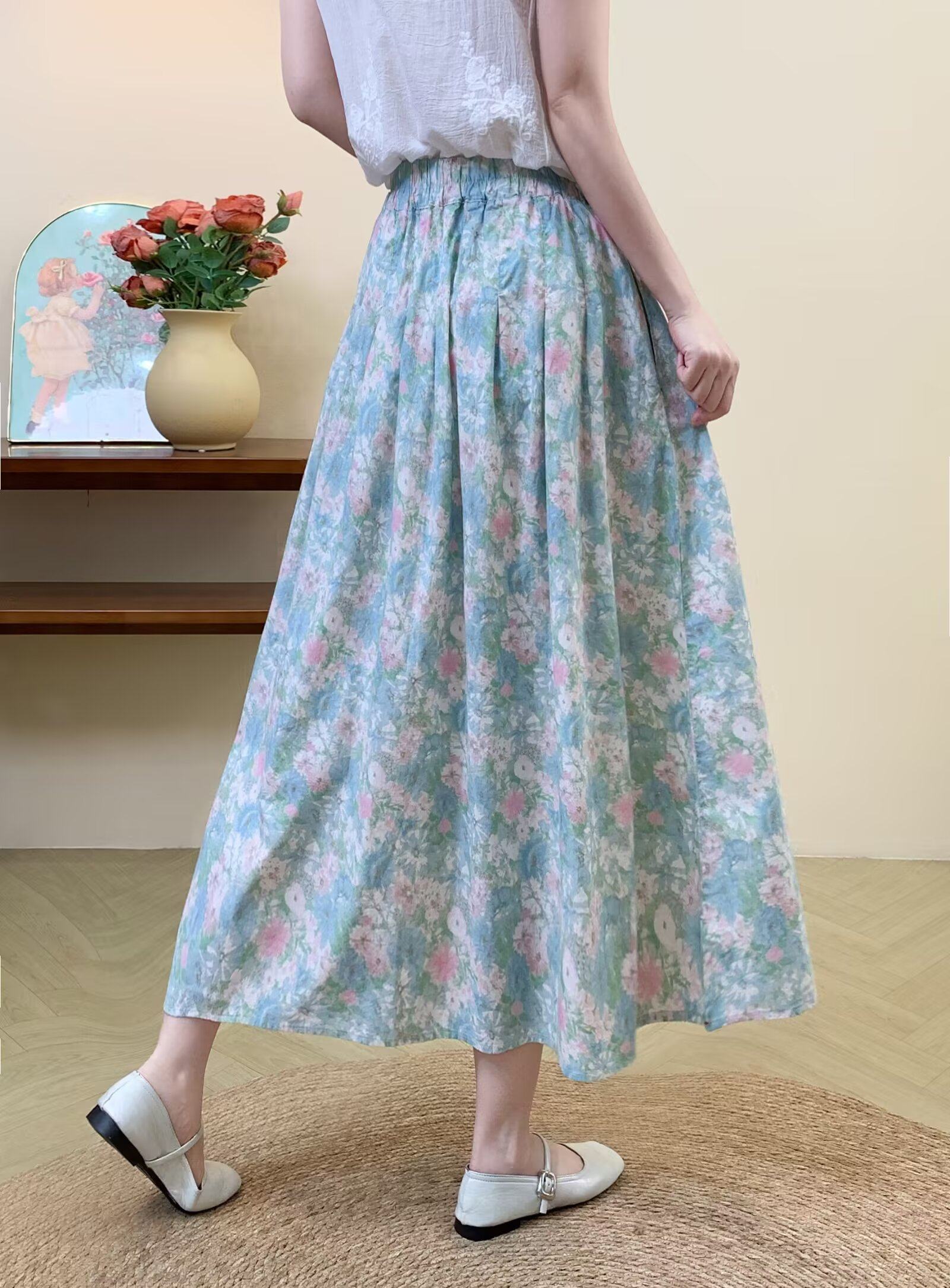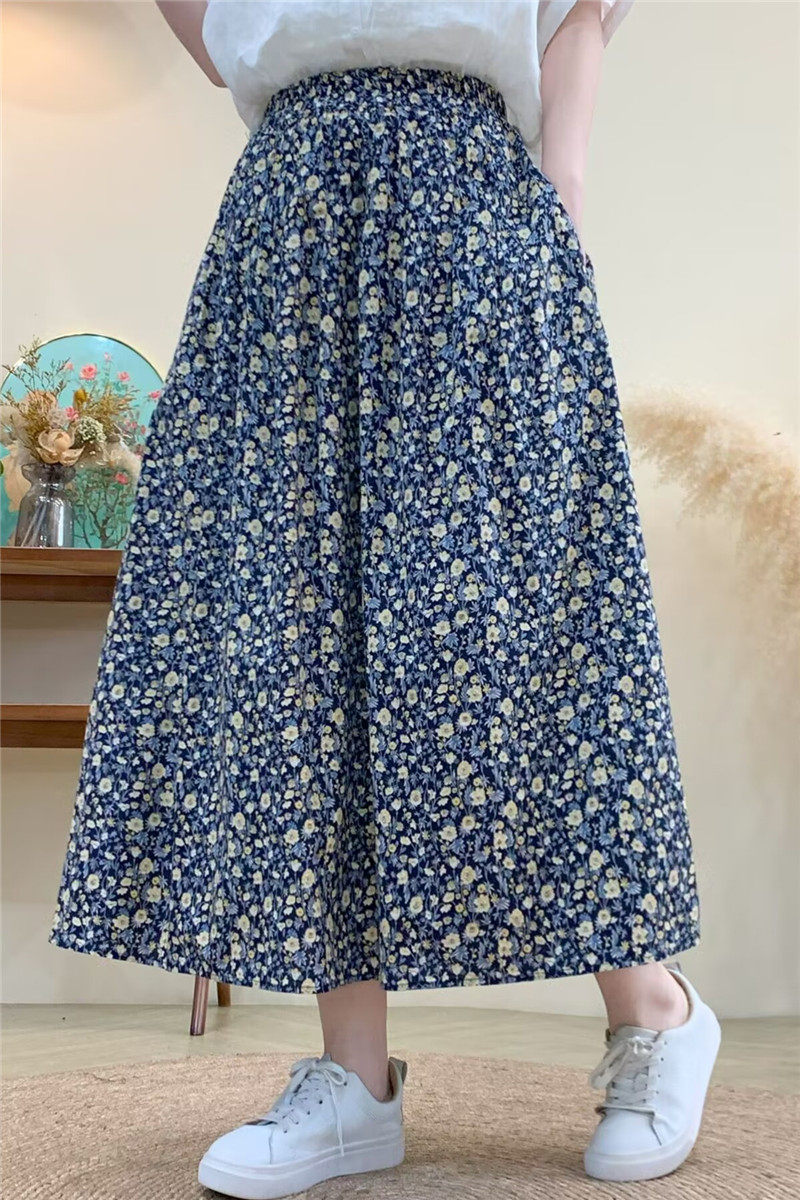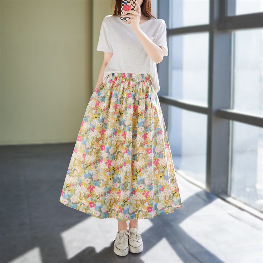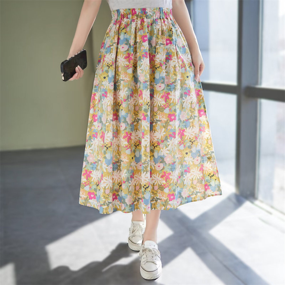 2025 New Literary Pure Cotton Printed Skirt Small Floral Versatile Small High Waist Big Swing A-Line Midi Skirt