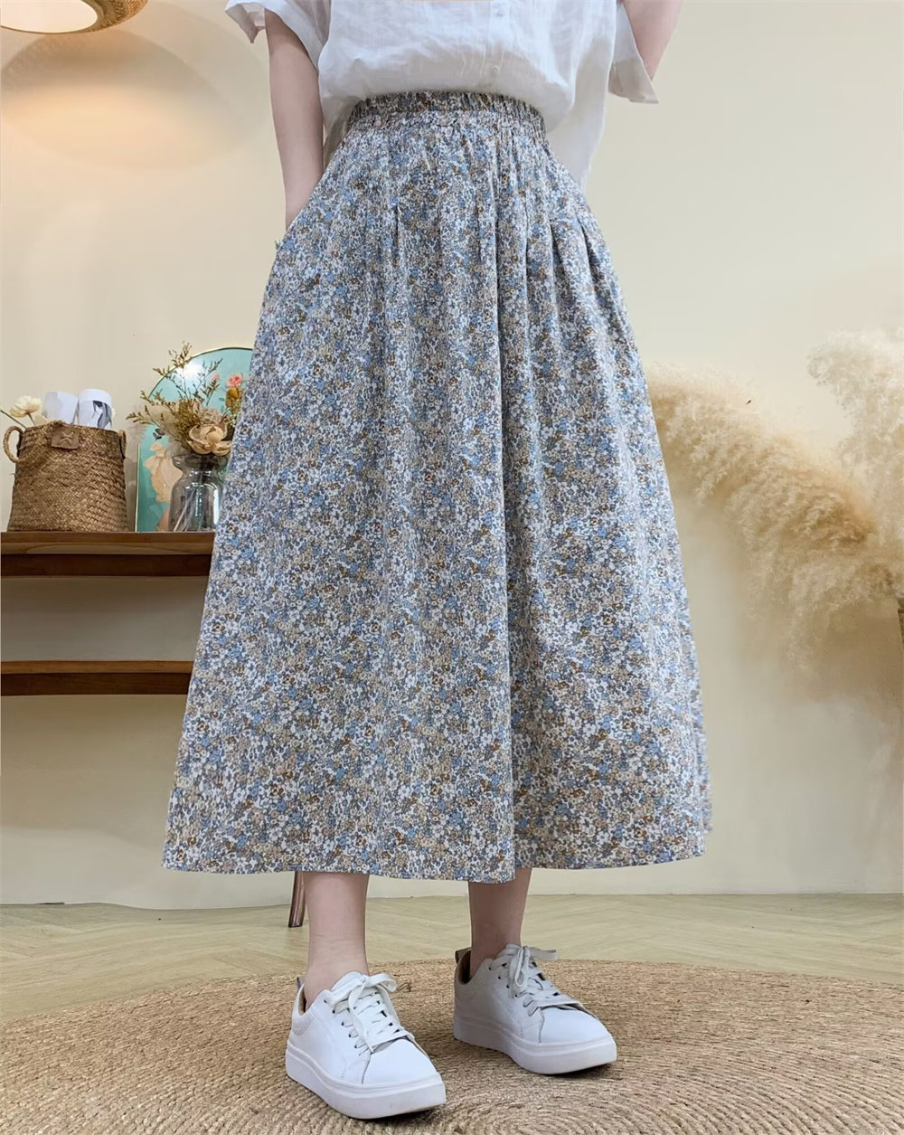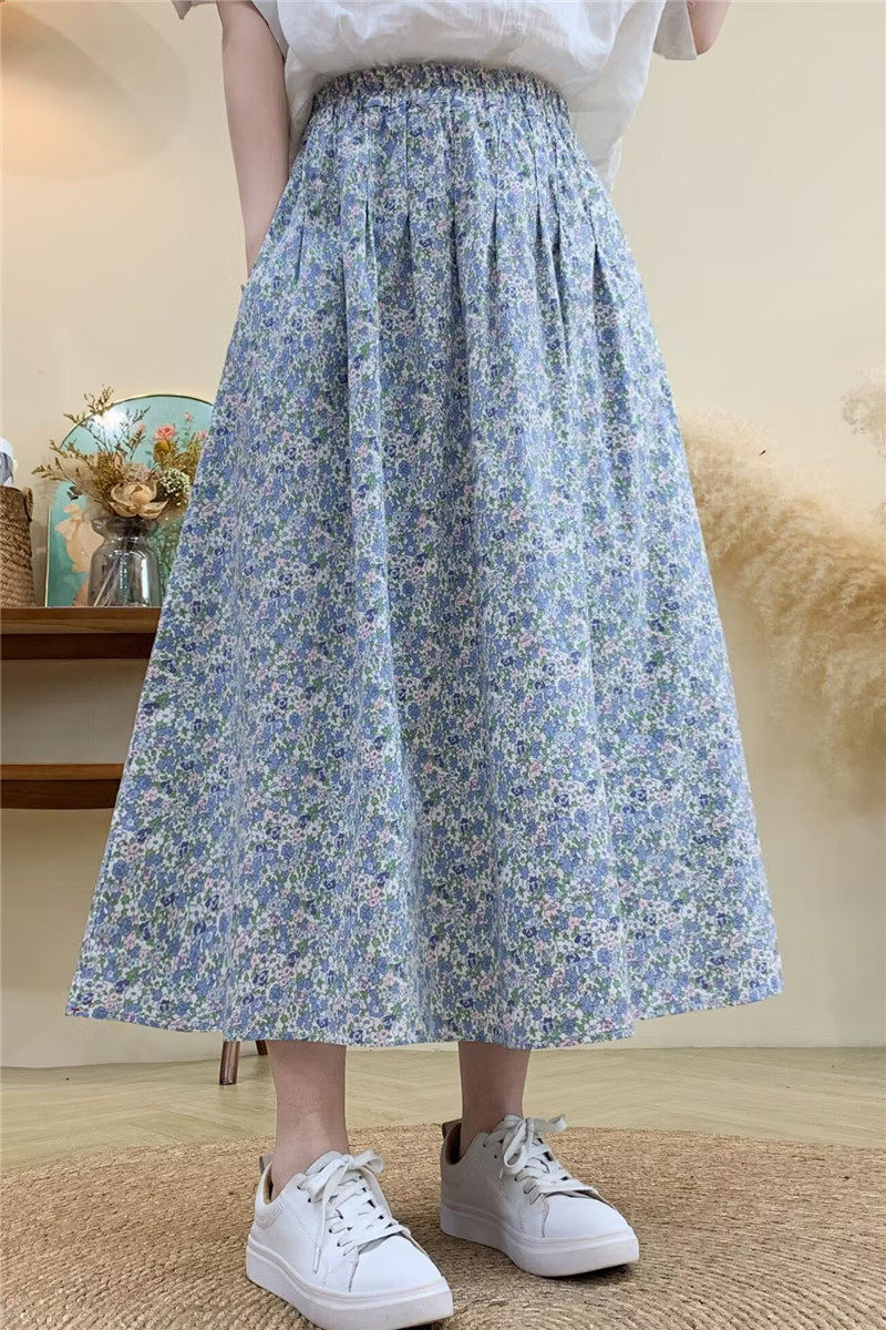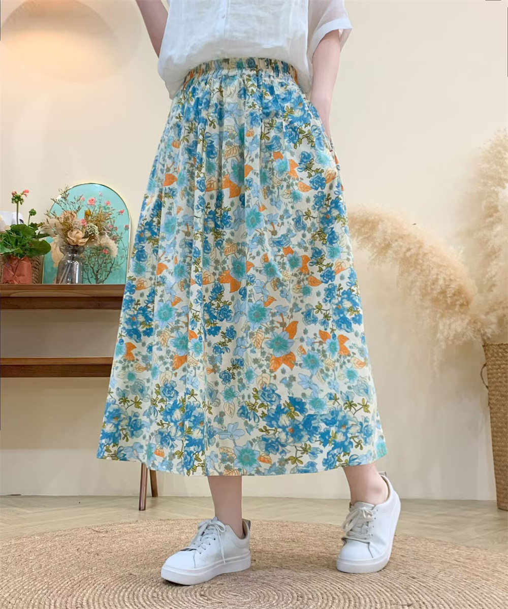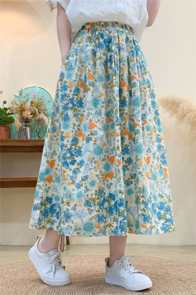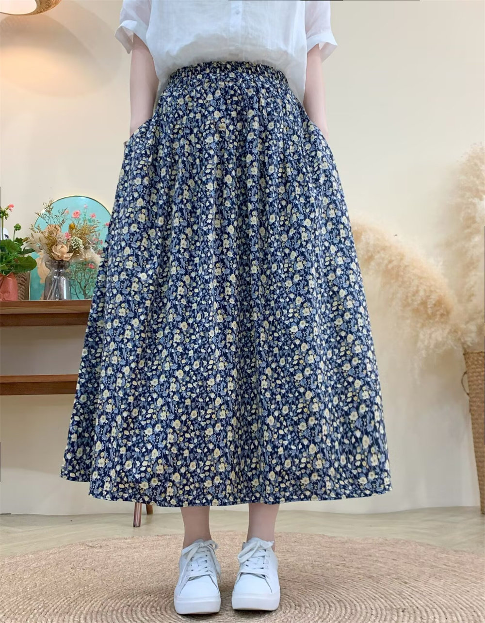 2025 New Literary Pure Cotton Printed Skirt Small Floral Versatile Small High Waist Big Swing A-Line Midi Skirt