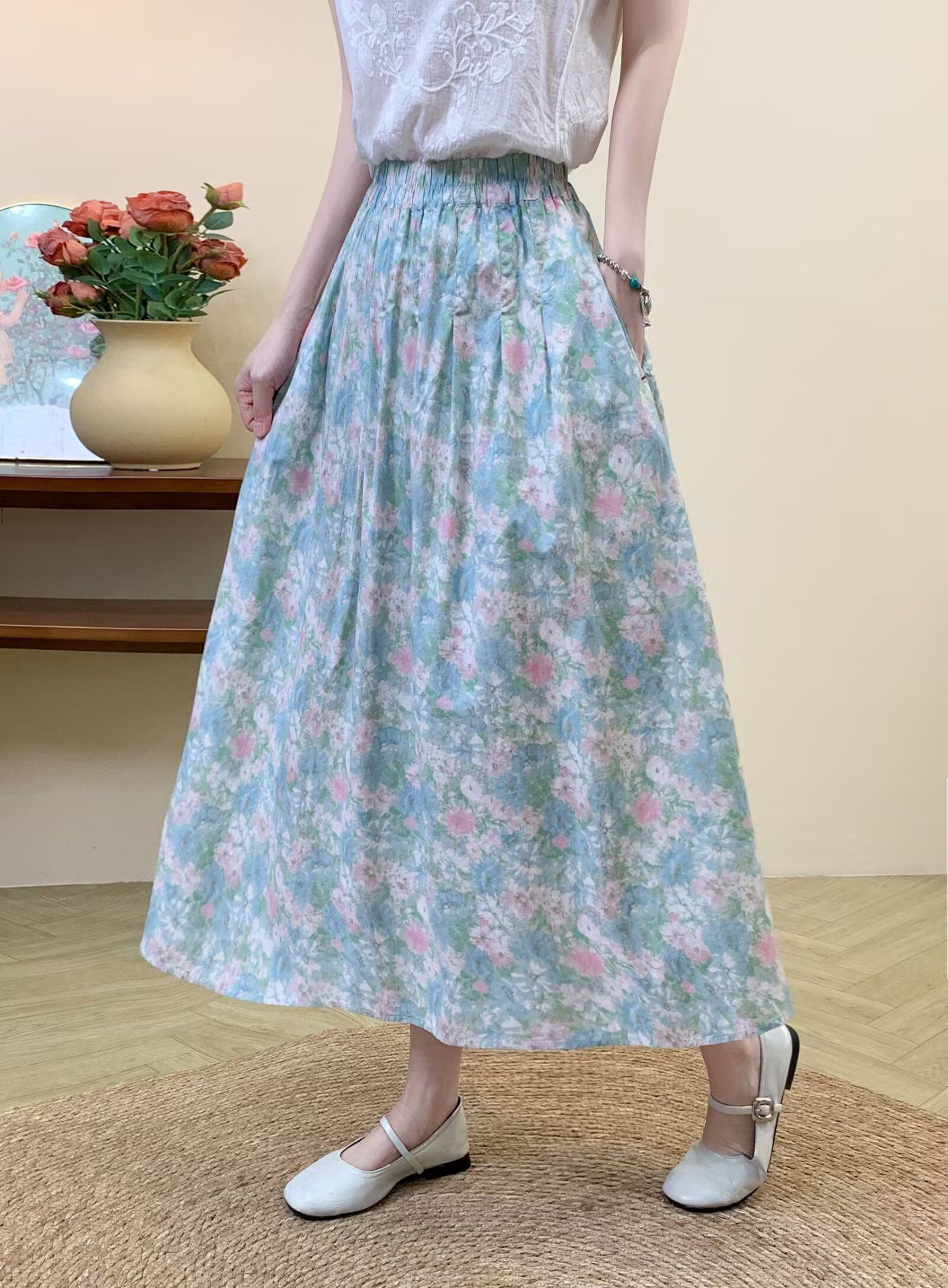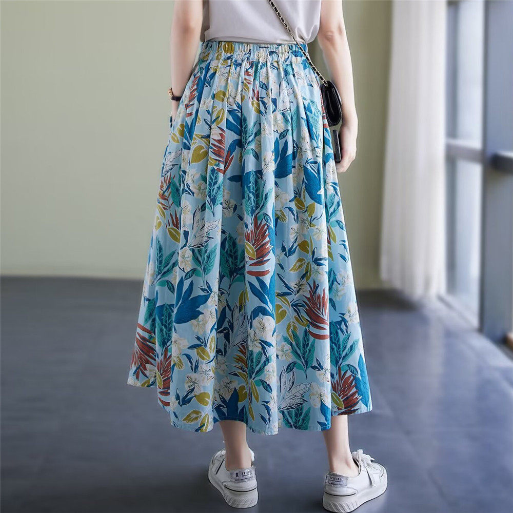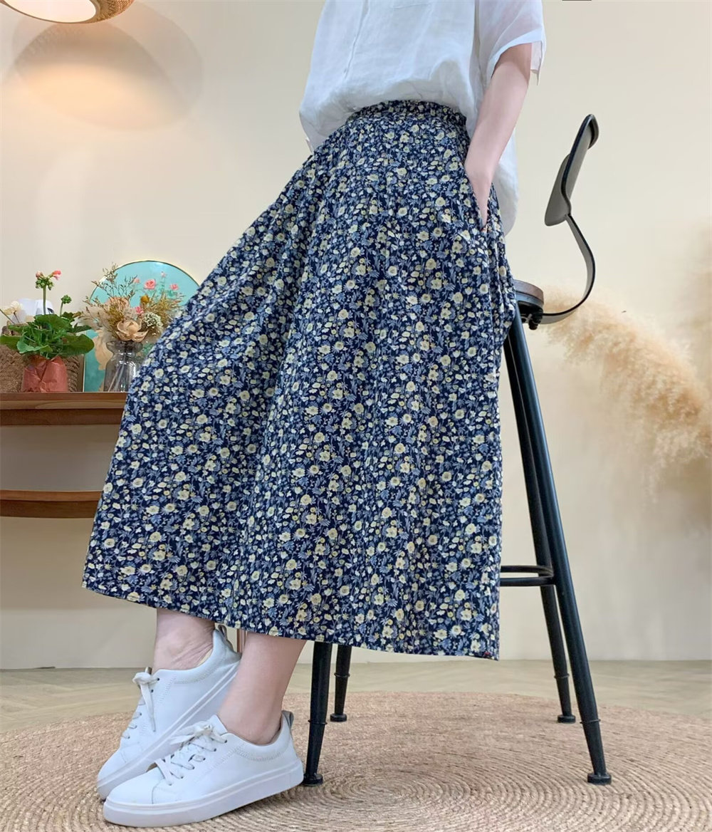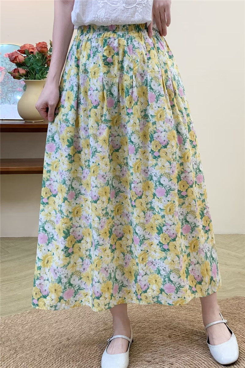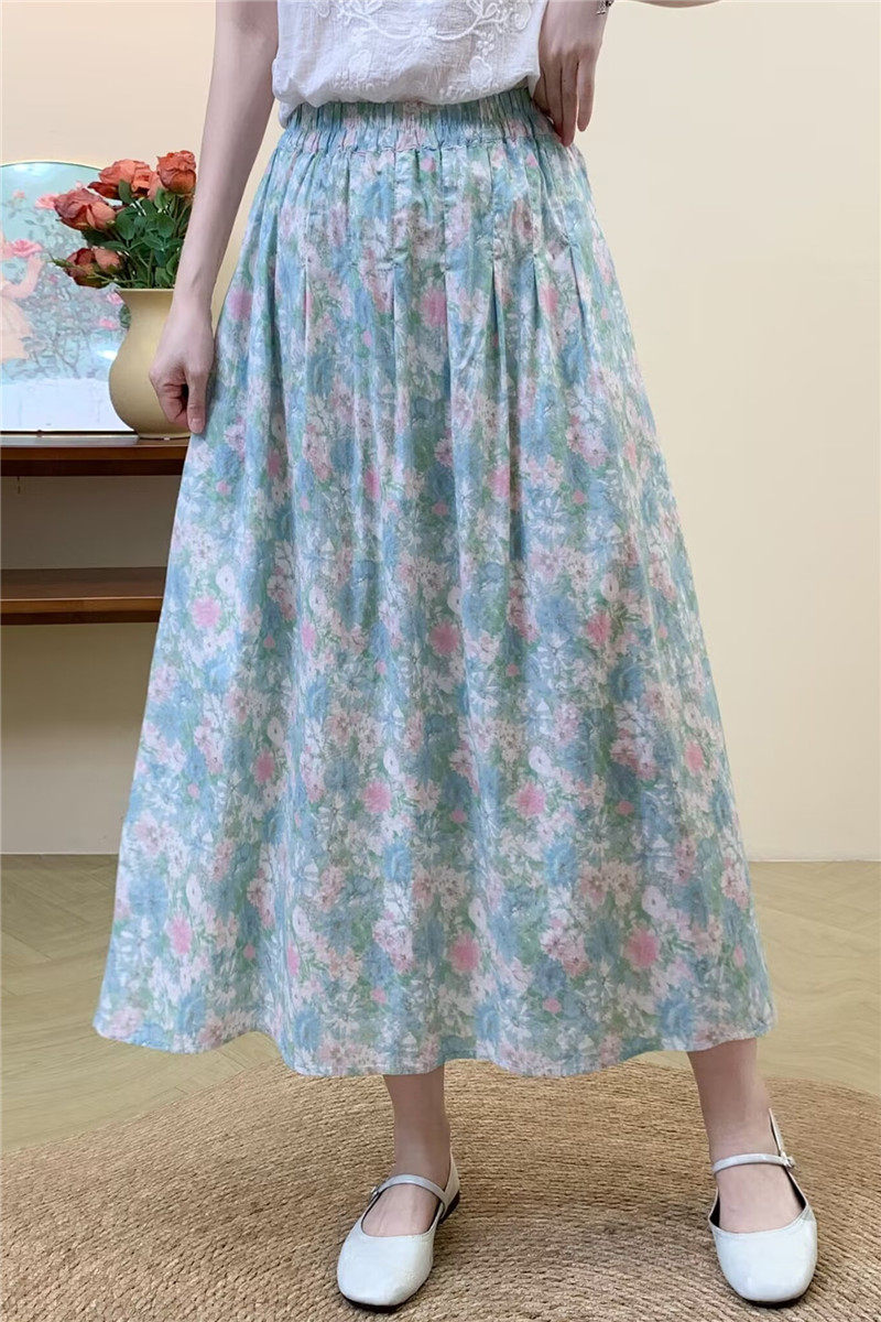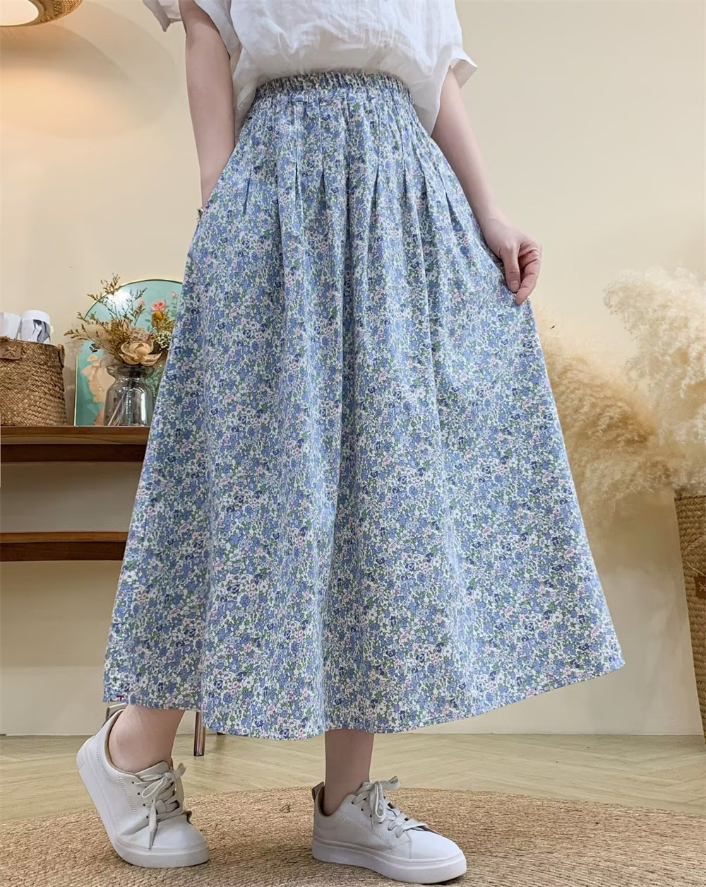 2025 New Literary Pure Cotton Printed Skirt Small Floral Versatile Small High Waist Big Swing A-Line Midi Skirt