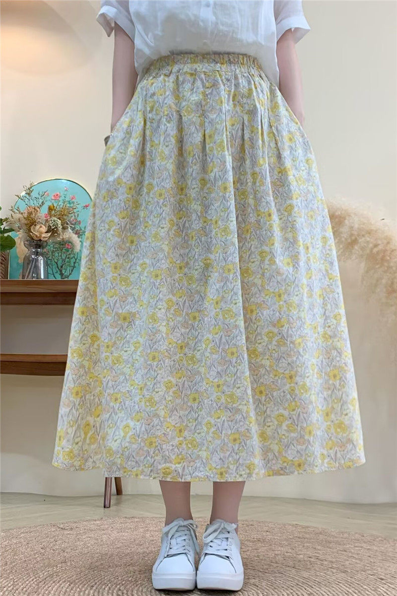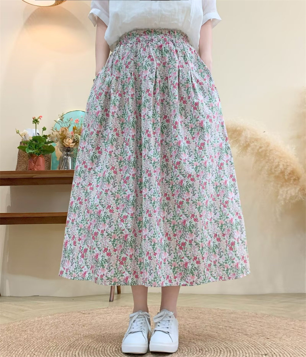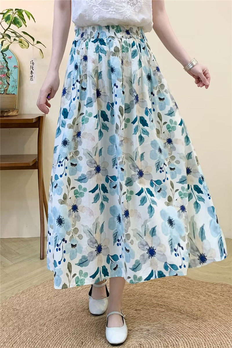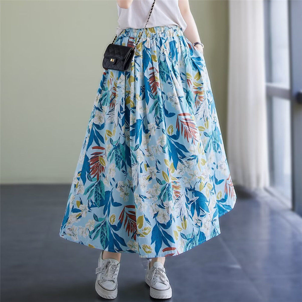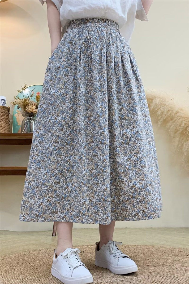 2025 New Literary Pure Cotton Printed Skirt Small Floral Versatile Small High Waist Big Swing A-Line Midi Skirt