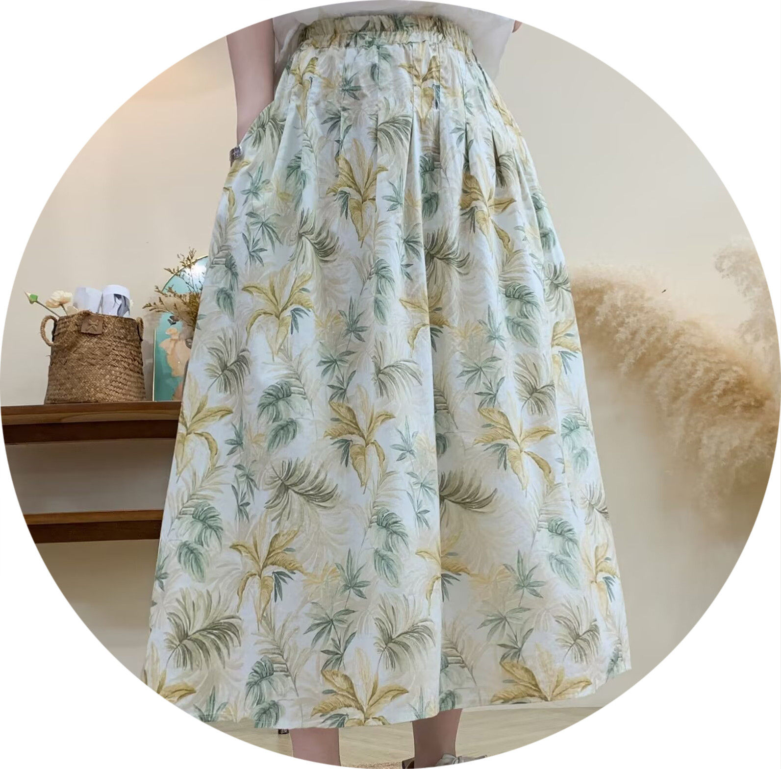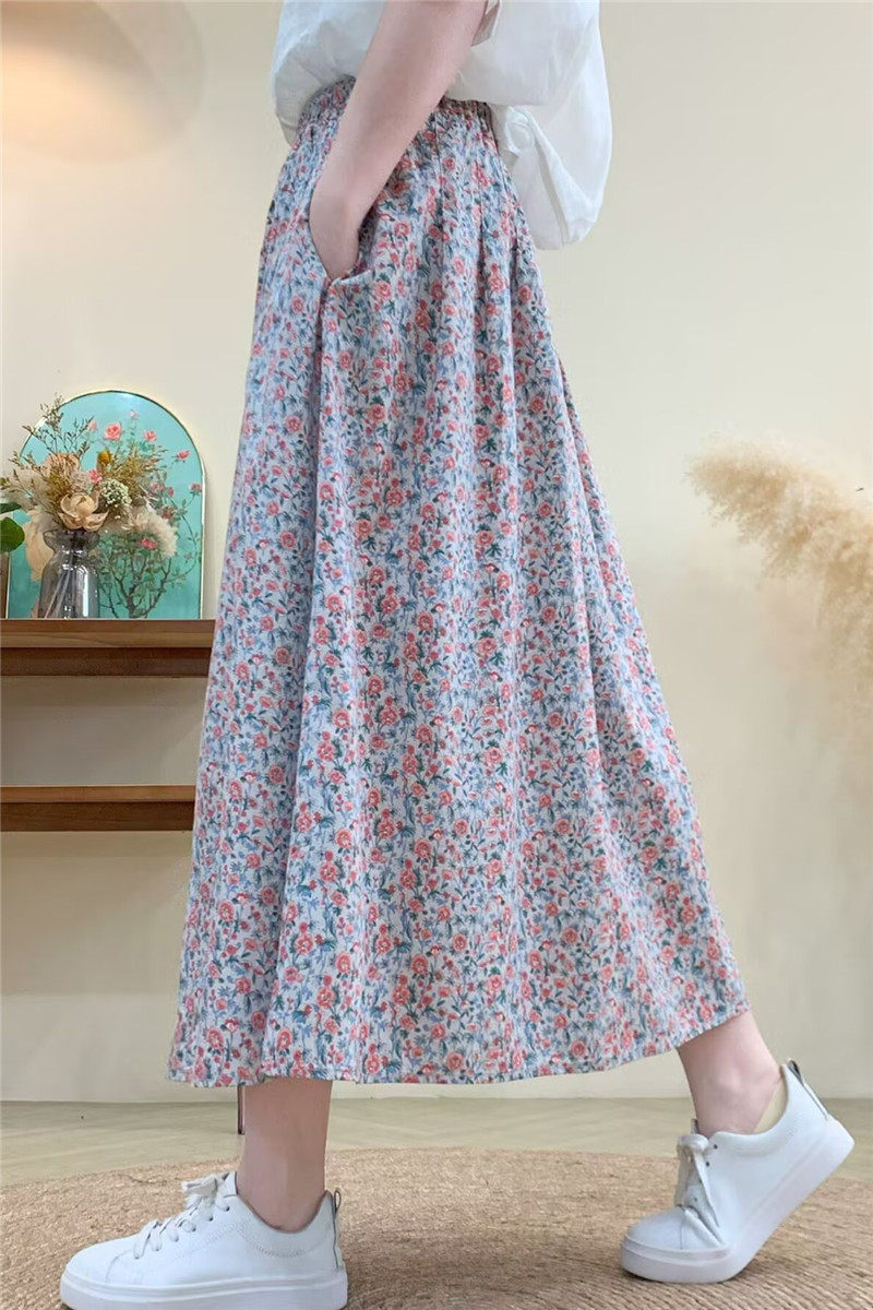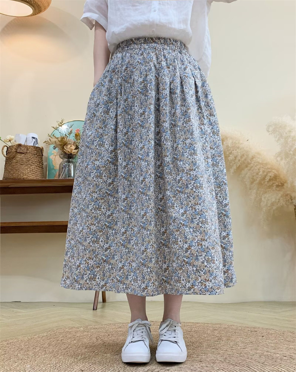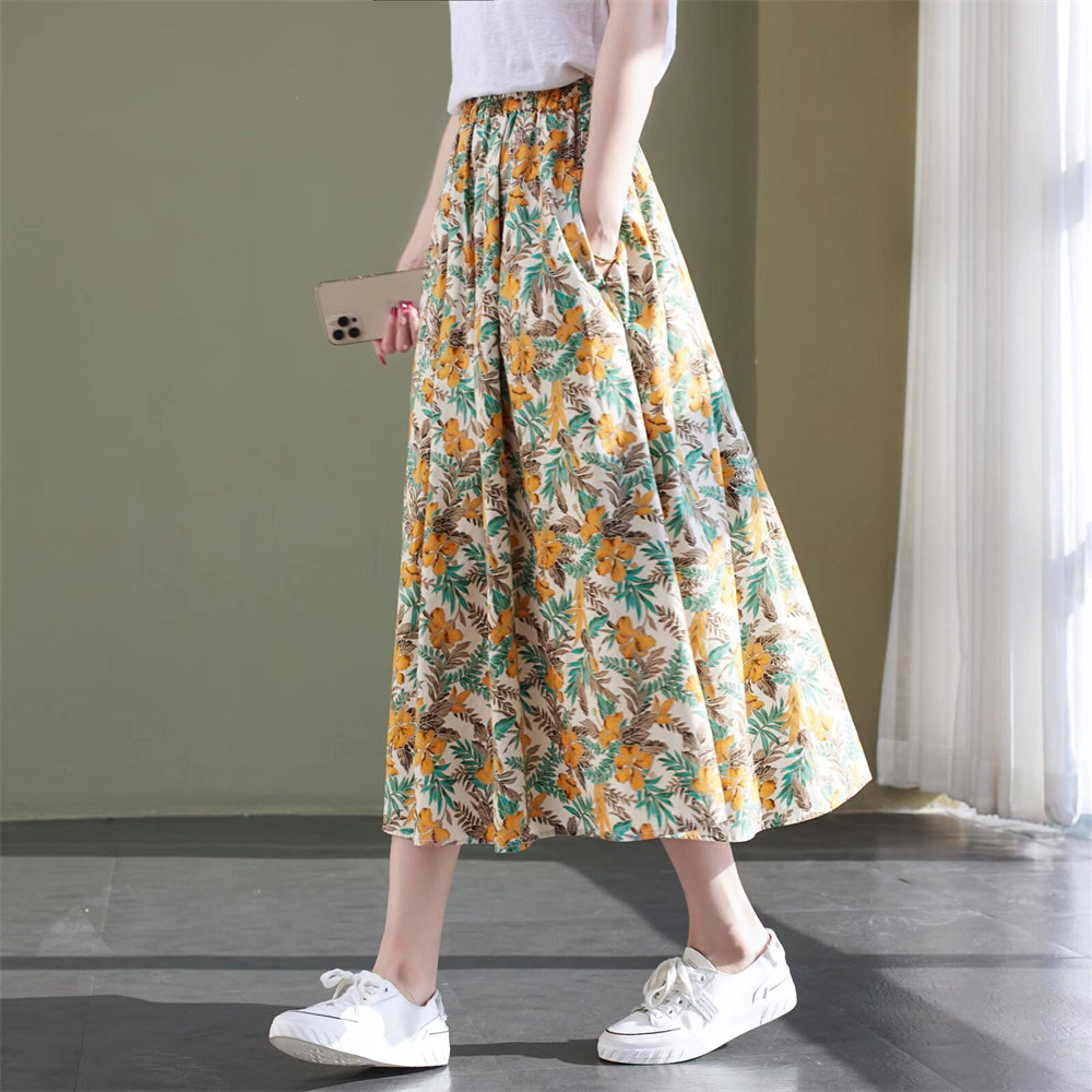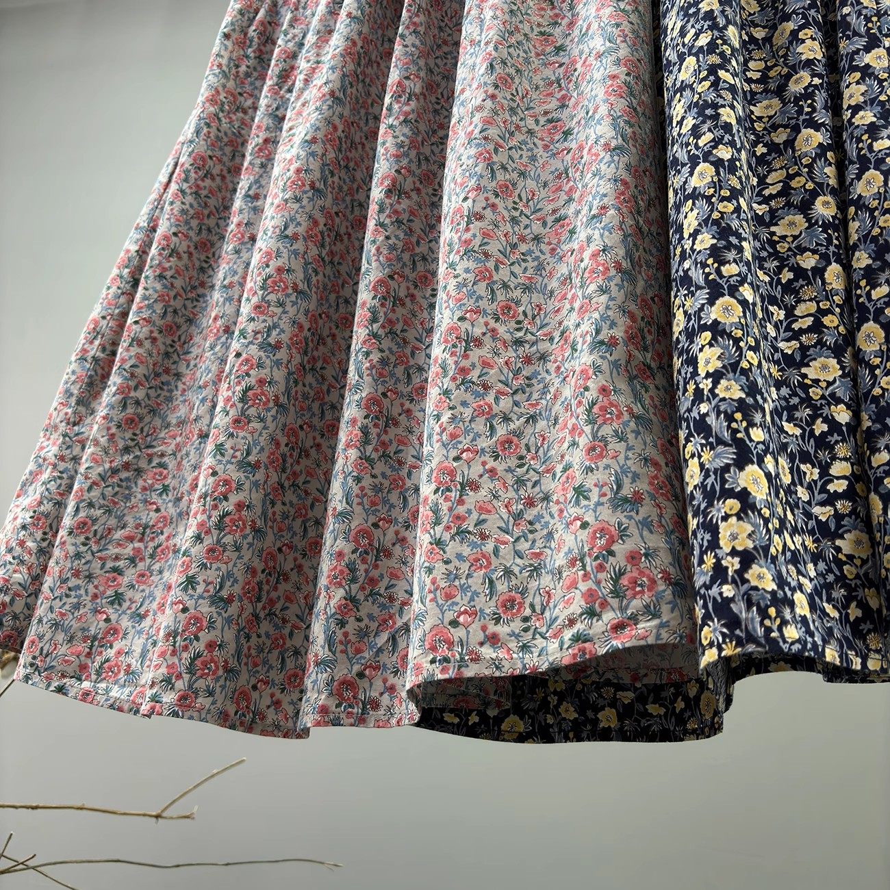 2025 New Literary Pure Cotton Printed Skirt Small Floral Versatile Small High Waist Big Swing A-Line Midi Skirt