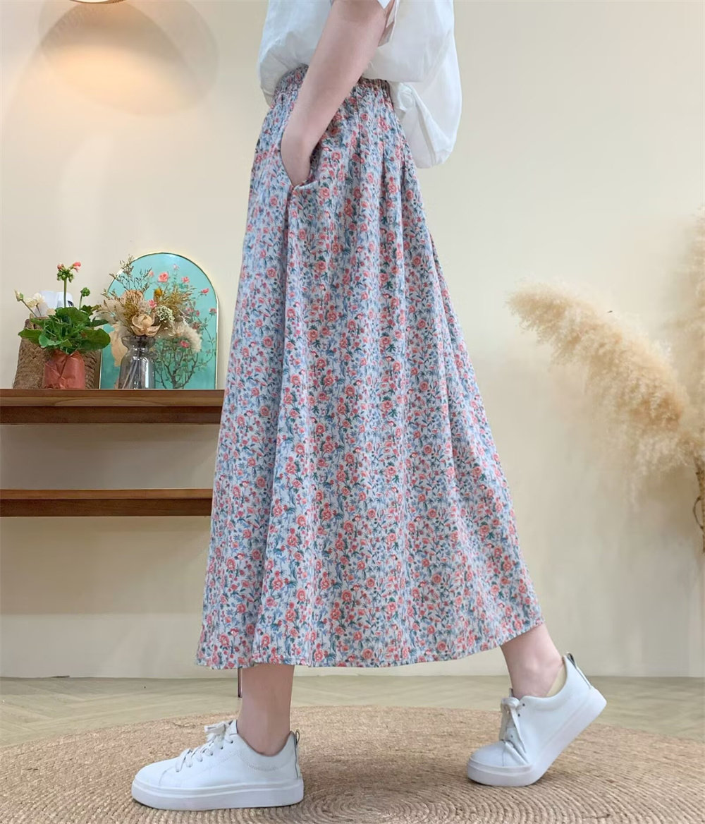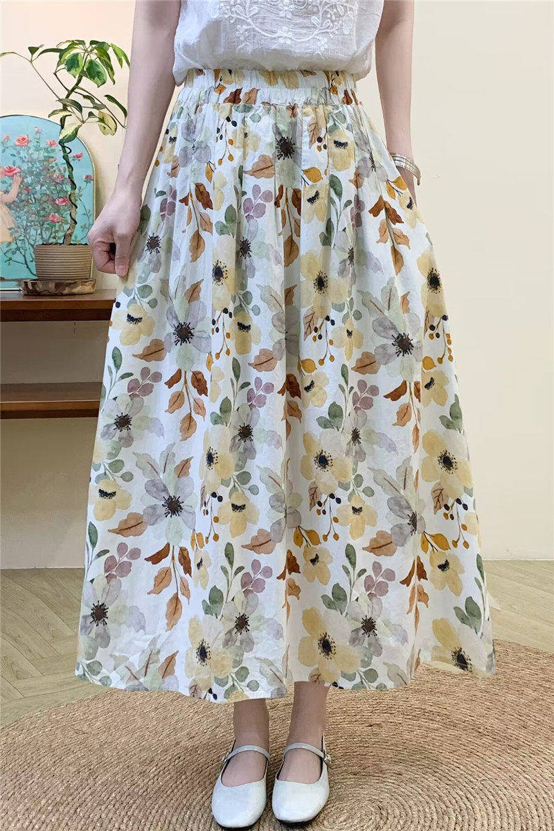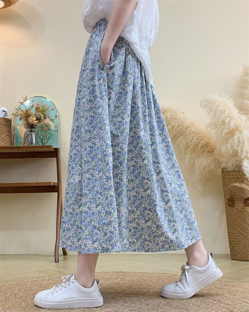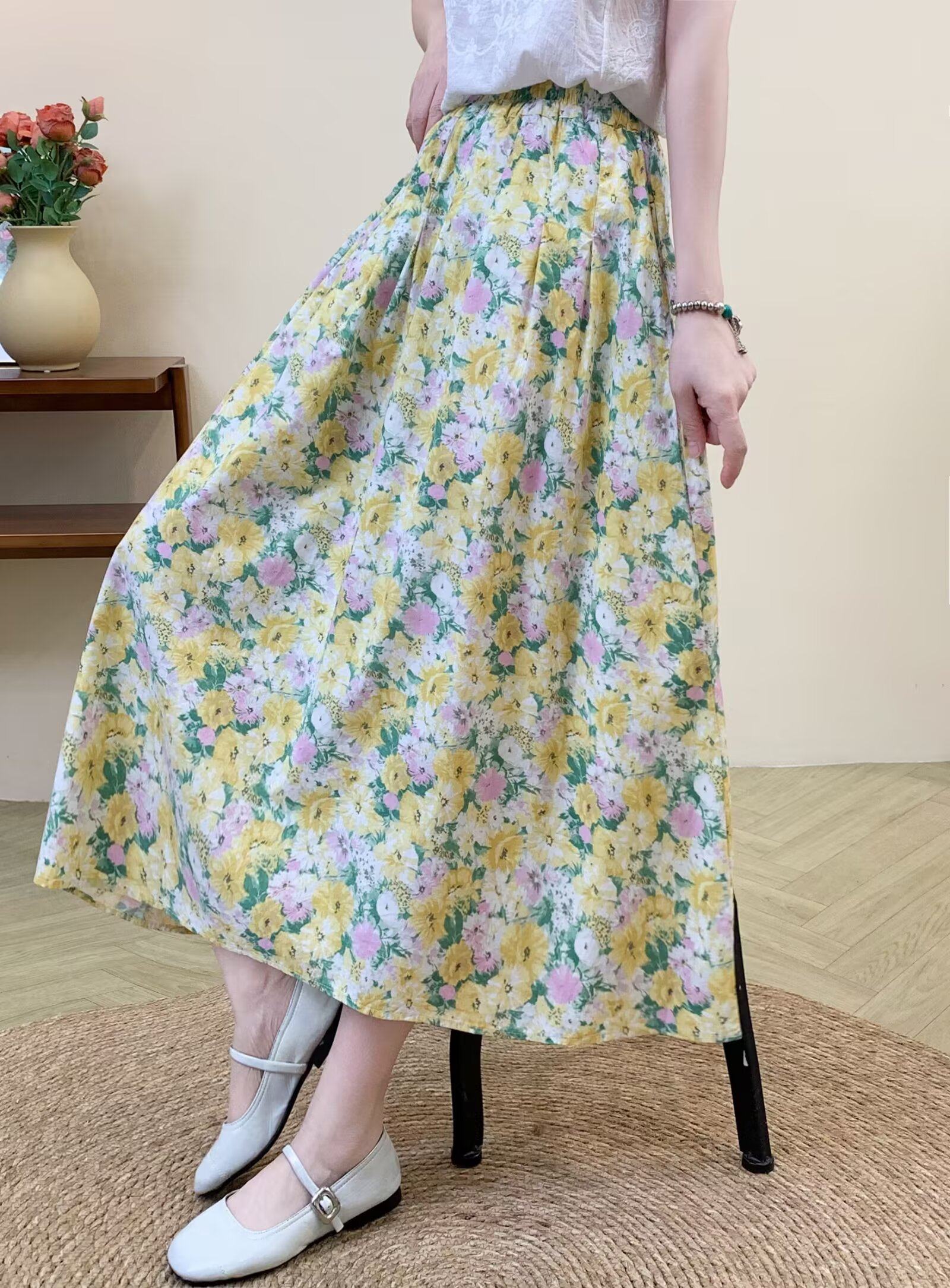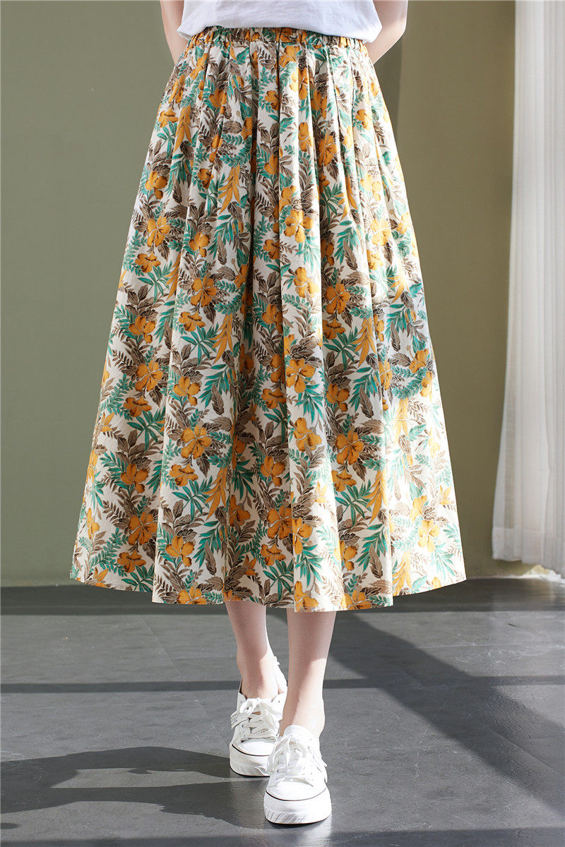2025 New Literary Pure Cotton Printed Skirt Small Floral Versatile Small High Waist Big Swing A-Line Midi Skirt