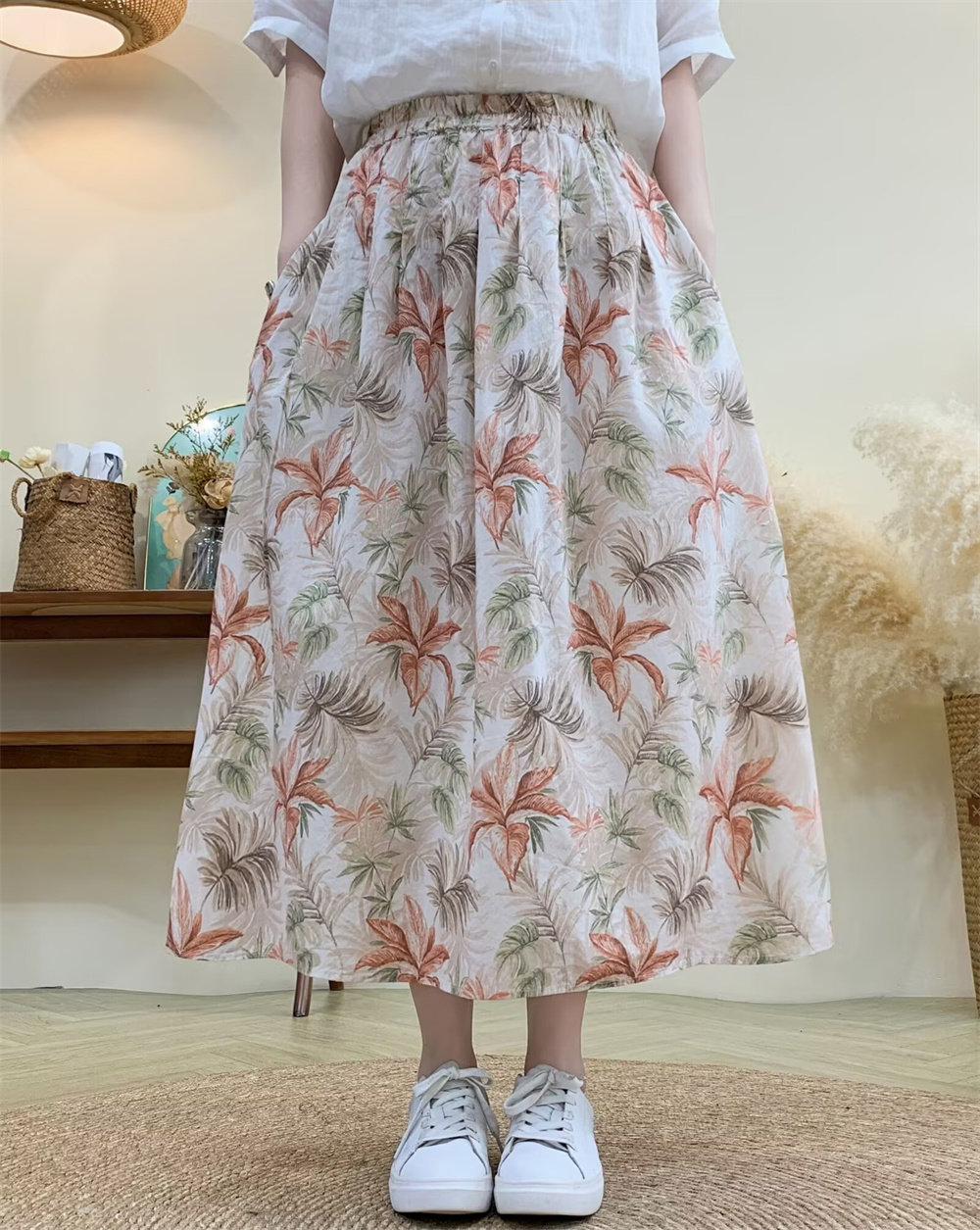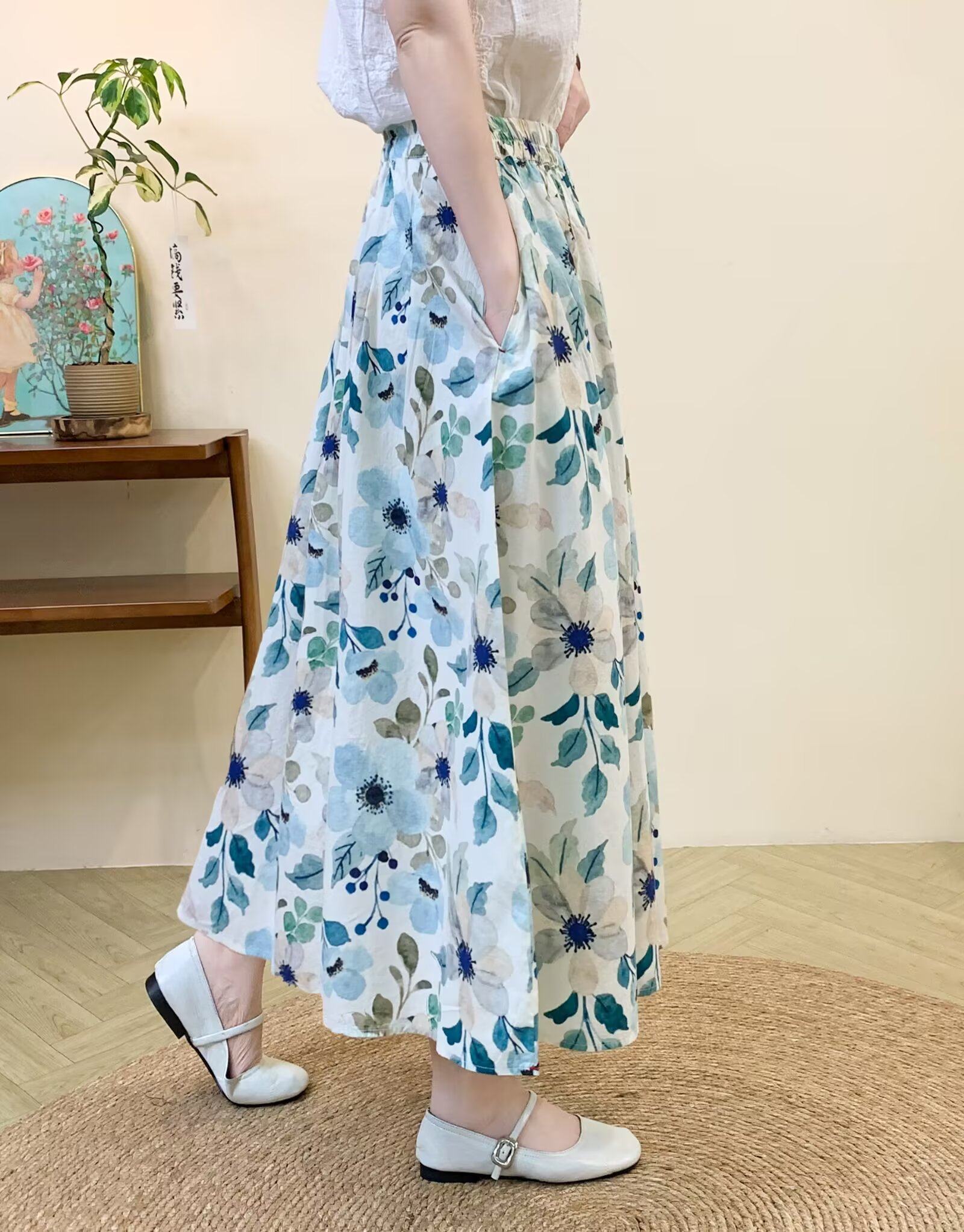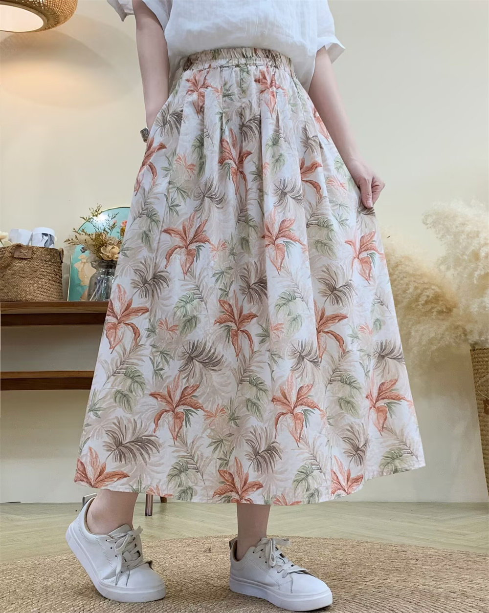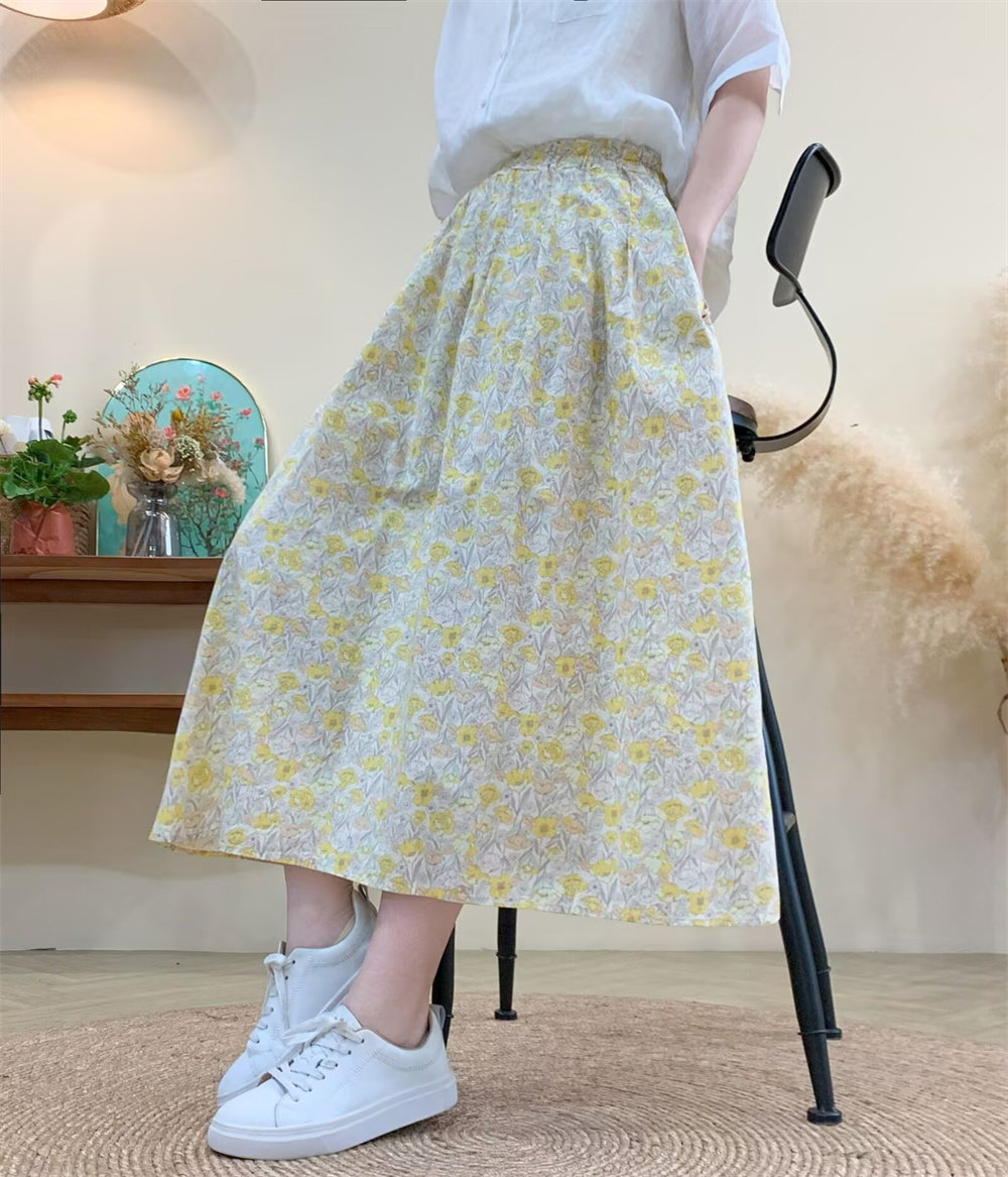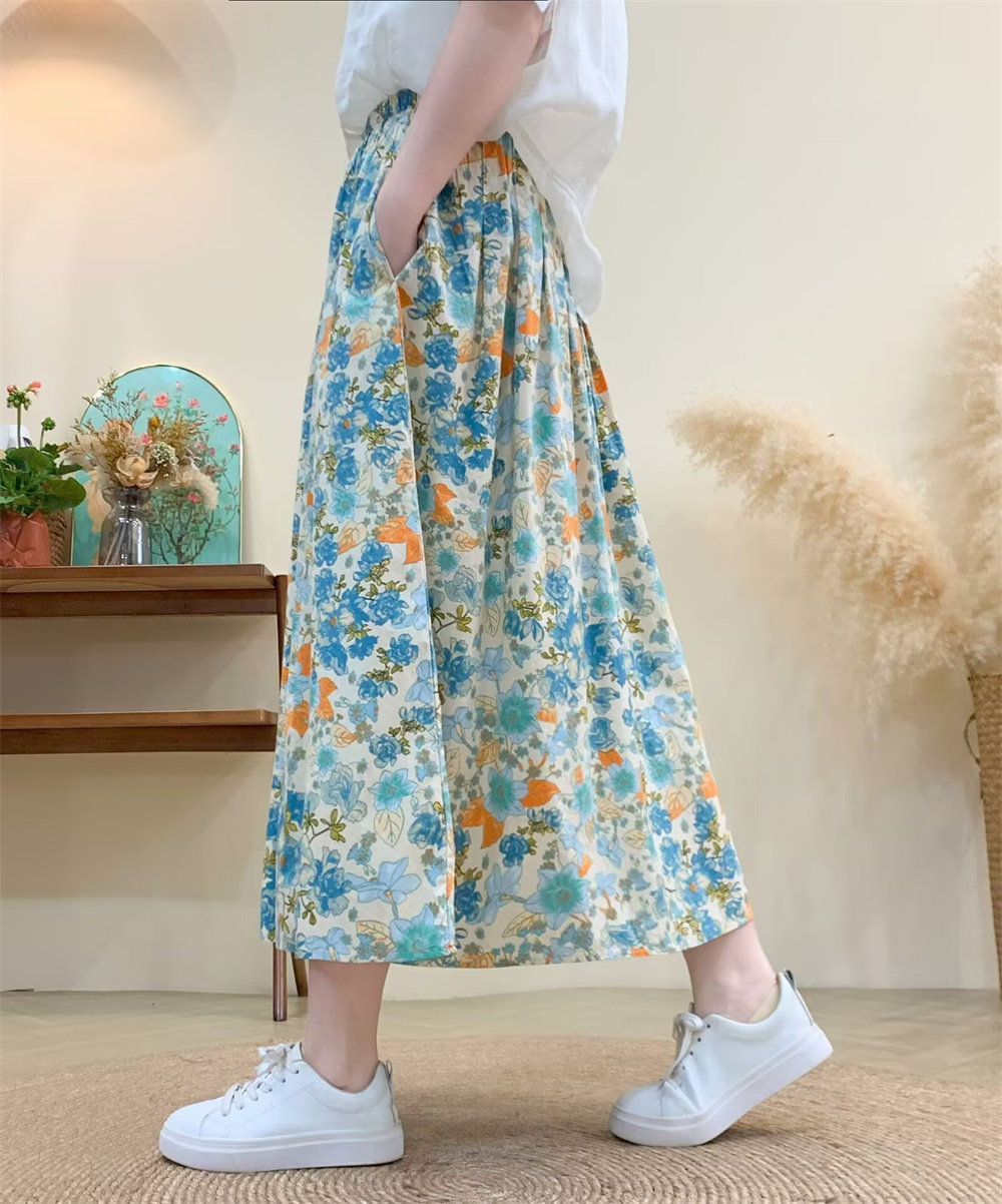 2025 New Literary Pure Cotton Printed Skirt Small Floral Versatile Small High Waist Big Swing A-Line Midi Skirt