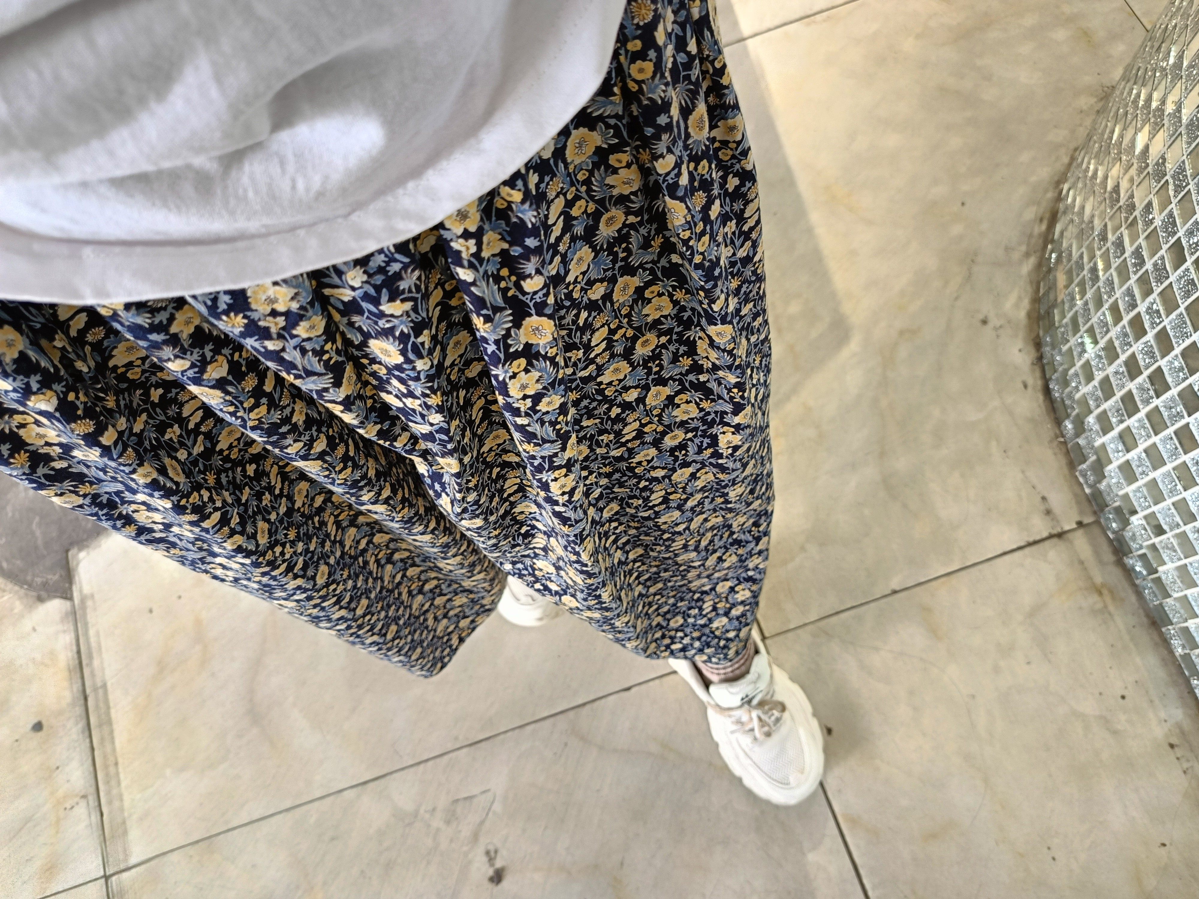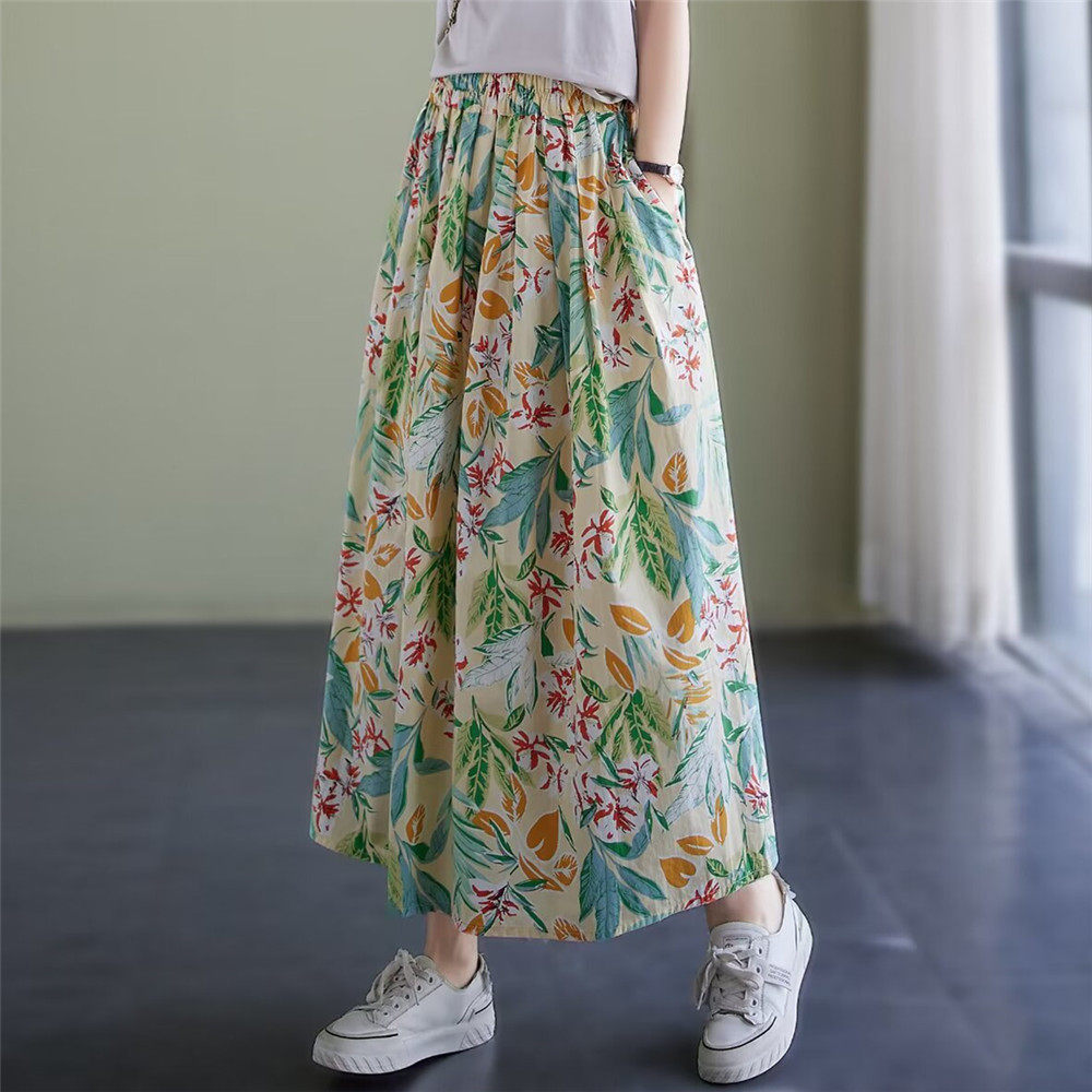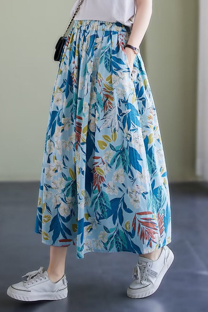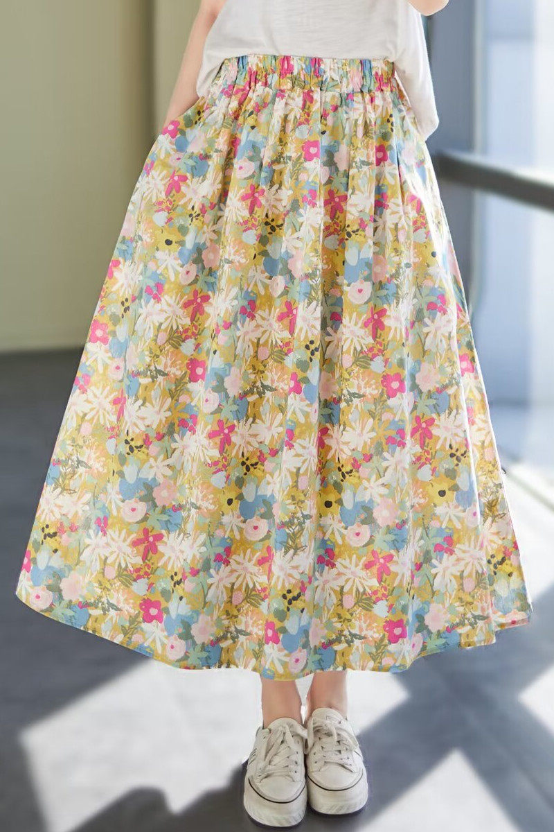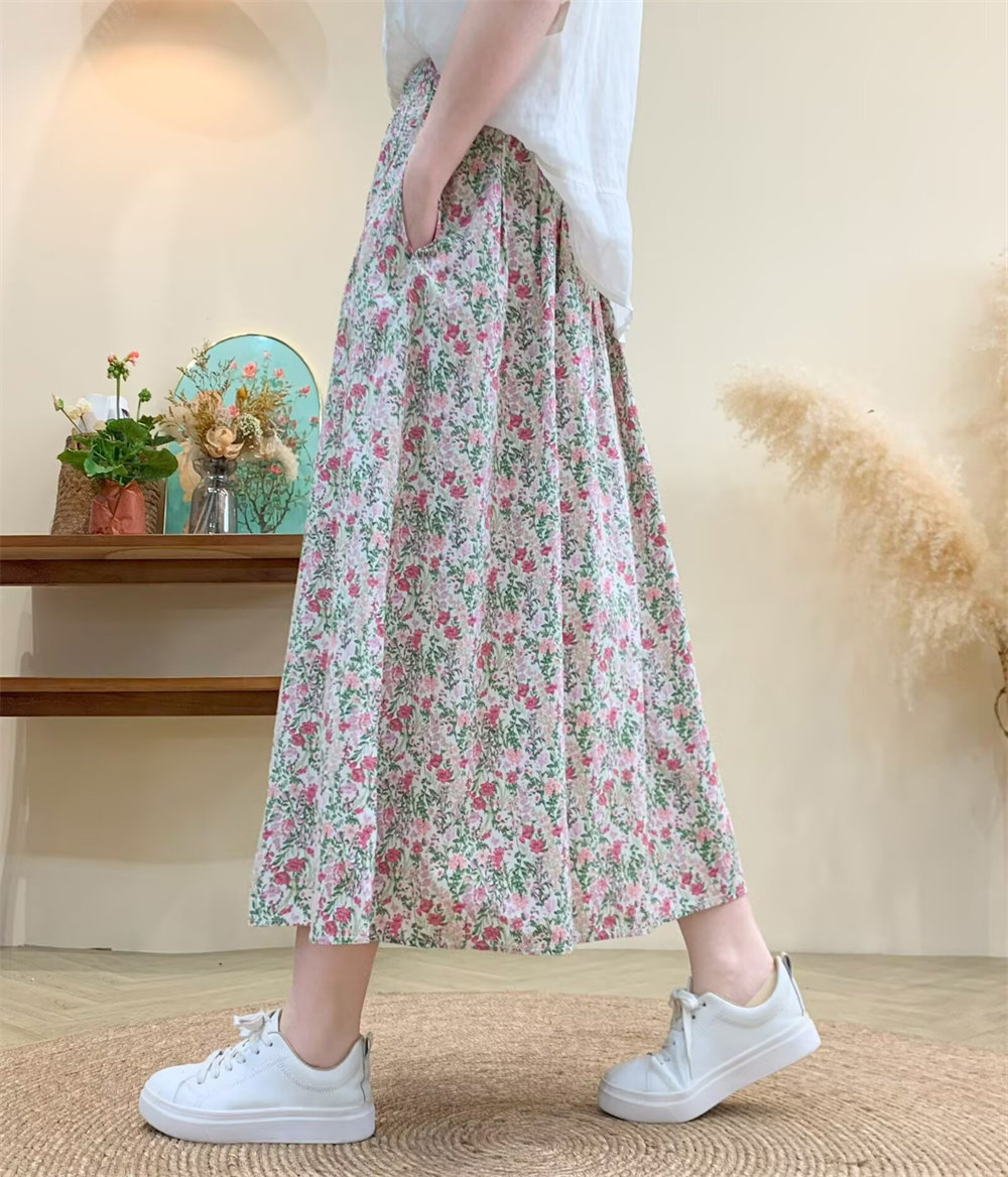 2025 New Literary Pure Cotton Printed Skirt Small Floral Versatile Small High Waist Big Swing A-Line Midi Skirt