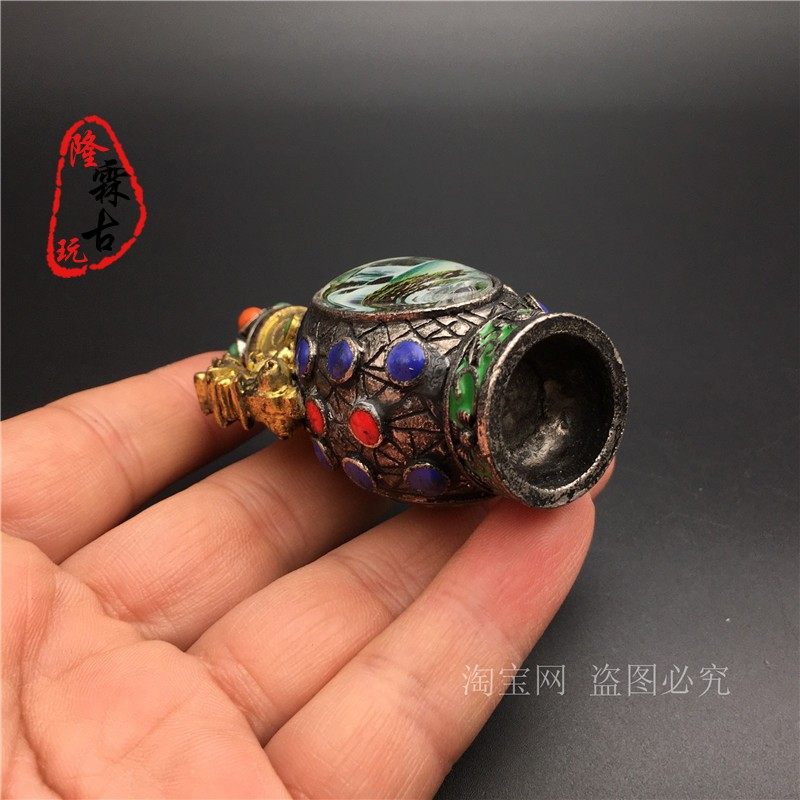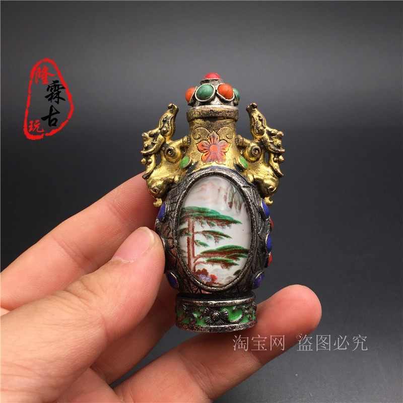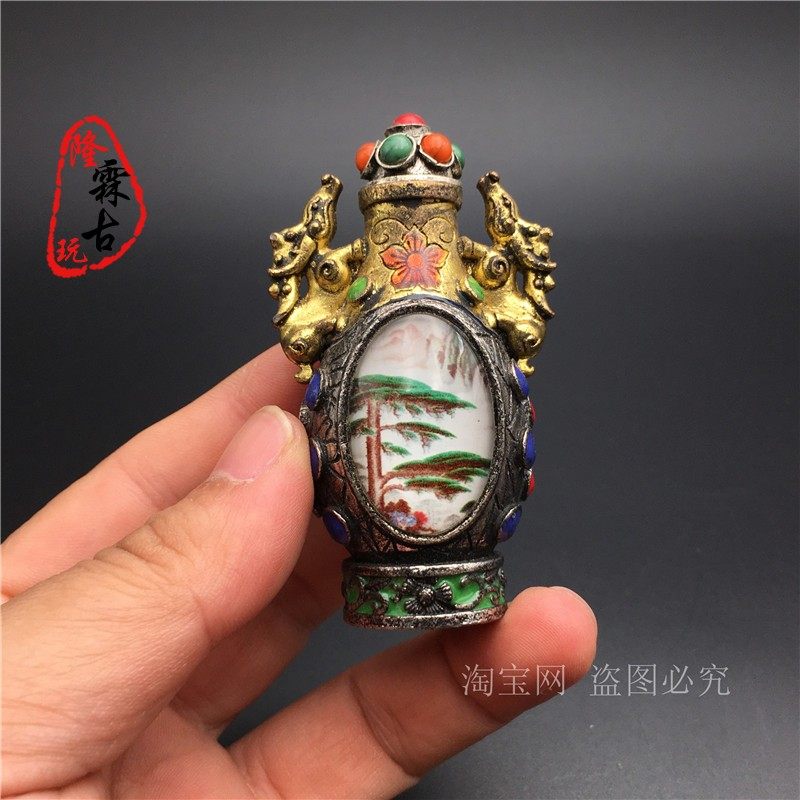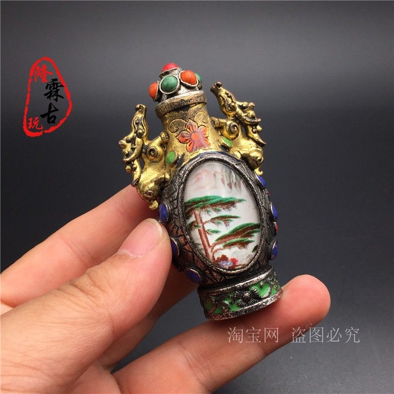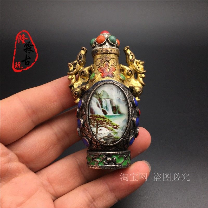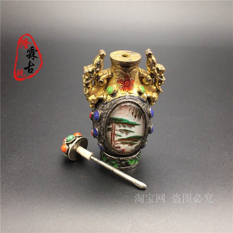 Antiker, antiker Distressed-Kupferstangenlöffel, mittelgroß, Landschaftsmalerei, Schnupftabakflaschenzubehör, praktischer eingelegter Kupferdeckel