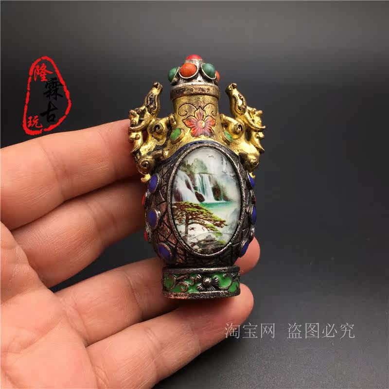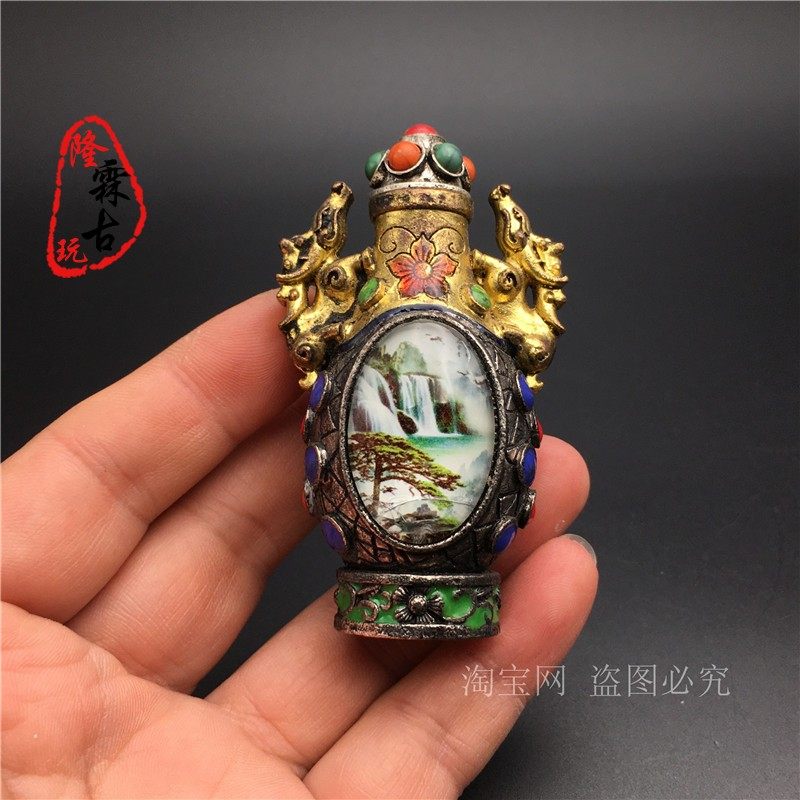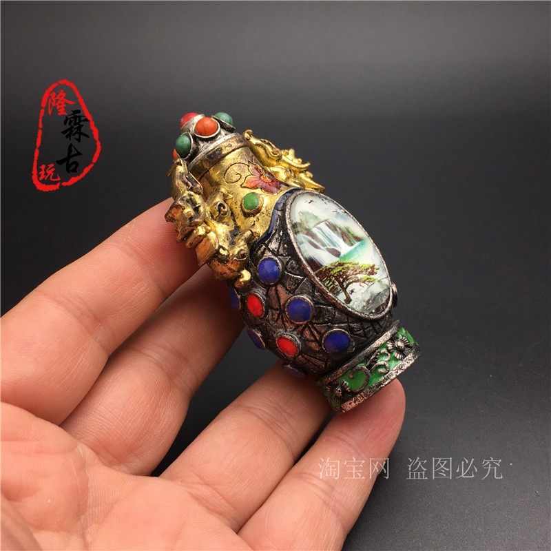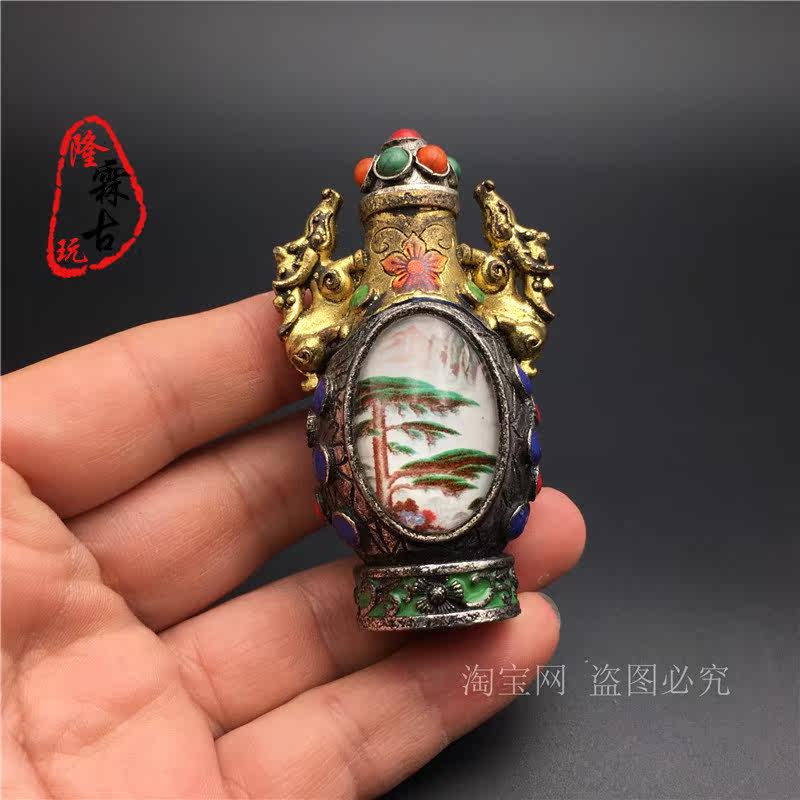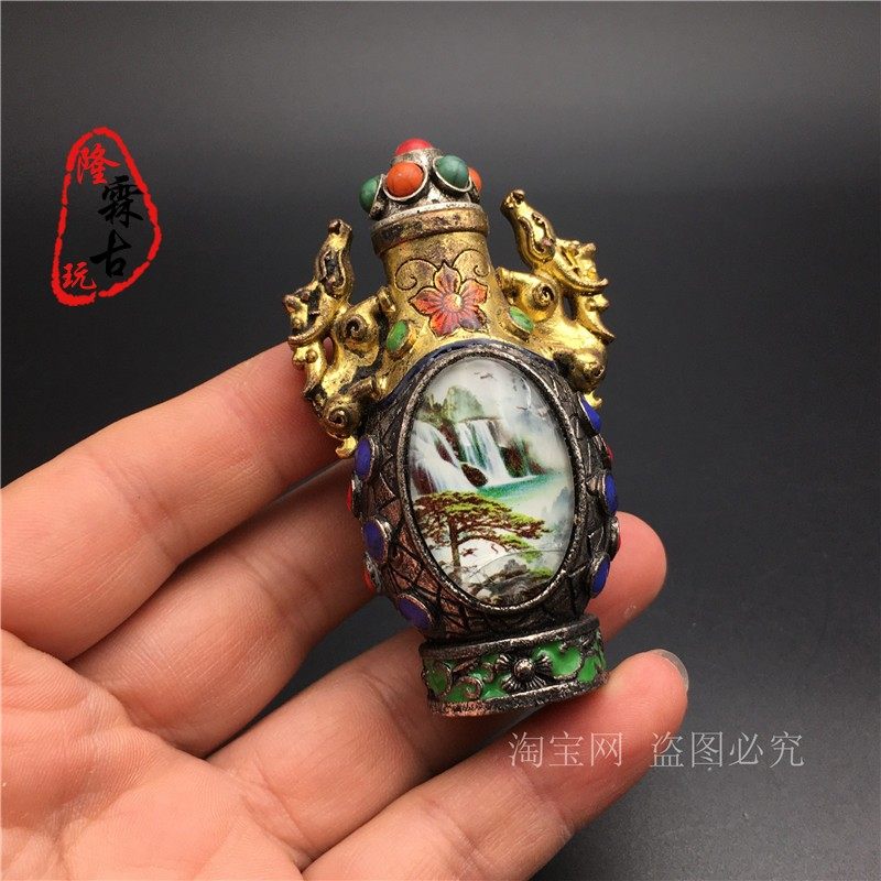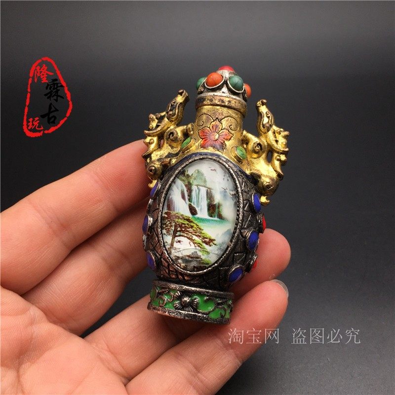 Antiker, antiker Distressed-Kupferstangenlöffel, mittelgroß, Landschaftsmalerei, Schnupftabakflaschenzubehör, praktischer eingelegter Kupferdeckel