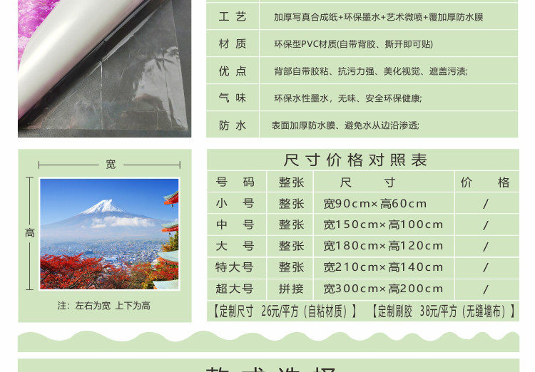 尺寸/加工方式 小号 宽90cm*高60cm-整张,中号 宽150cm*高100cm-整张,大号 宽180cm*高120cm-整张,特大 宽210cm*高140cm-整张,超大 宽300cm*高200cm-三段