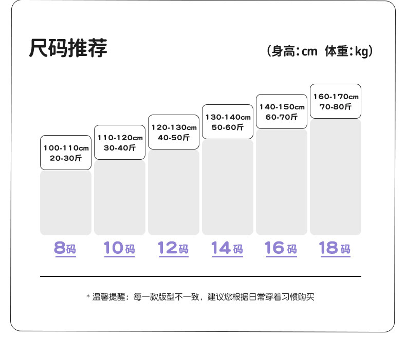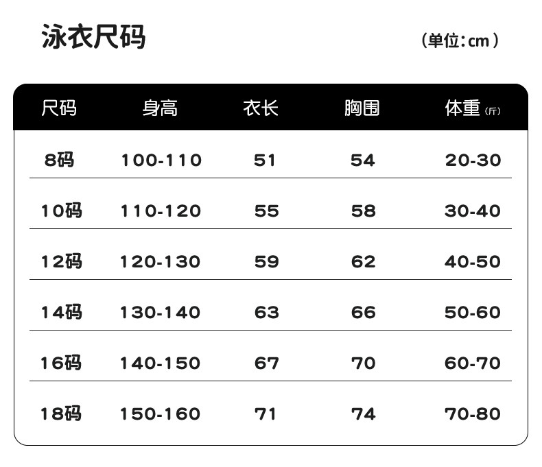 尺码 8码【身高100-110cm 体重15-20kg】Keep新品发售,10码【身高110-120cm 体重20-30kg】收藏加购优先发货,12码【身高120-130cm 体重25-35kg】速干透气不闷热,14码【身高130-140cm 体重30-40kg】高效防晒快乐畅游,16码【身高140-150cm 体重40-50kg】弹性面料舒适不紧绷,18码【身高150-160cm 体重50-60kg】官方正品 教练推荐