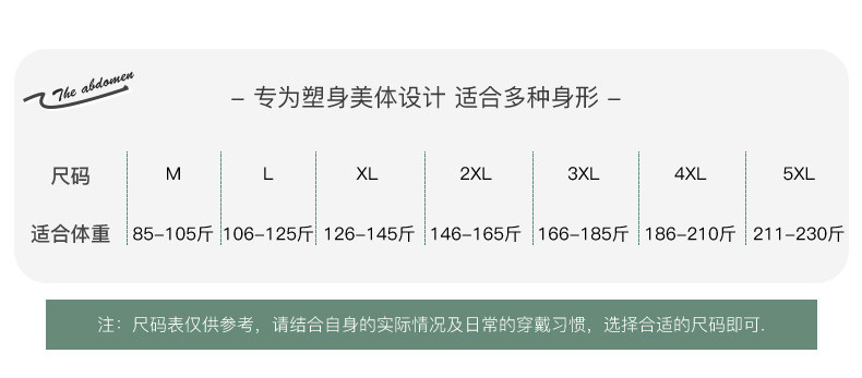 尺码 M(适合85-105斤),L(适合106-125斤),XL(适合126-145斤),XXL(适合146-165斤),3XL(适合166-185斤),4XL(适合186-210斤),5XL(适合211-230斤)