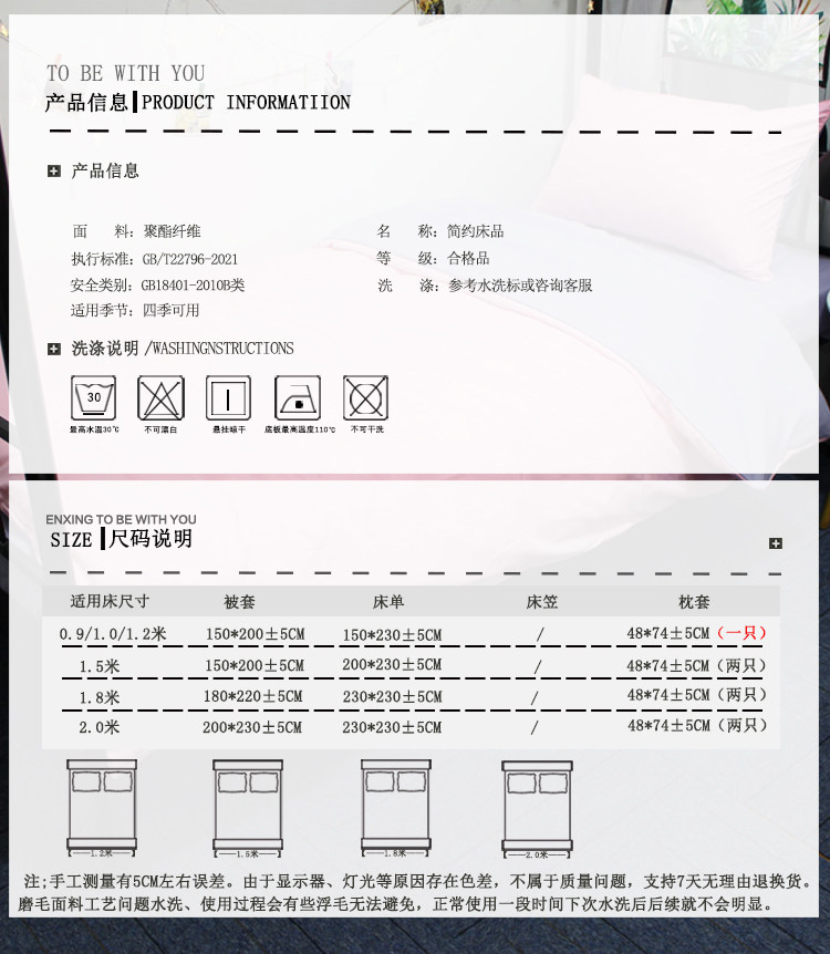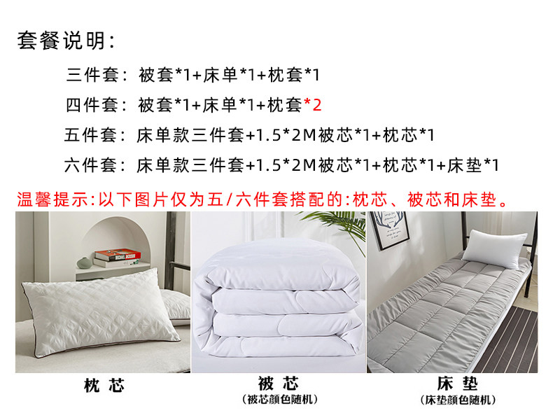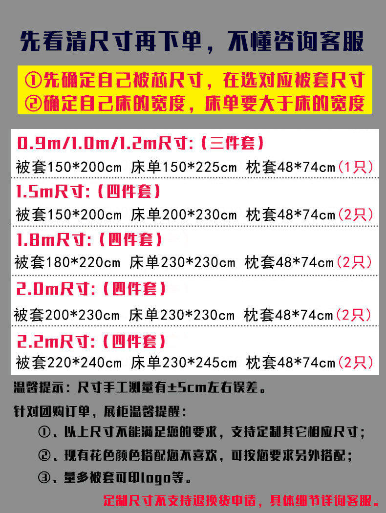 适用床尺寸 0.9m(被套150*200床单150*230枕套1只)三件套,1.0m(被套150*200床单150*230枕套1只)三件套,1.2m(被套150*200床单150*230枕套1只)三件套,1.5m(被套150*200床单200*230枕套2只)四件套,1.8m(被套180*220床单230*230枕套2只)四件套,2.0m(被套200*230床单230*230枕套2只)四件套,2.2m(被套220*240床单230*245枕套2只)四件套,--☆☆☆以下选项可选含芯套餐☆☆☆--,0.9-1.2m单人床五件套(三件套+1.5m/4斤春秋被+枕芯1只),0.9-1.2m单人床五件套(三件套+1.5m/6斤冬被+枕芯1只),0.9-1.2m单人床五件套(三件套+1.5m/8斤加厚冬被+枕芯1只),0.9-1.2m单人床五件套(三件套+1.5m/3斤夏被+5斤春秋被子母扣被芯+枕芯1只),0.9m床六件套(三件套+1.5m/4斤春秋被+0.9m床垫+枕芯),0.9m床六件套(三件套+1.5m/6斤冬被+0.9m床垫+枕芯),0.9m床六件套(三件套+1.5m/8斤加厚冬被+0.9m床垫+枕芯),0.9m床六件套(三件套+1.5m/3斤夏被+5斤春秋被子母扣被芯+0.9m床垫+枕芯),1.0m床六件套(三件套+1.5m/4斤春秋被+1.0m床垫+枕芯),1.0m床六件套(三件套+1.5m/6斤冬被+1.0m床垫+枕芯),1.0m床六件套(三件套+1.5m/8斤加厚冬被+1.0m床垫+枕芯),1.0m床六件套(三件套+1.5m/3斤夏被+5斤春秋被子母扣被芯+1.0m床垫+枕芯),1.2m床六件套(三件套+1.5m/4斤春秋被+1.2m床垫+枕芯),1.2m床六件套(三件套+1.5m/6斤冬被+1.2m床垫+枕芯),1.2m床六件套(三件套+1.5m/8斤加厚冬被+1.2m床垫+枕芯),1.2m床六件套(三件套+1.5m/3斤夏被+5斤春秋被子母扣被芯+1.2m床垫+枕芯)