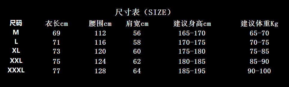 China (cm) 165 / 88-90 170 / 96-98 175 / 108-110 180 / 118-122 185 / 126-130