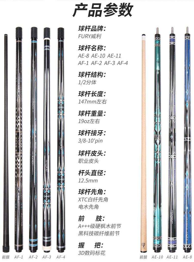 FURY威利AE大风暴台球杆光把大头杆中式黑八球杆威力AF黑科技球杆