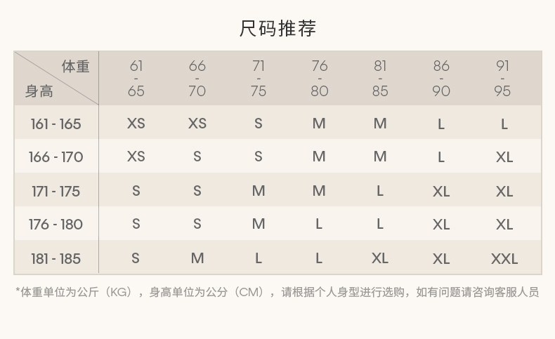 China (cm) 160-165/84-86 165-170 / 88-90 167-172 / 92-96 168-173 / 98-102 170-176 / 106-110