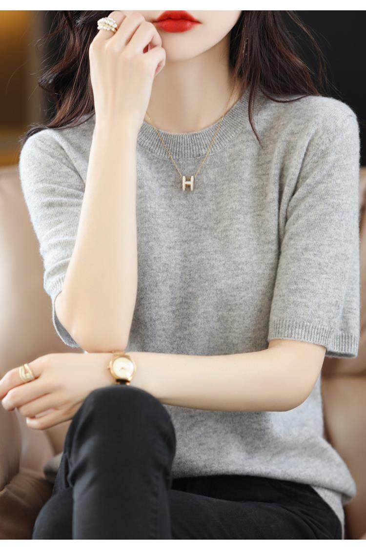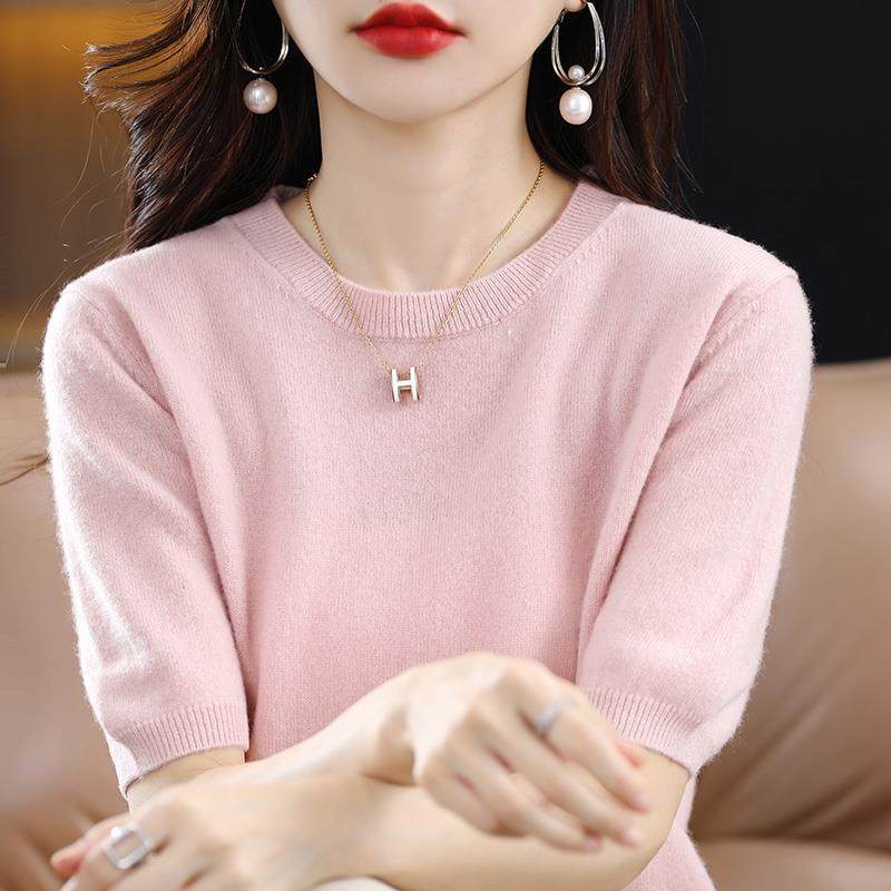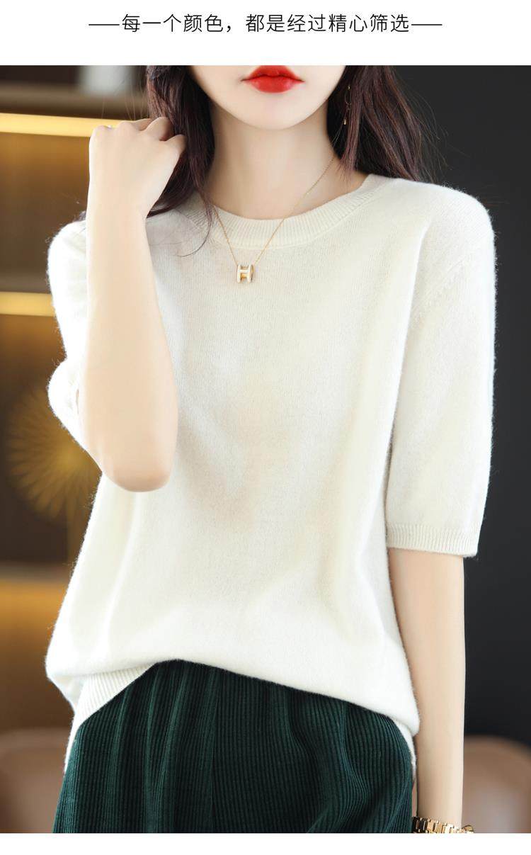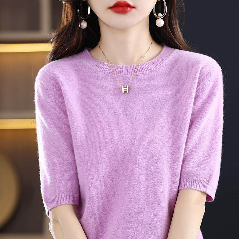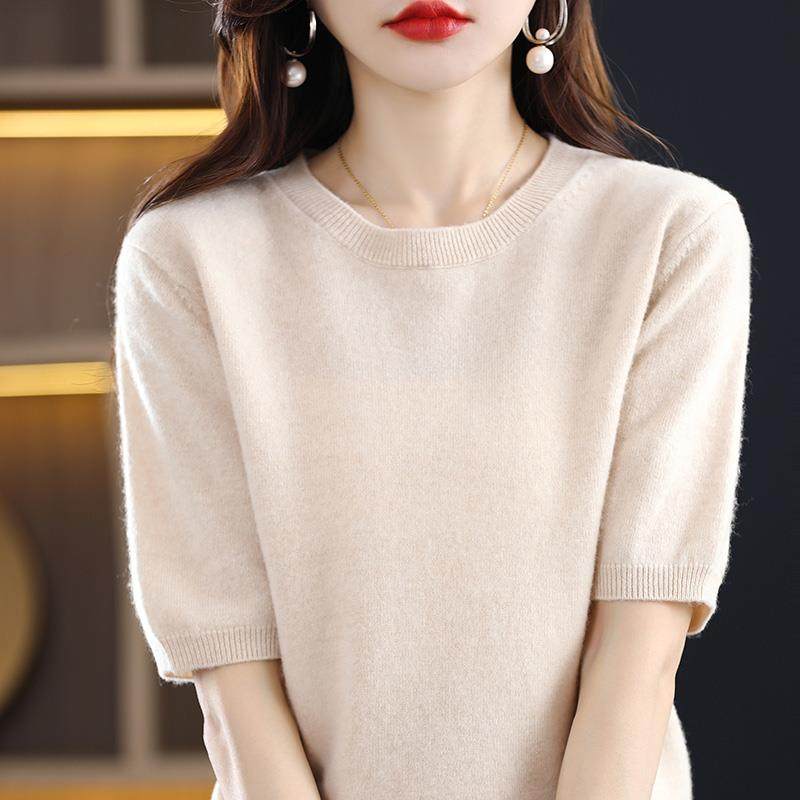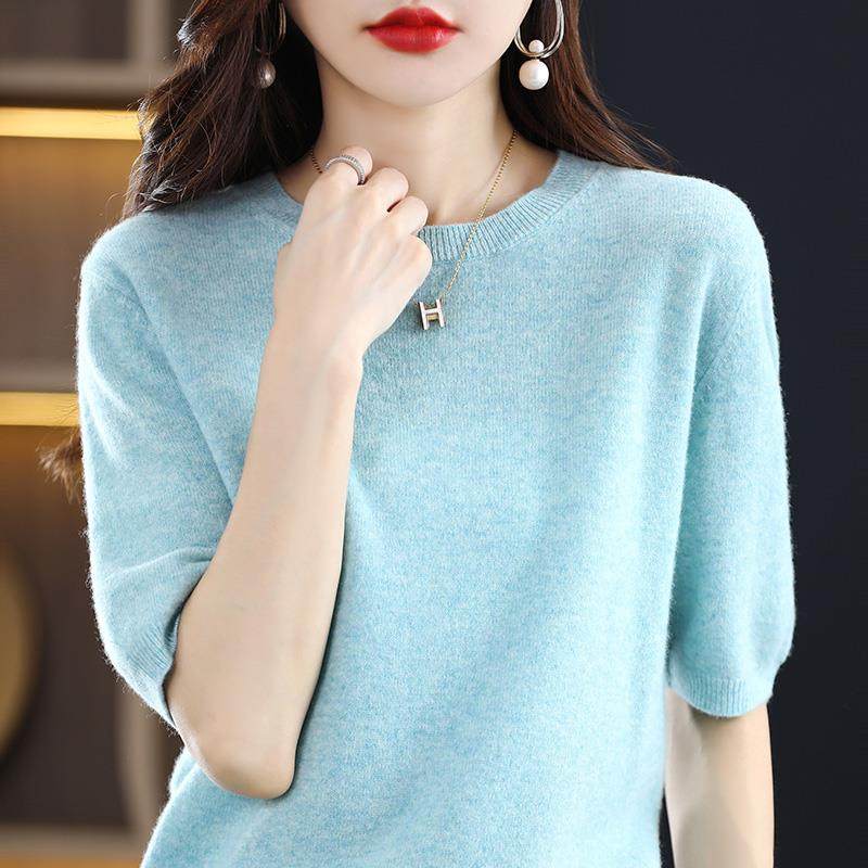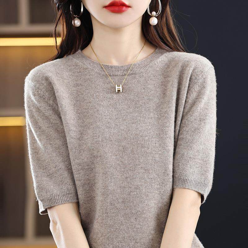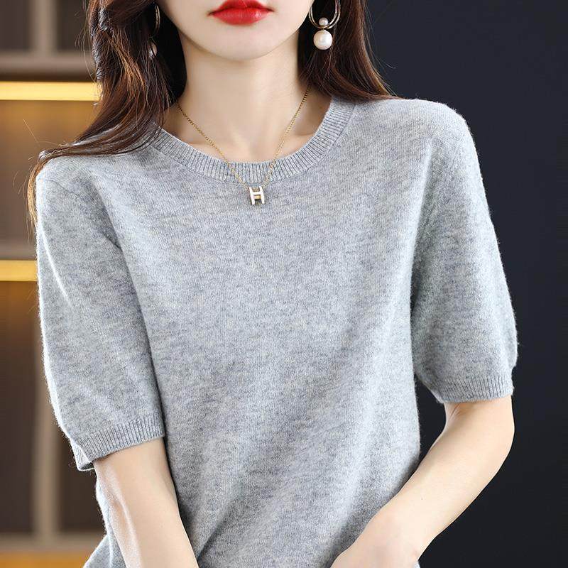 Otoño e invierno 2022 Cuello redondo Cachemira de manga corta Suéter suelto para mujer Camisa de fondo fino 100% lana pura tejida Mujer de manga media