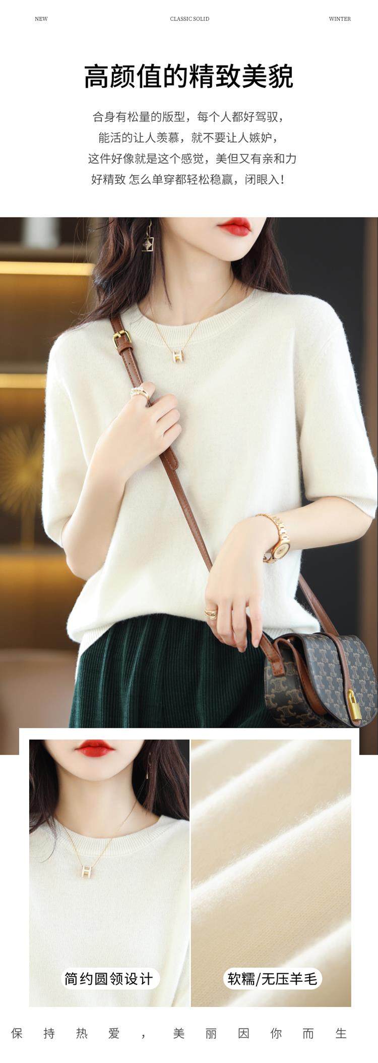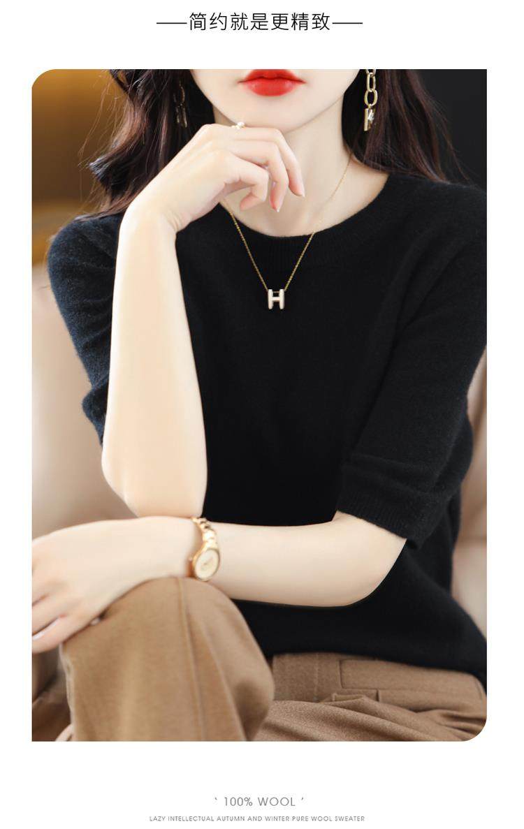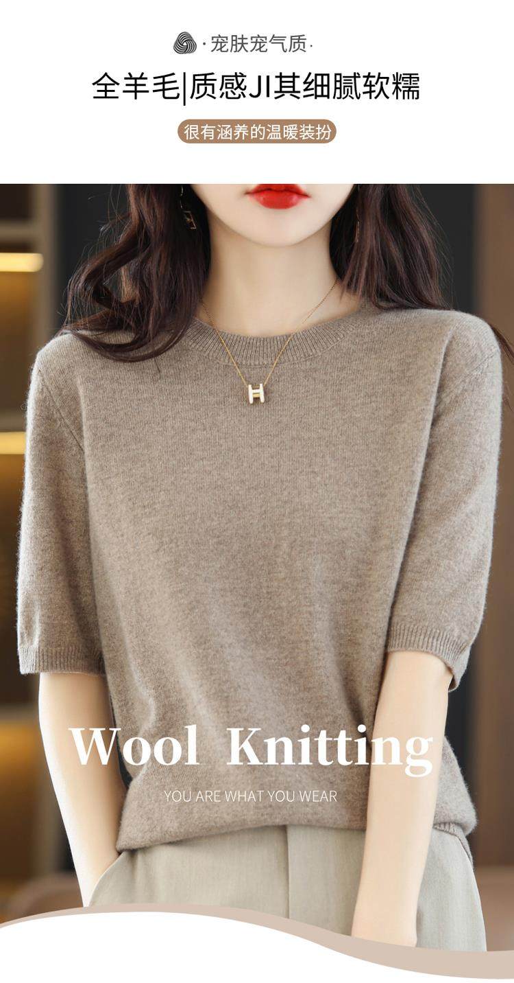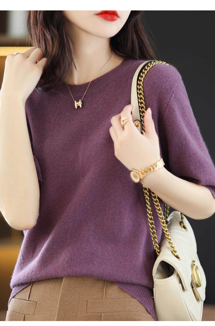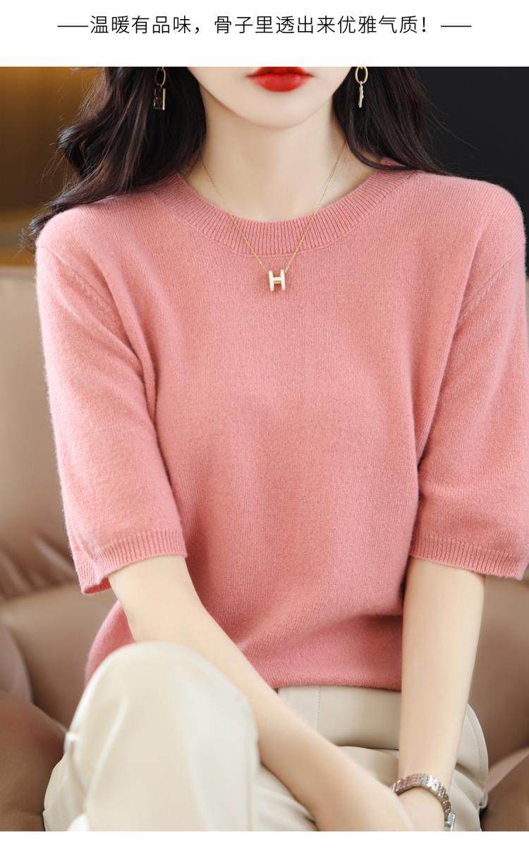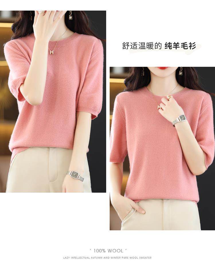 Otoño e invierno 2022 Cuello redondo Cachemira de manga corta Suéter suelto para mujer Camisa de fondo fino 100% lana pura tejida Mujer de manga media