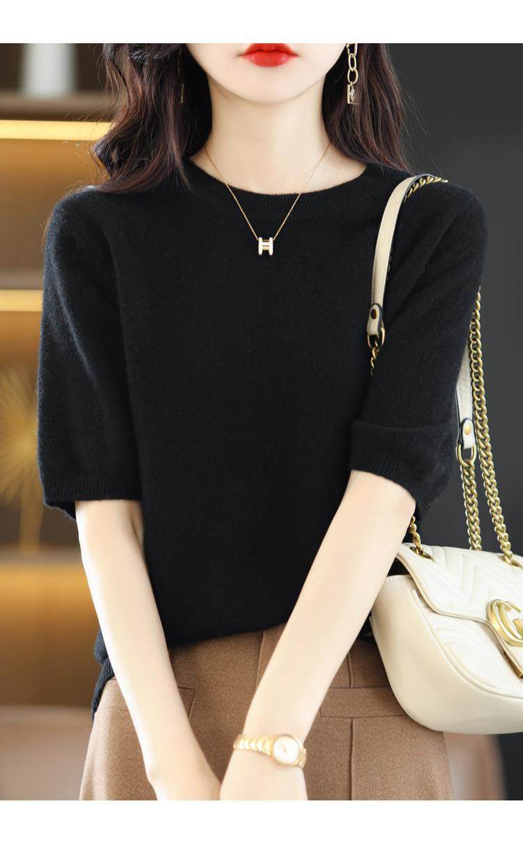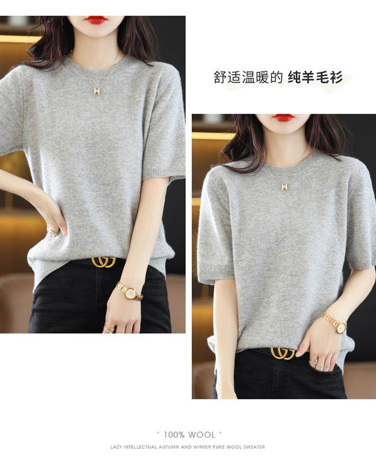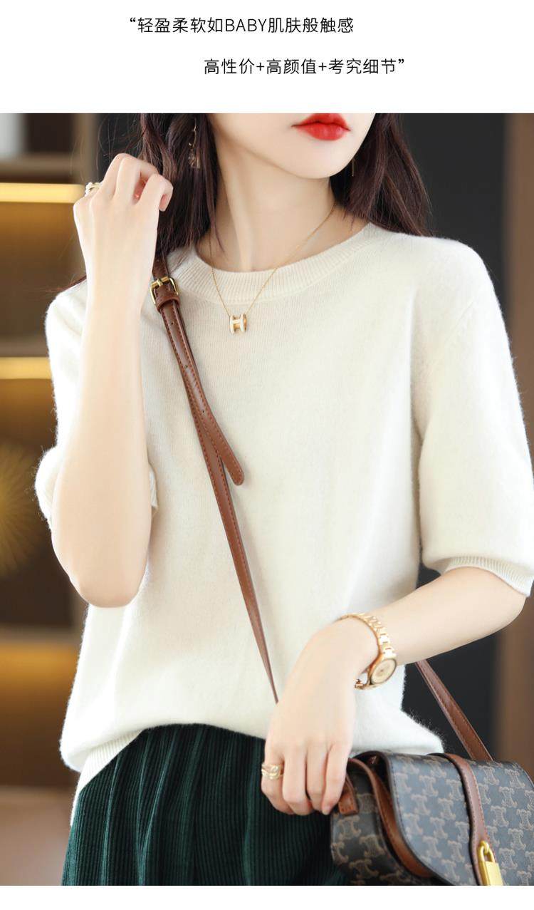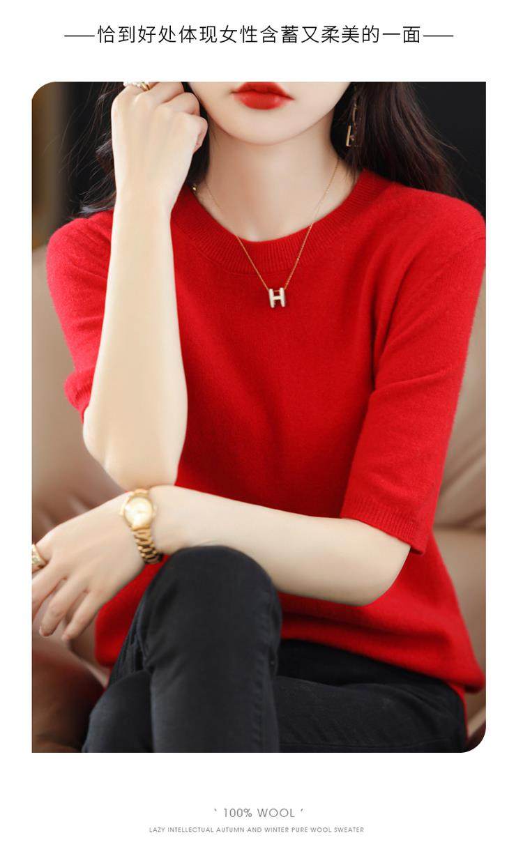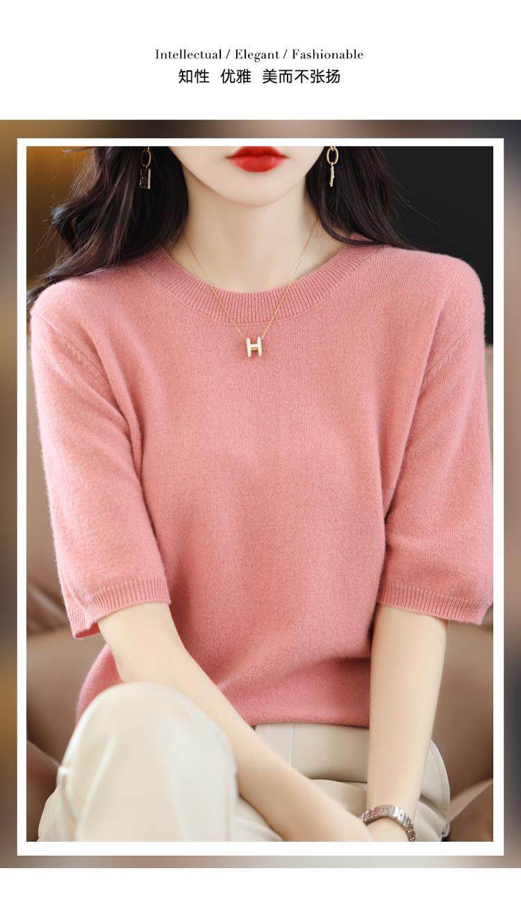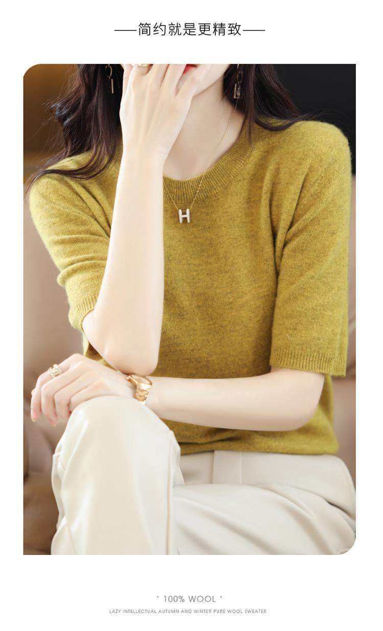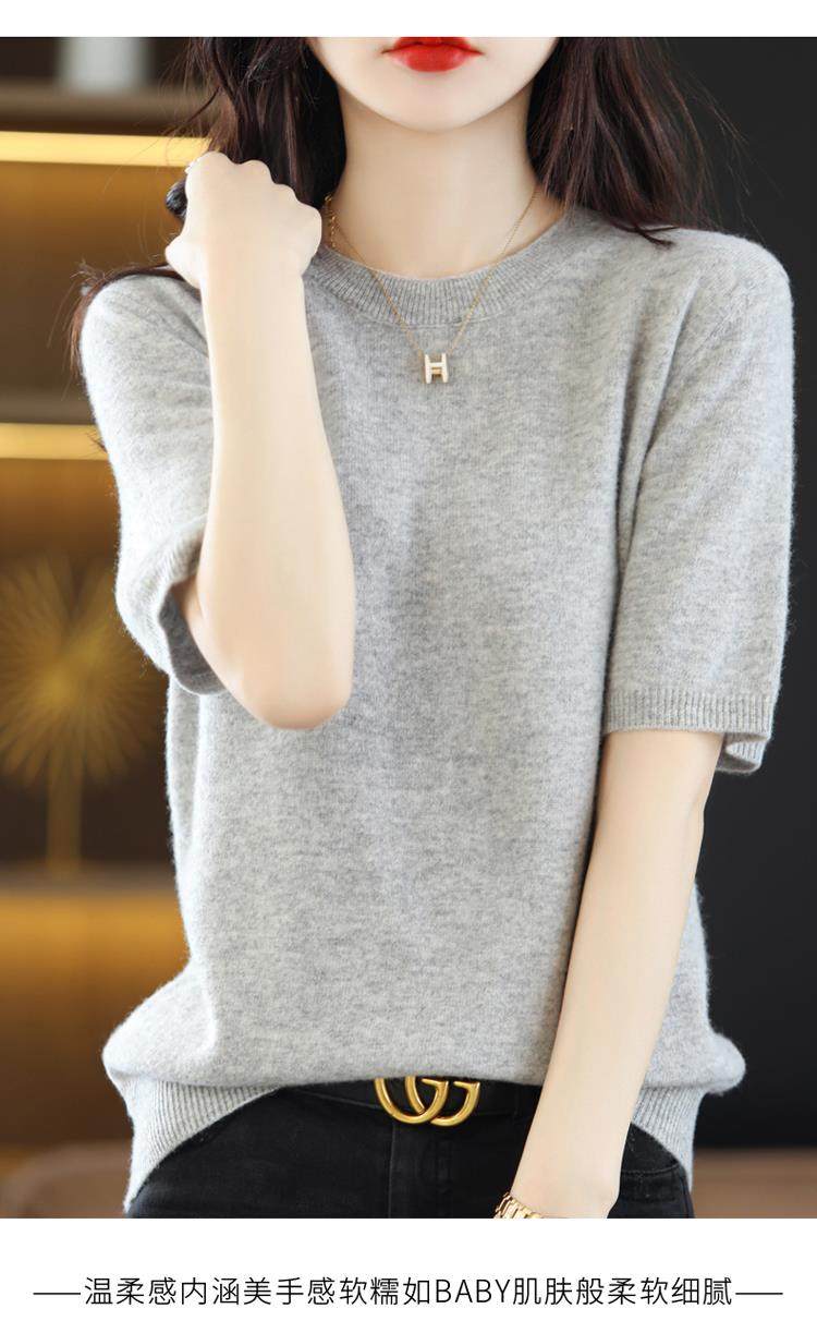 Otoño e invierno 2022 Cuello redondo Cachemira de manga corta Suéter suelto para mujer Camisa de fondo fino 100% lana pura tejida Mujer de manga media