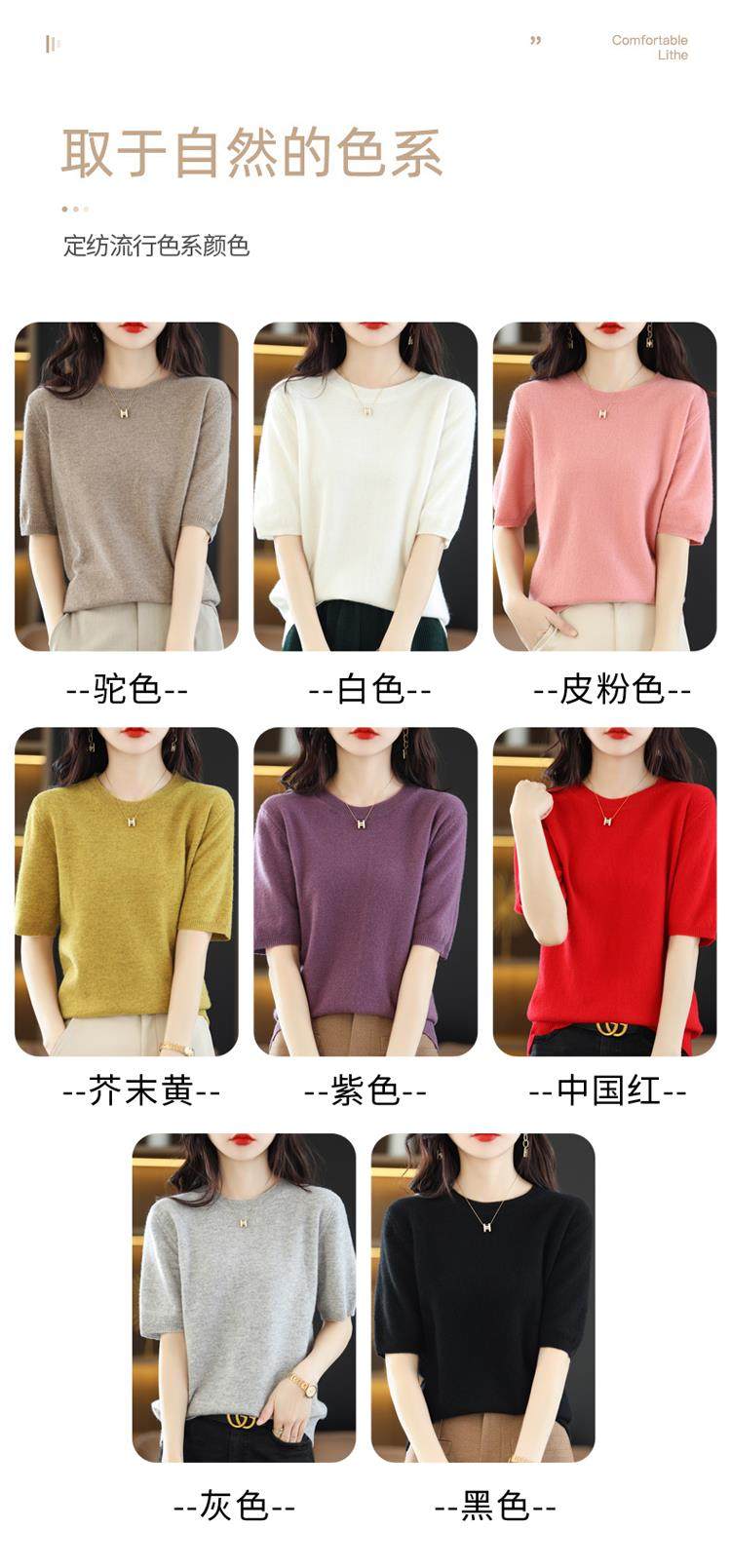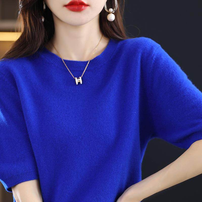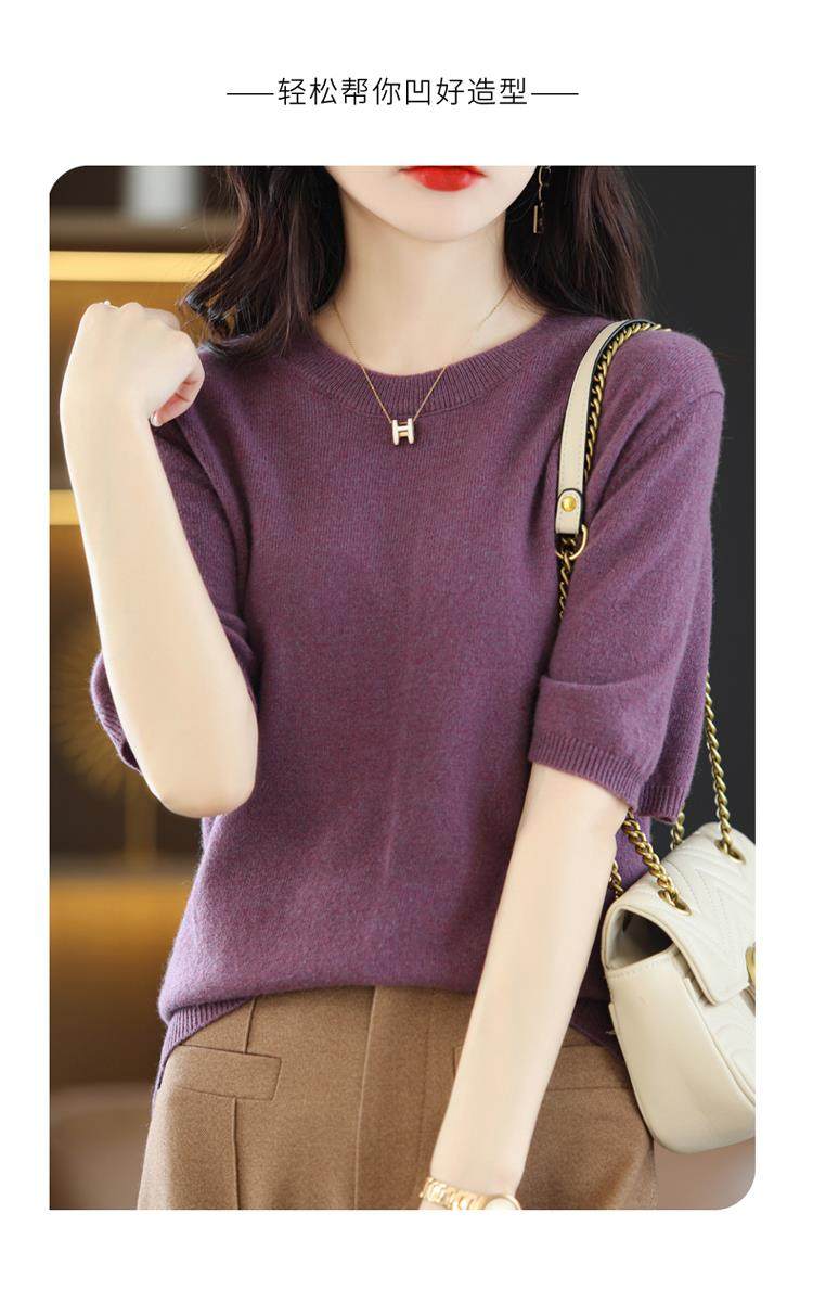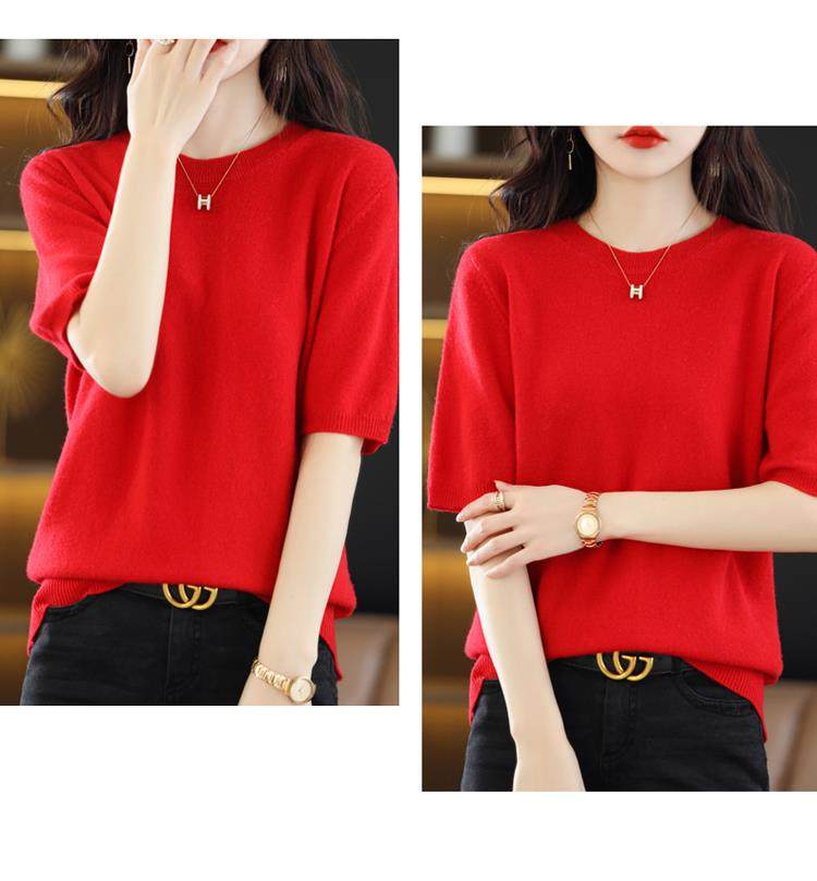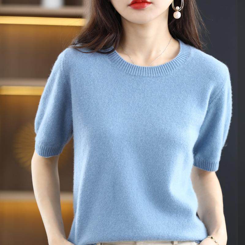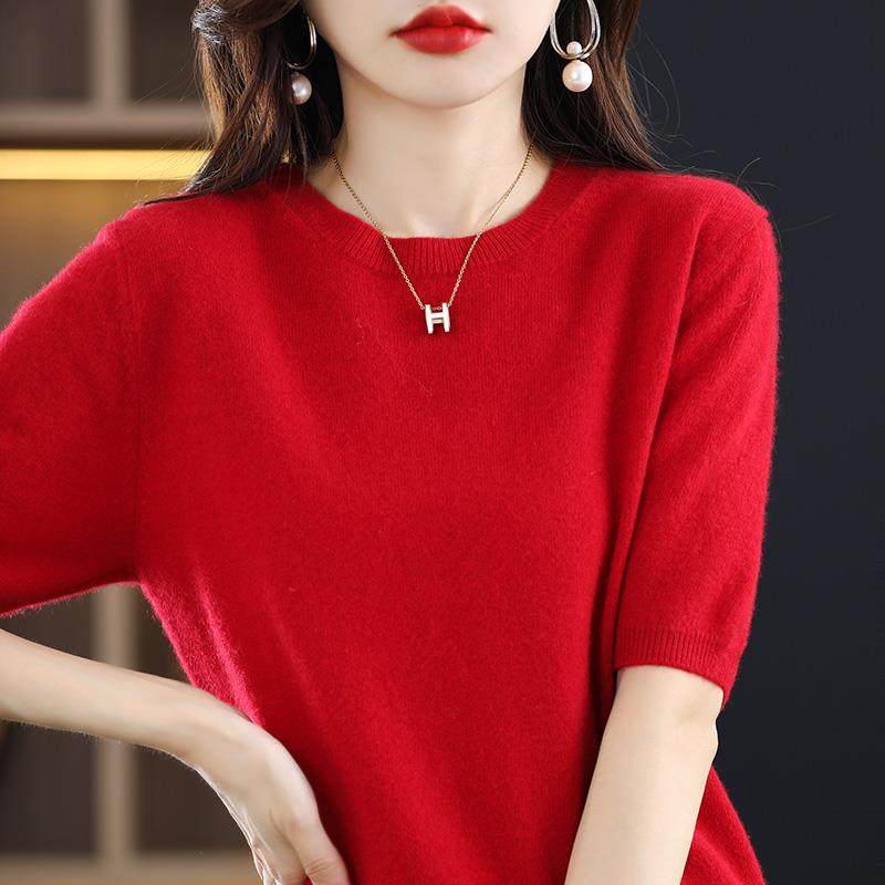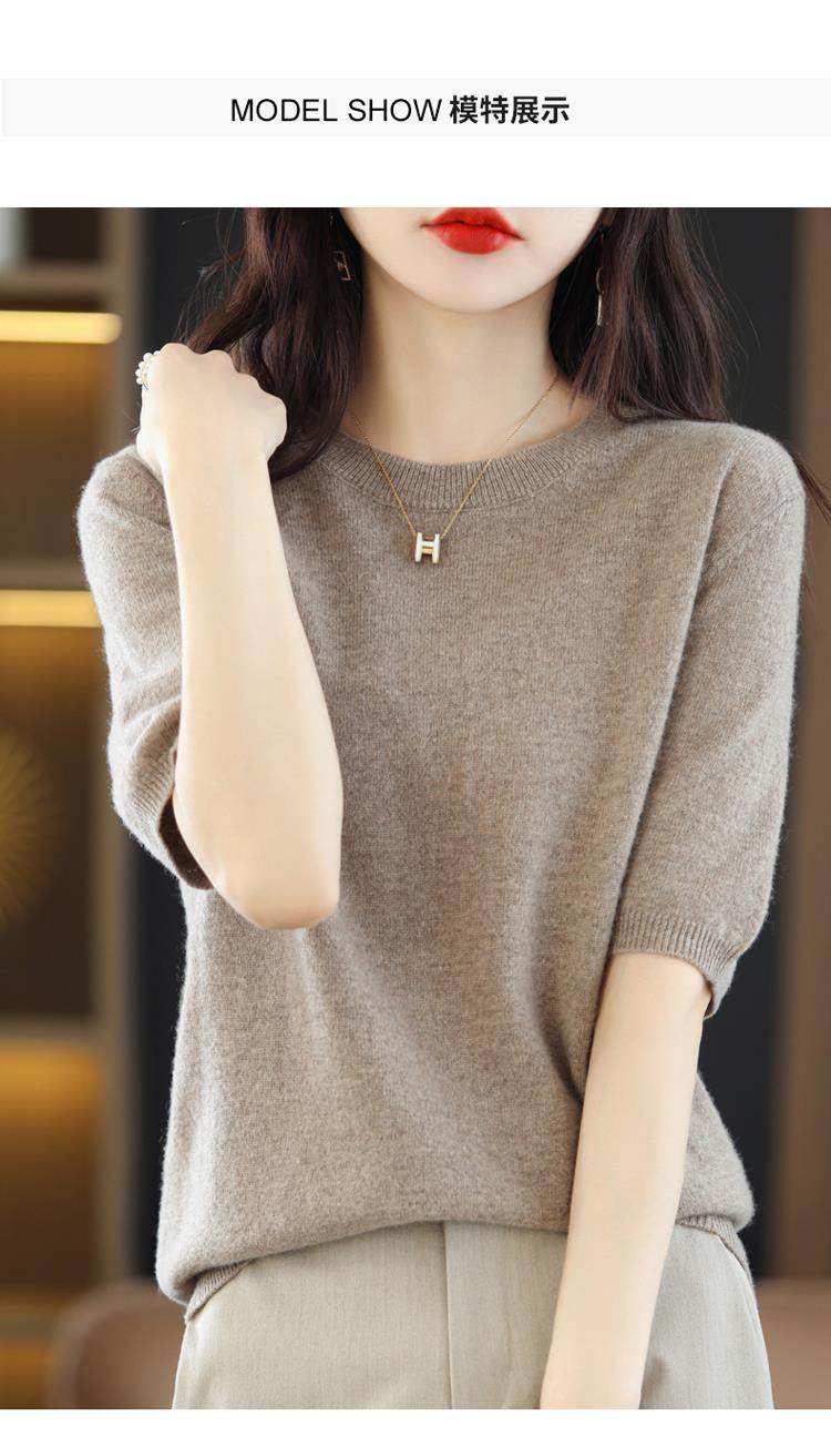 Otoño e invierno 2022 Cuello redondo Cachemira de manga corta Suéter suelto para mujer Camisa de fondo fino 100% lana pura tejida Mujer de manga media