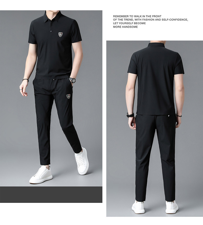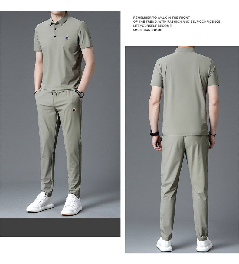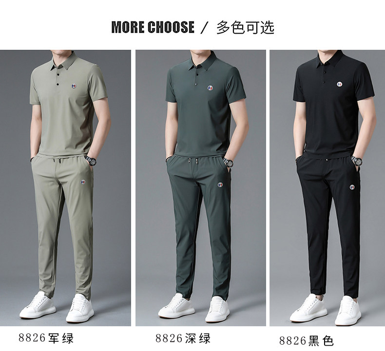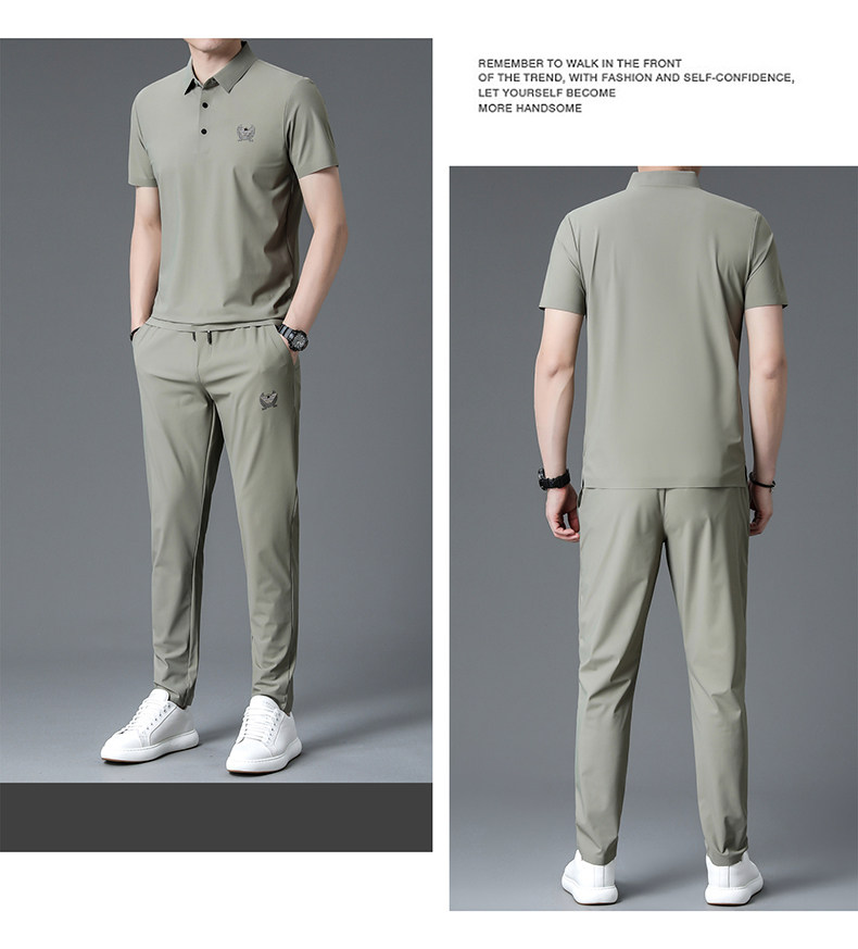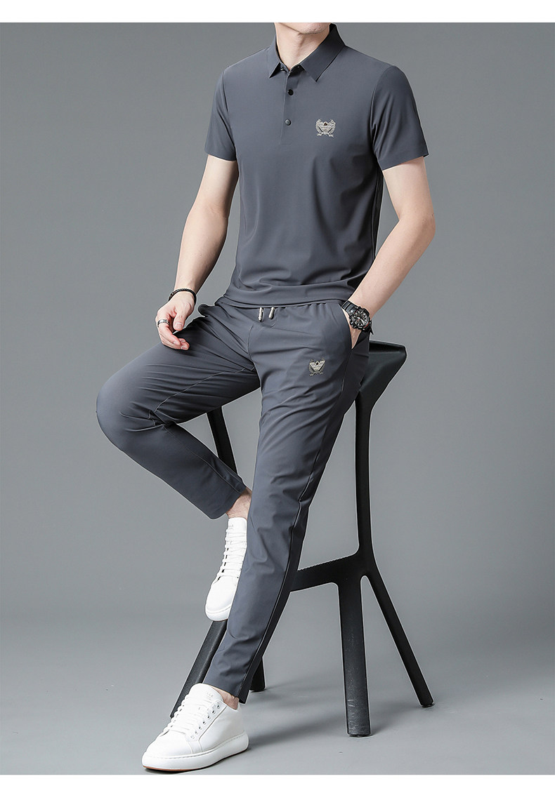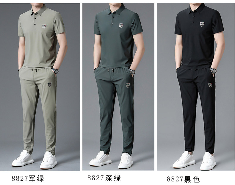 皮尔卡丹高档男士桑蚕丝套装夏季短袖时尚两件套无痕休闲运动套装