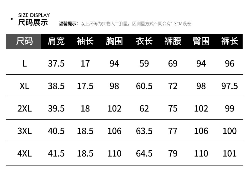 尺码 L(适合100斤-110斤 舒适透气,不掉色,送运费险),XL(适合110斤-120斤 舒适透气,不掉色,送运费险),2XL(适合120斤-130斤 舒适透气,不掉色,送运费险),3XL(适合130斤-145斤 舒适透气,不掉色,送运费险),4XL(适合145斤-160斤 舒适透气,不掉色,送运费险)