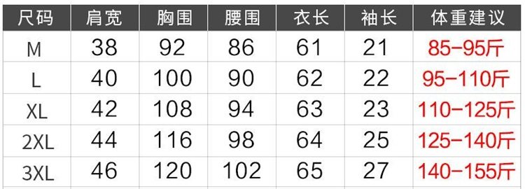 尺码 M 85-95斤,L 95-105,XL 106-125,2XL 126-140,3XL 141-155