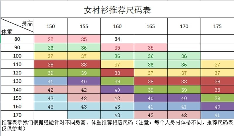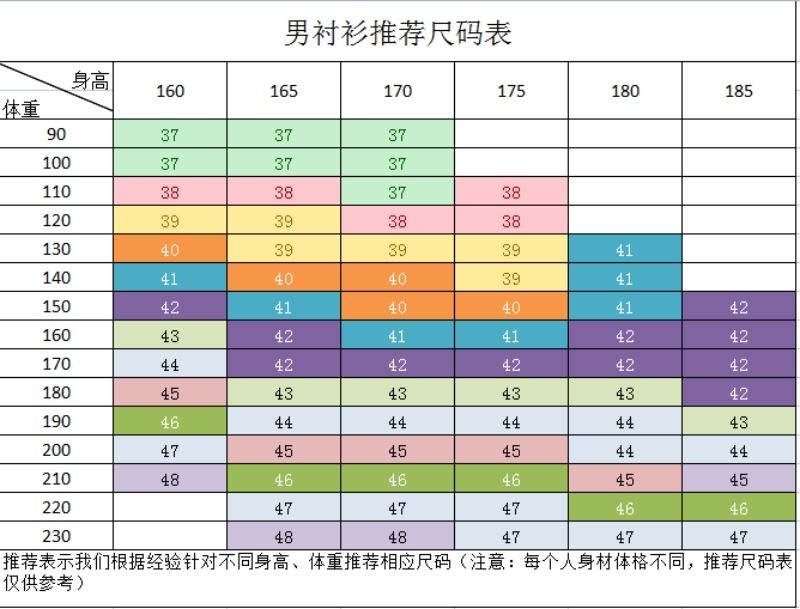 China (cm) 160-165/84-86 165-170 / 88-90 167-172 / 92-96 168-173 / 98-102 170-176 / 106-110