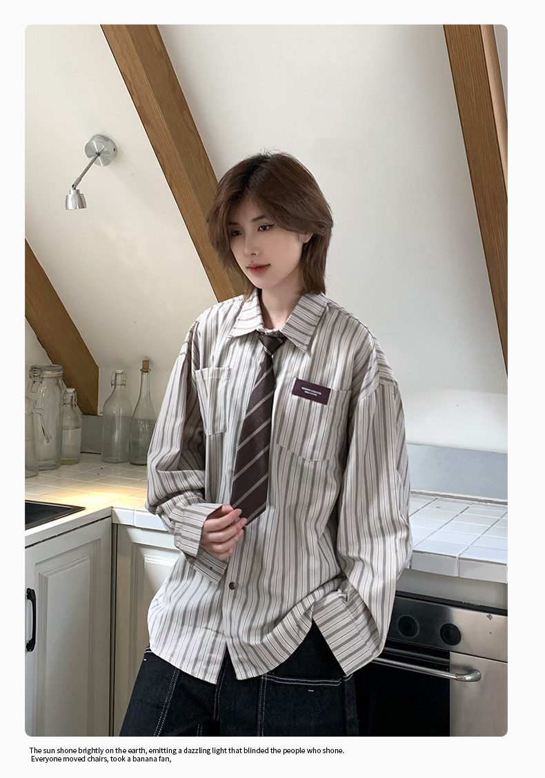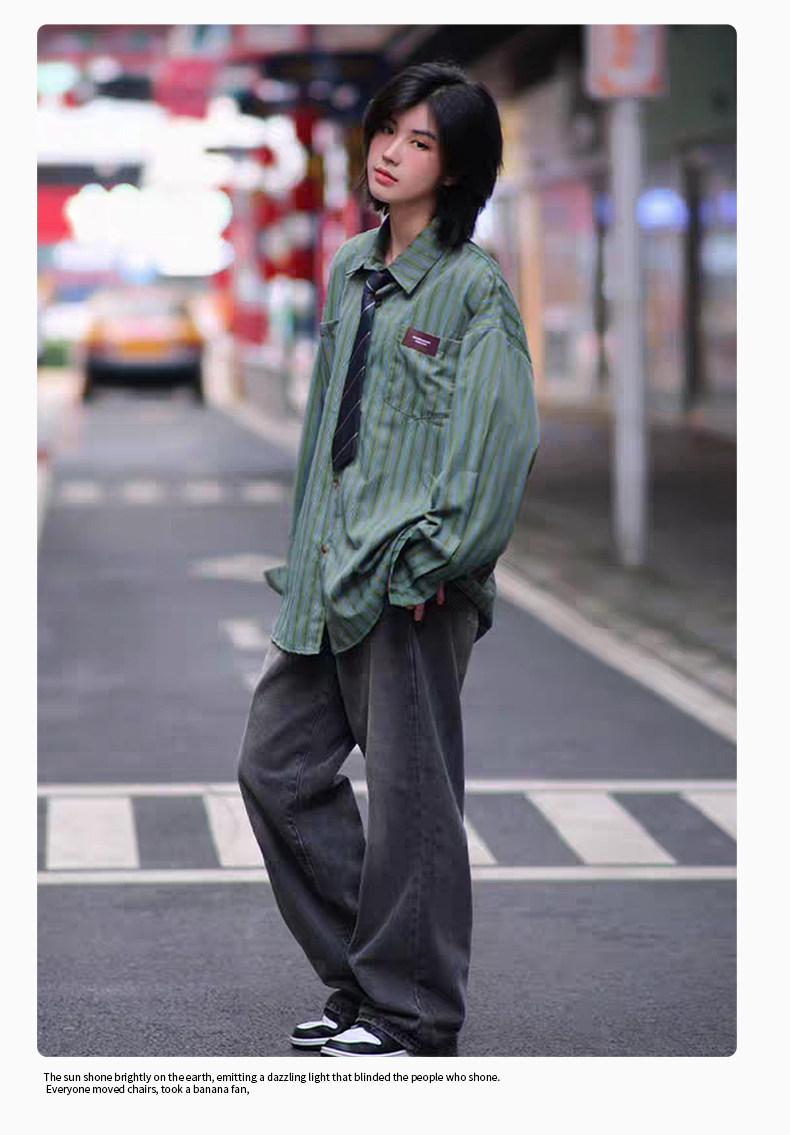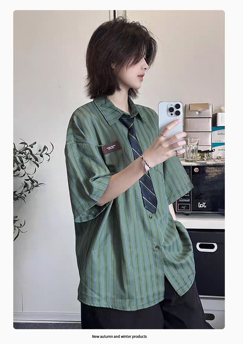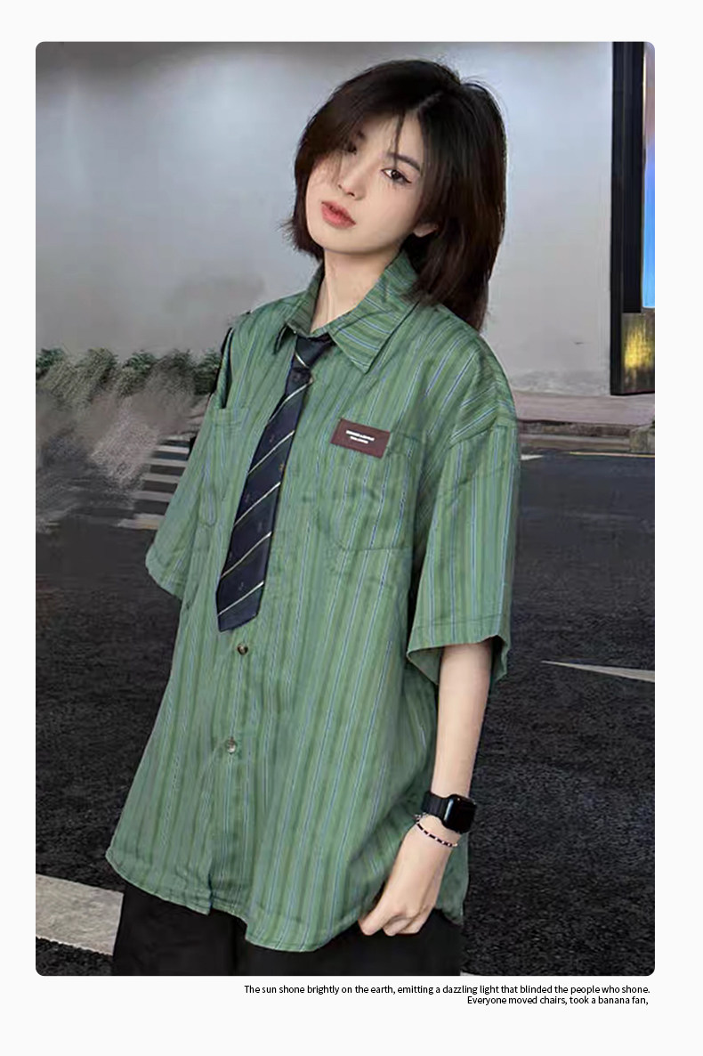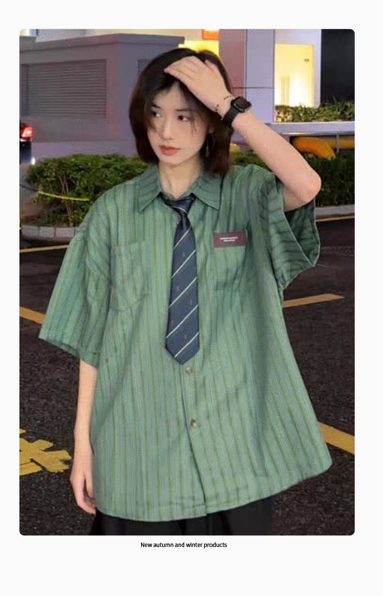 Ja1 Never Stays up Late Japanese Retro Hong Kong Style Striped Shirt Women's Short-Sleeved Youthful Unisex Loose Top Men's