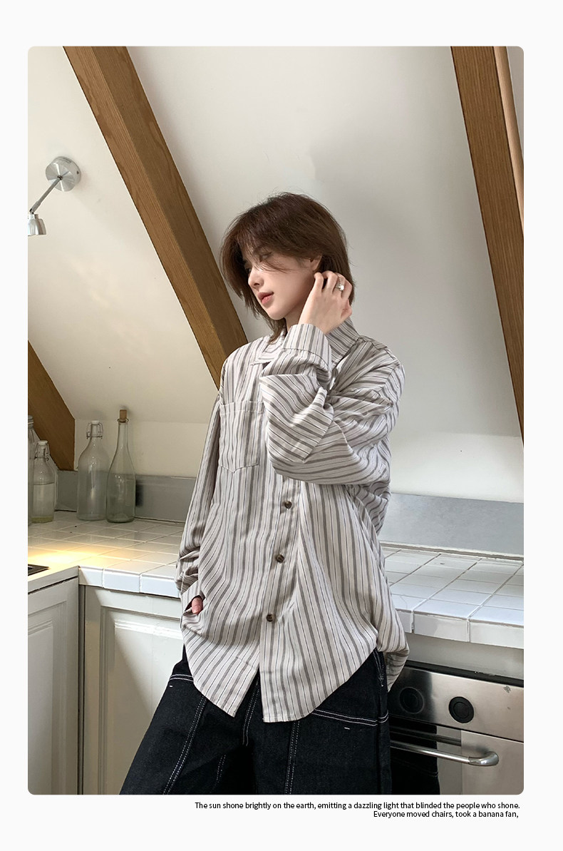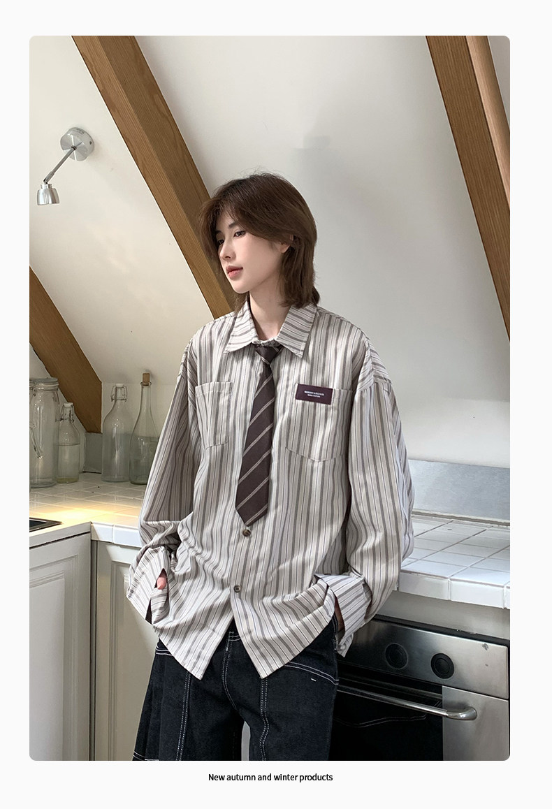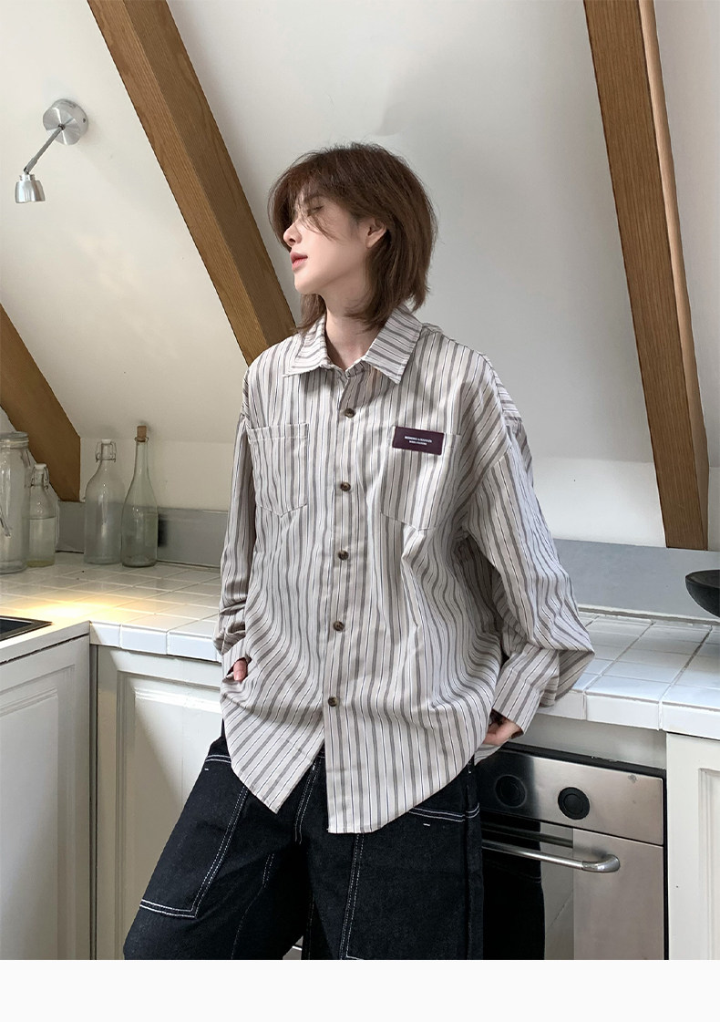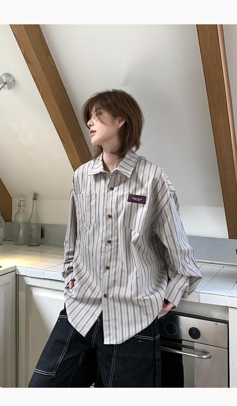 Ja1 Never Stays up Late Japanese Retro Hong Kong Style Striped Shirt Women's Short-Sleeved Youthful Unisex Loose Top Men's
