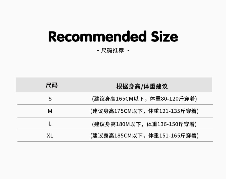 China (cm) 165 / 88-90 170 / 96-98 175 / 108-110 180 / 118-122 185 / 126-130